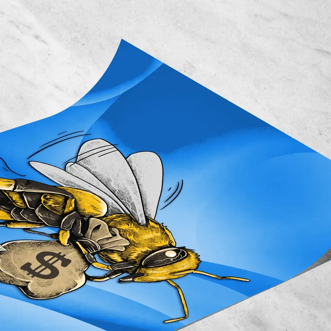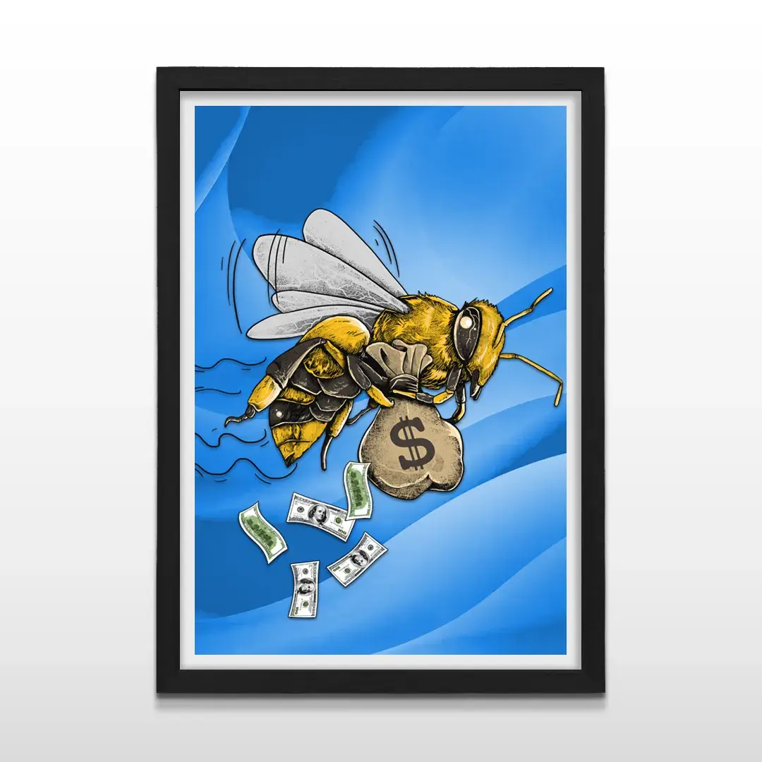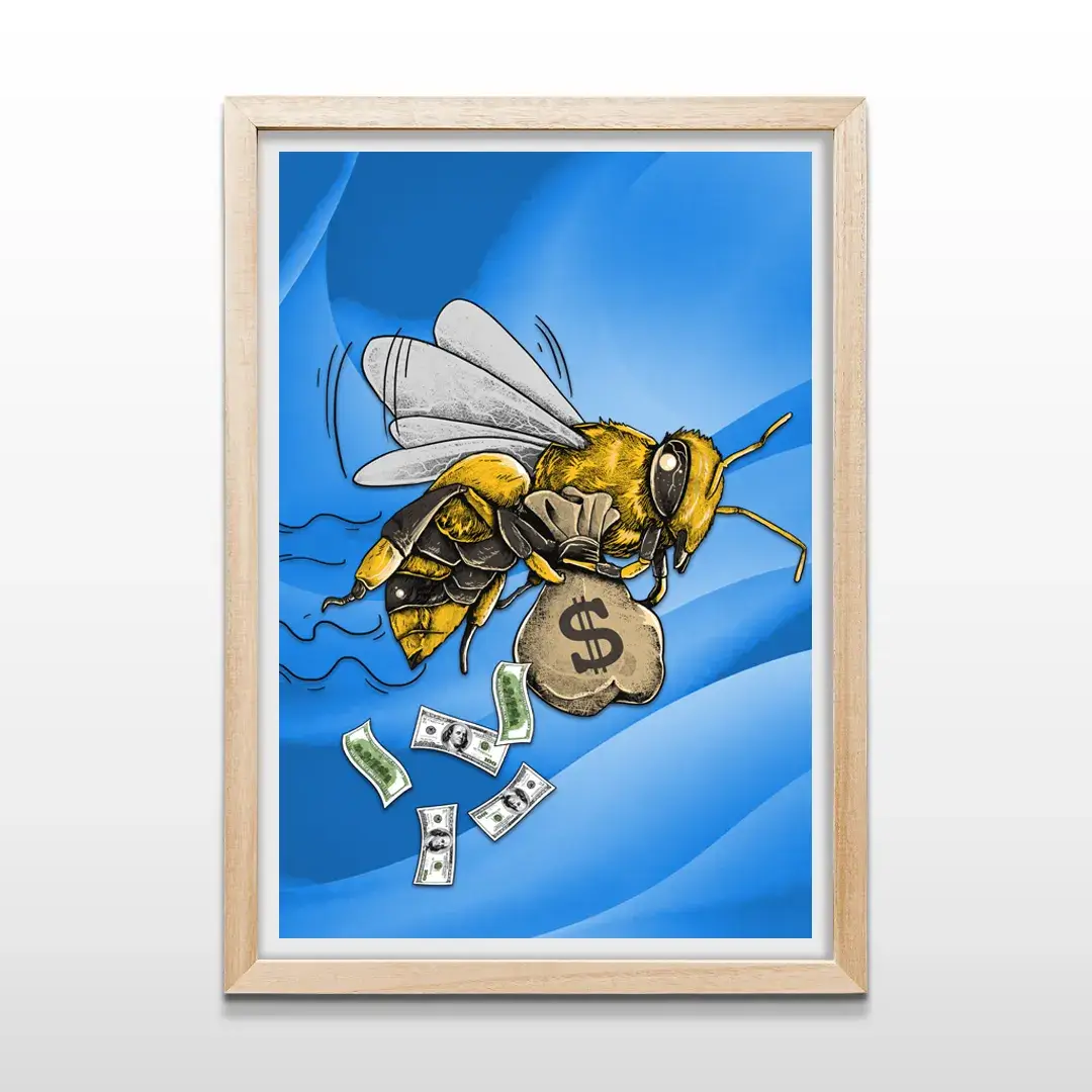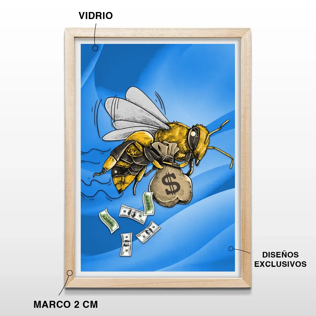 El cuadro decorativo Abeja Trabajadora es una obra de arte digital contemporáneo que simboliza la disciplina, la perseverancia y la generación de riqueza. Presenta una ilustración detallada de una abeja en pleno vuelo sobre un fondo azul dinámico, transportando una bolsa de dinero y dejando caer billetes de dólar, representando la conexión entre esfuerzo constante y abundancia.