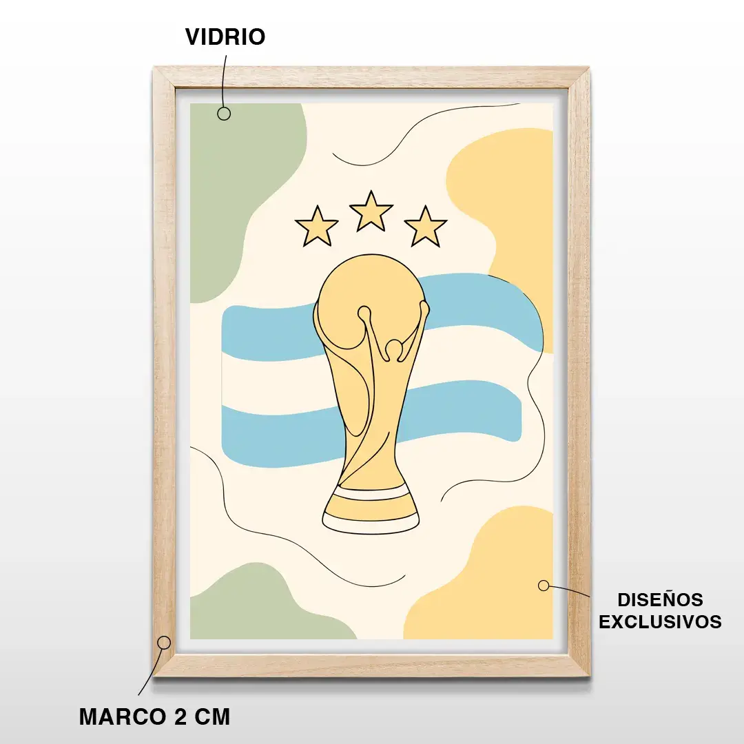 Pensado para quienes buscan comprar cuadros decorativos de fútbol en Argentina, este cuadro minimalista de la selección argentina campeona.