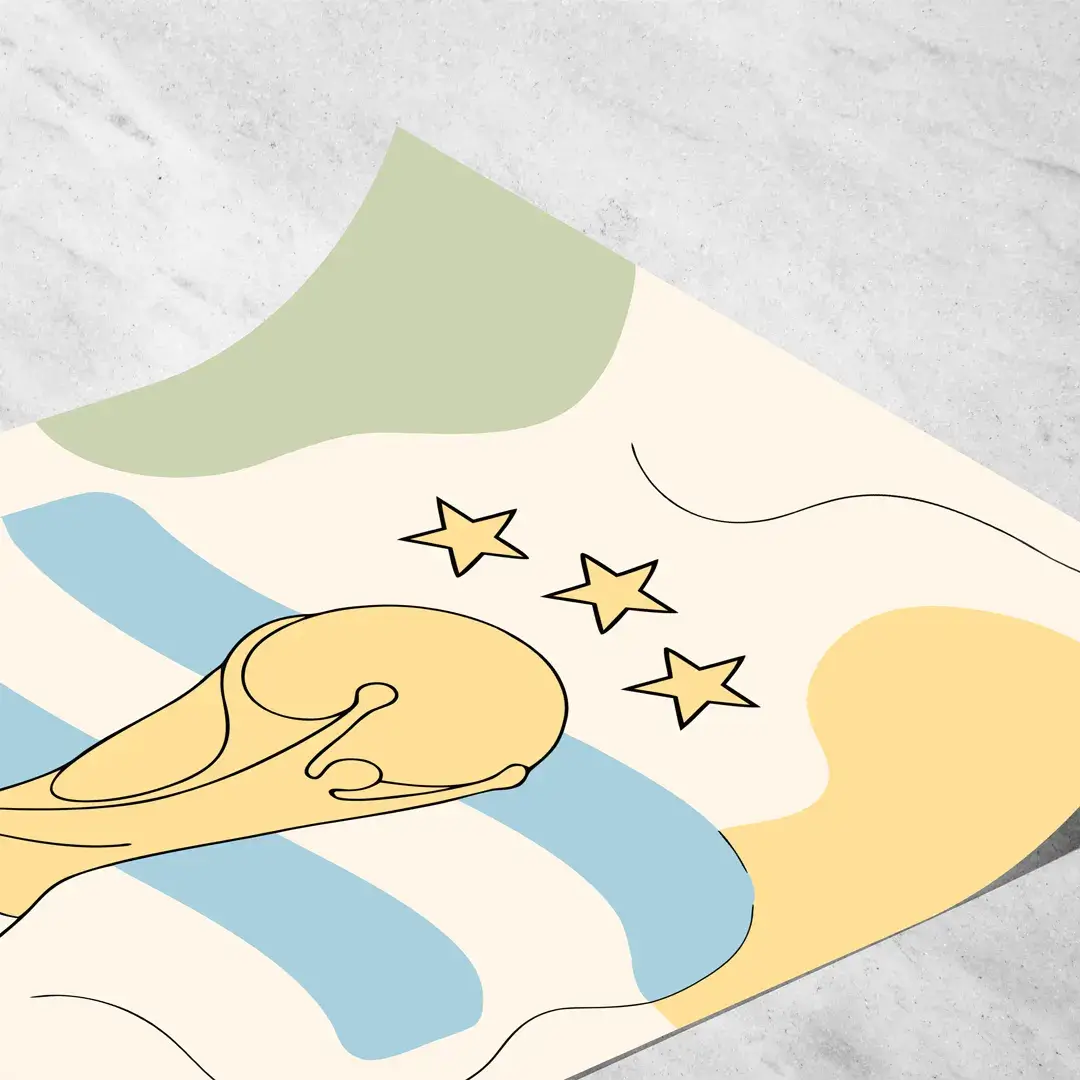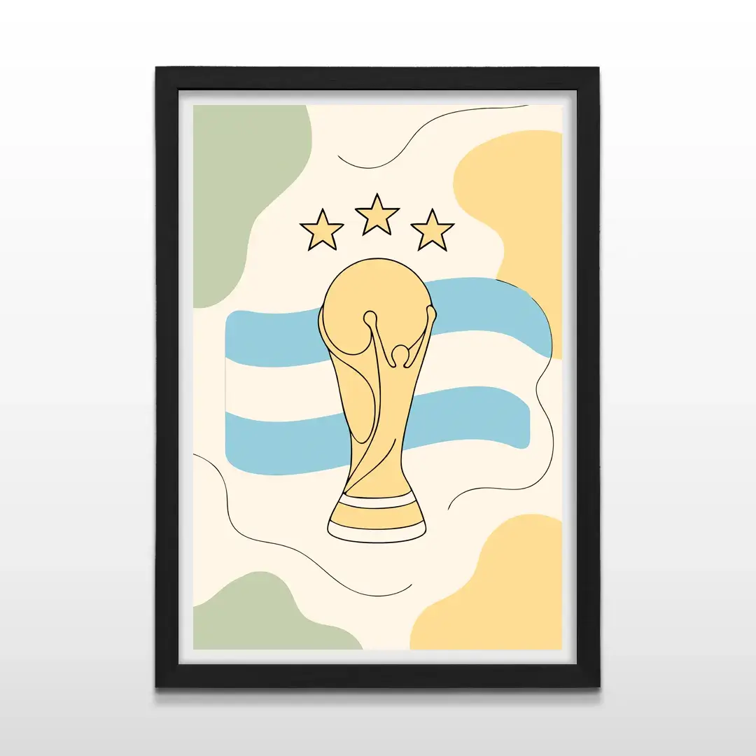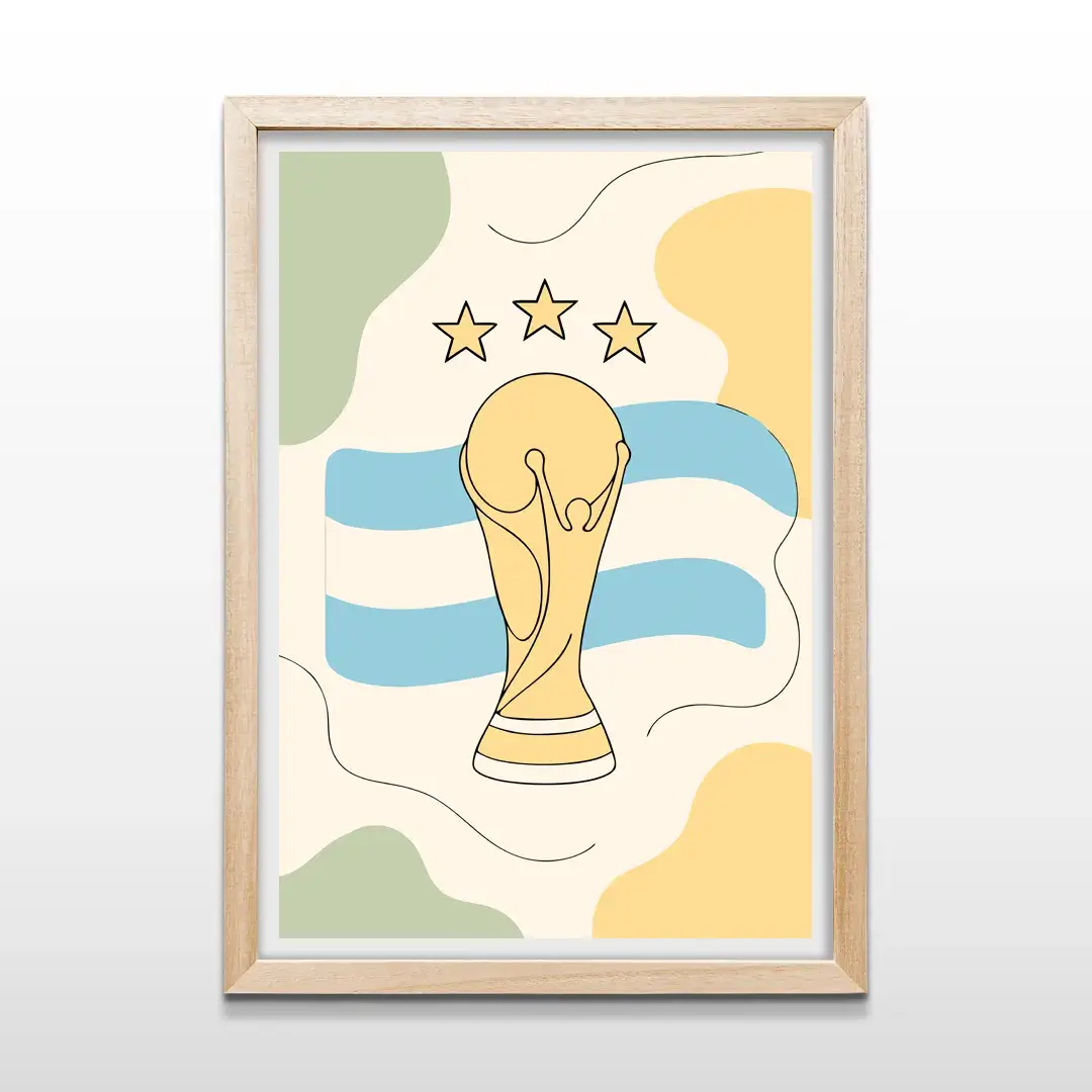 El cuadro decorativo Copa del Mundo Minimalista captura la consagración máxima desde una mirada sobria, emotiva y contemporánea. La obra presenta el trofeo mundial definido por trazos negros limpios que se apoyan sobre una bandera argentina reinterpretada en celestes suaves, acompañada por tres estrellas doradas que simbolizan la gloria alcanzada. El uso de formas orgánicas y colores pastel equilibra épica y delicadeza en una composición visualmente armónica.