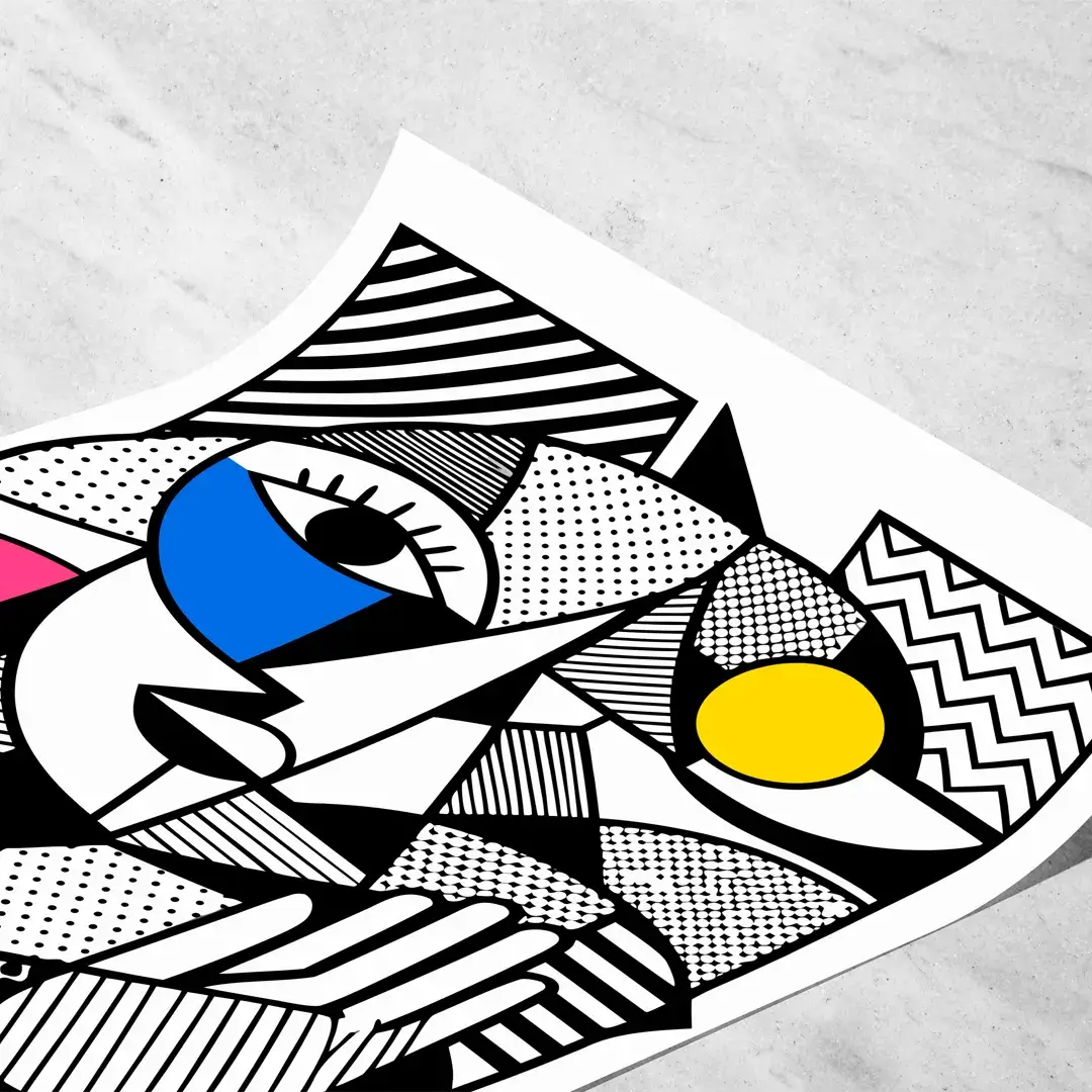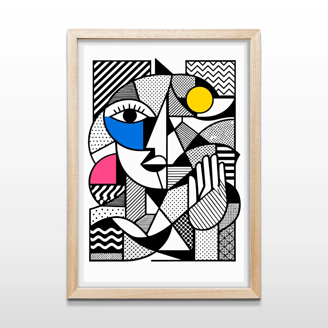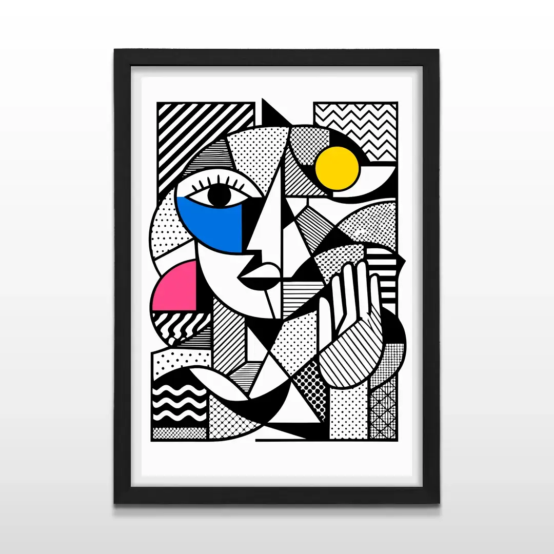 El cuadro decorativo Abstracto Femme propone una reinterpretación contemporánea del retrato femenino a través de una estética neo cubista moderna, donde la figura se construye a partir de fragmentos geométricos, tramas de puntos y líneas dinámicas. Un ojo azul intenso se convierte en el eje visual de la composición, acompañado por una mano estilizada y acentos vibrantes en fucsia y amarillo que contrastan con un fondo blanco limpio, logrando una obra potente, intelectual y visualmente sofisticada.