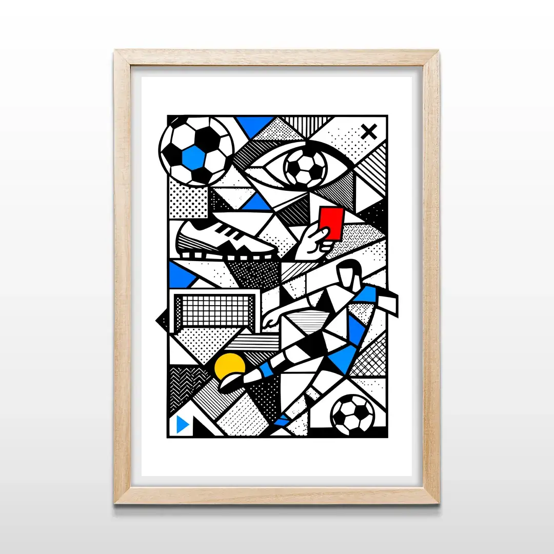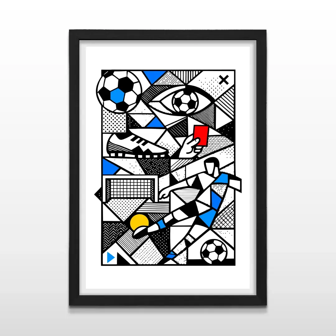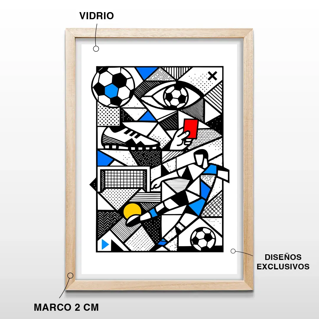 Por su enfoque conceptual, conecta especialmente con búsquedas como cuadros de fútbol abstractos, arte moderno de fútbol, cuadros decorativos deportivos, arte enmarcado futbolístico contemporáneo y cuadros geométricos de fútbol.