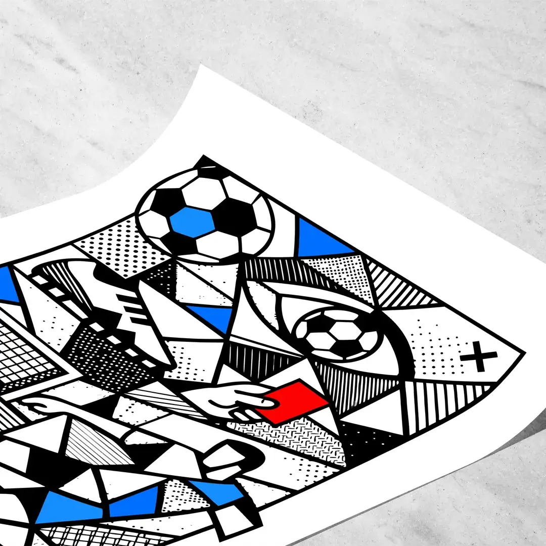 El cuadro decorativo Abstracto Fútbol traduce la intensidad del juego en una composición visual contemporánea cargada de movimiento y tensión estratégica. La escena se construye a partir de formas geométricas dinámicas que dan vida a la silueta de un futbolista en acción, rodeado por pelotas, botines, un arco y la tarjeta roja, mientras un ojo central observa y ordena el caos del partido, reforzando la idea de lectura táctica y pasión constante.