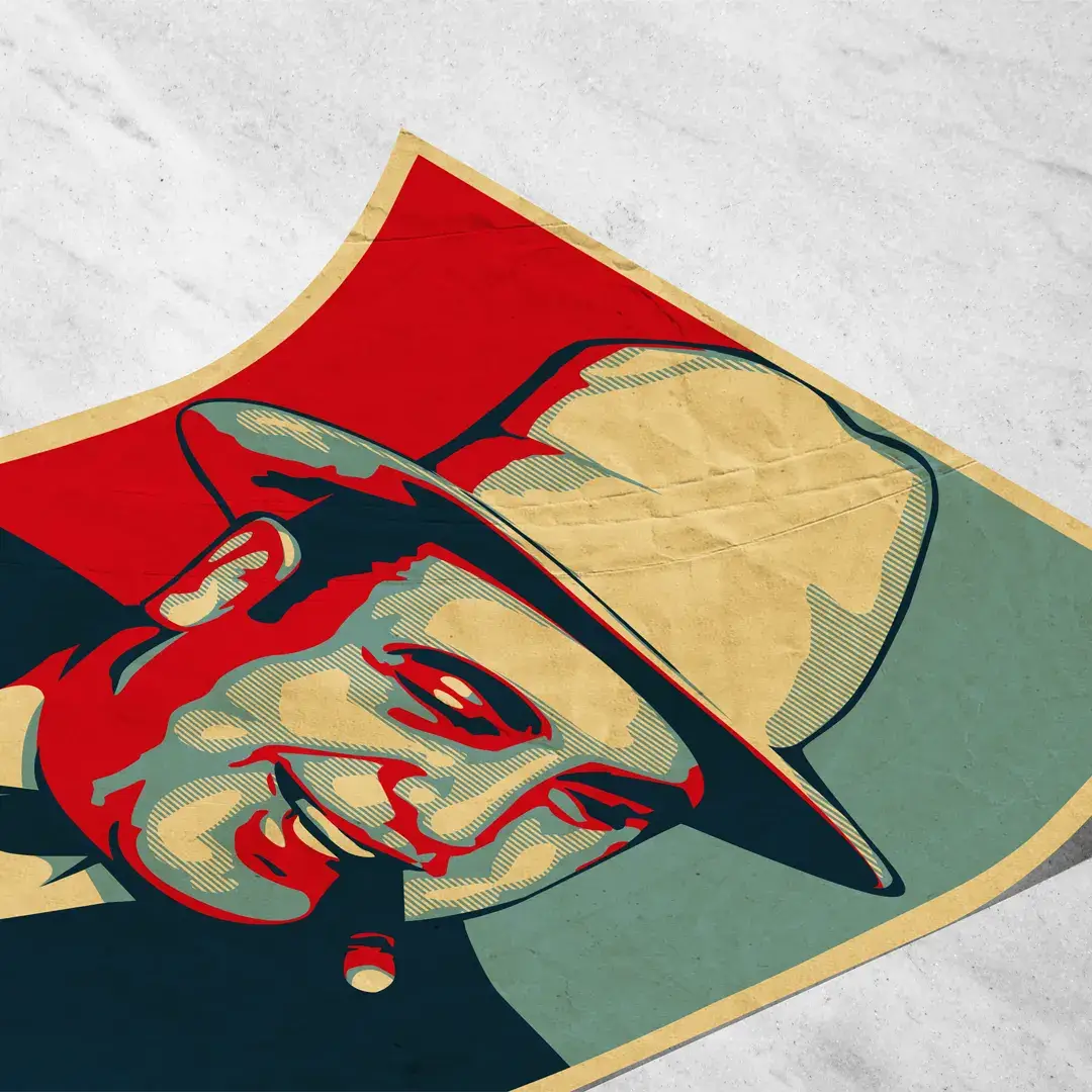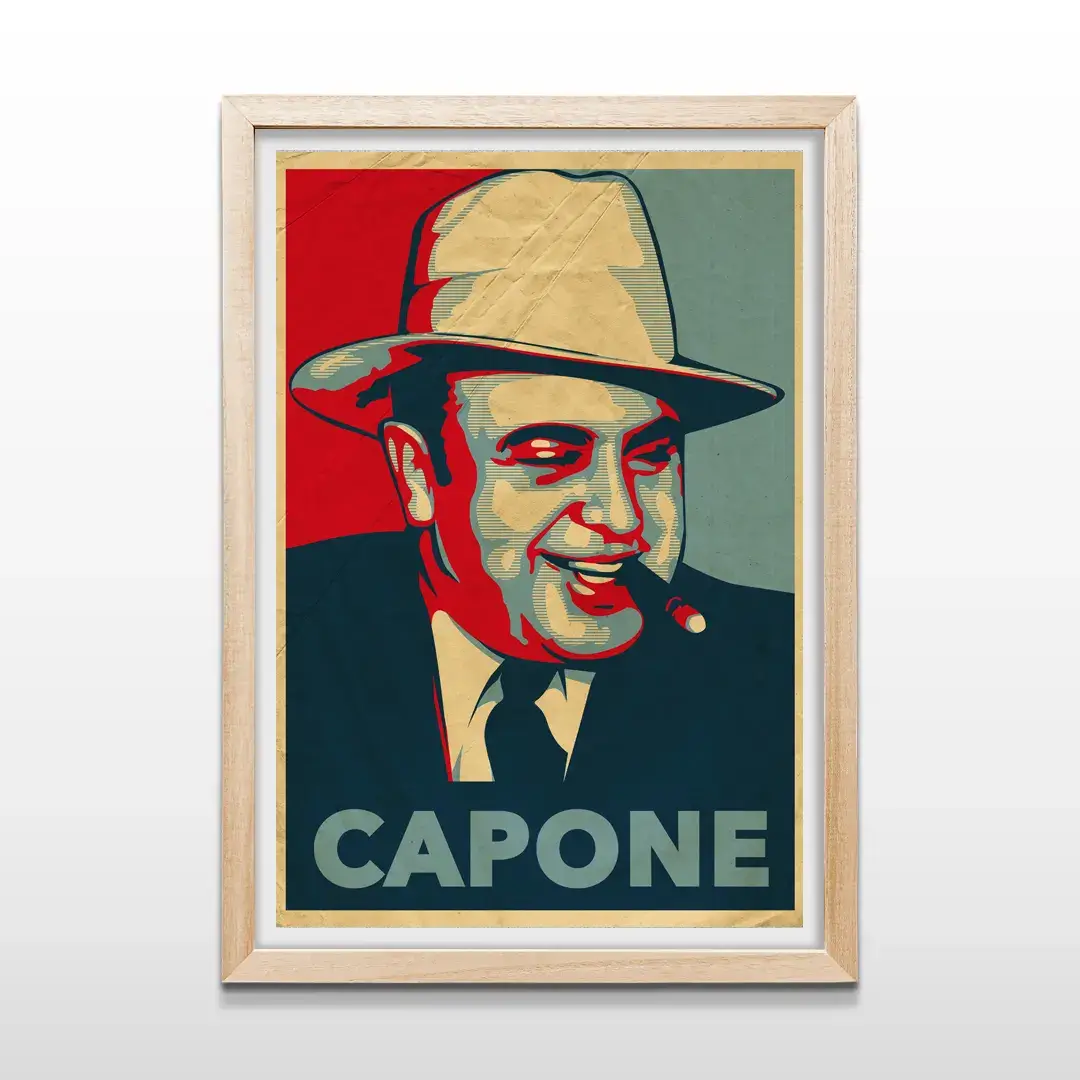 El cuadro decorativo Al Capone es una pieza de arte pop vintage que combina fuerza visual y sofisticación histórica. Presenta un retrato estilizado del legendario gánster de los años 30, con tonos rojo carmesí, crema y azul petróleo que resaltan su mirada astuta y su inseparable cigarro, creando un contraste impactante y lleno de carácter.