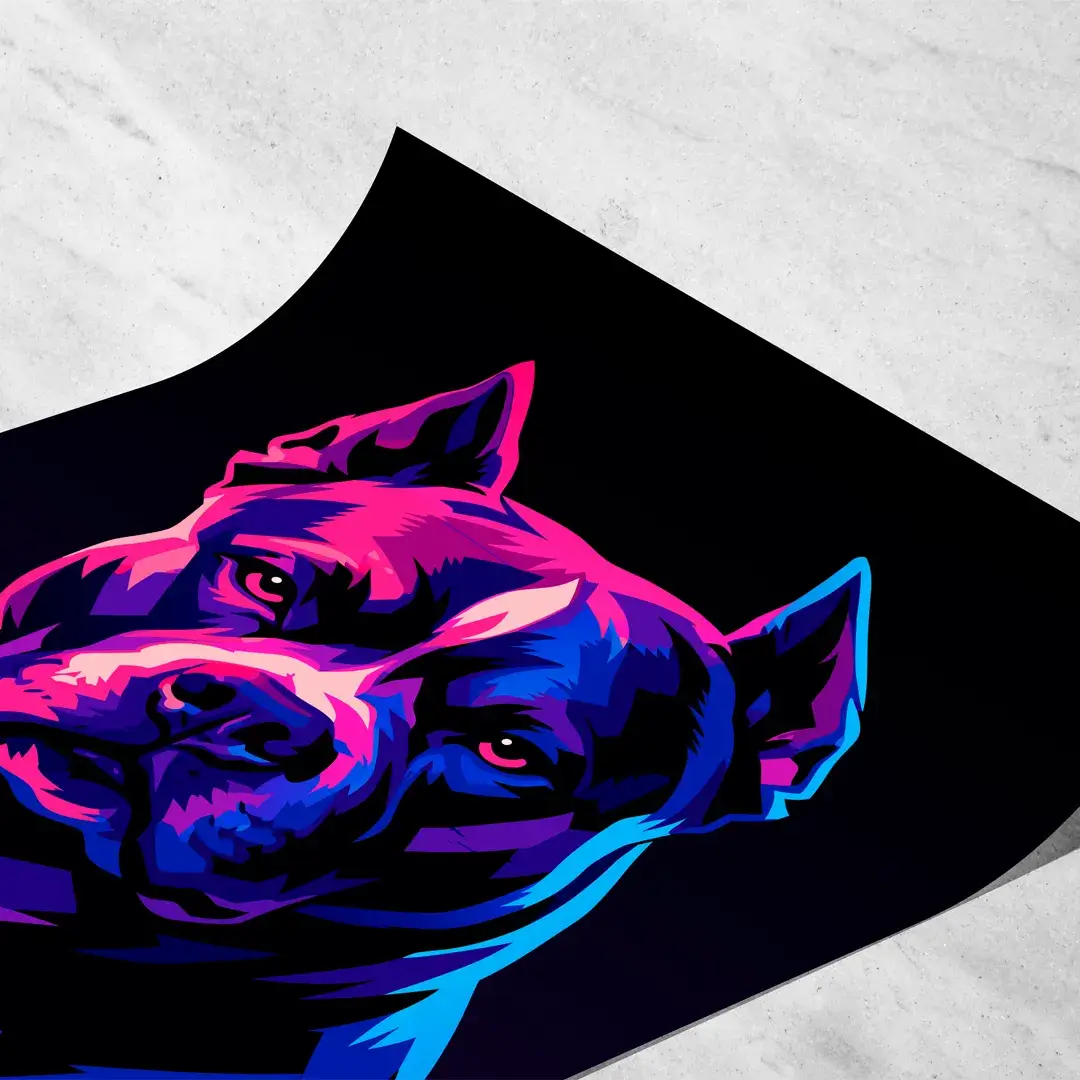 La paleta de colores neón combina púrpuras intensos, azules eléctricos y acentos magenta que emergen con potencia sobre un fondo negro profundo, creando un contraste dramático que realza la mirada atenta y la expresión decidida del perro. Este enfoque cromático convierte la pieza en un cuadro decorativo moderno ideal para quienes buscan una estética audaz con identidad fuerte.