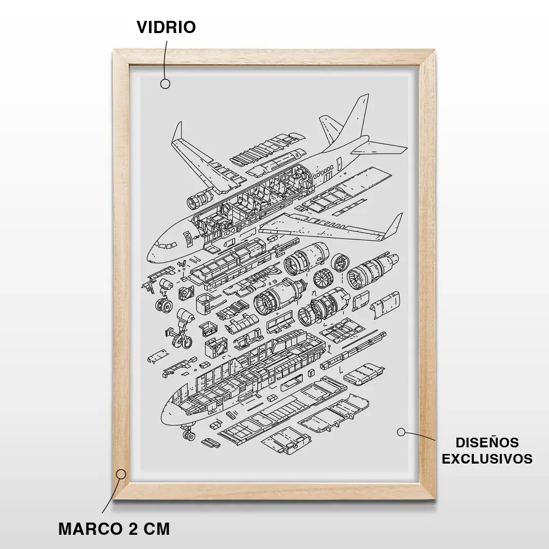 Este cuadro de anatomía de avión se integra con naturalidad en oficinas profesionales, estudios de arquitectura, espacios de trabajo creativo o ambientes dedicados a la aviación y la tecnología, aportando carácter intelectual y una impronta moderna.