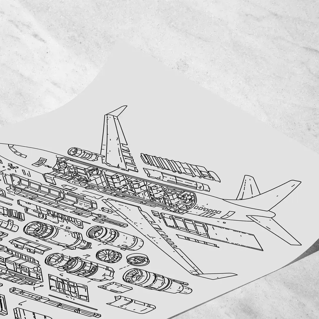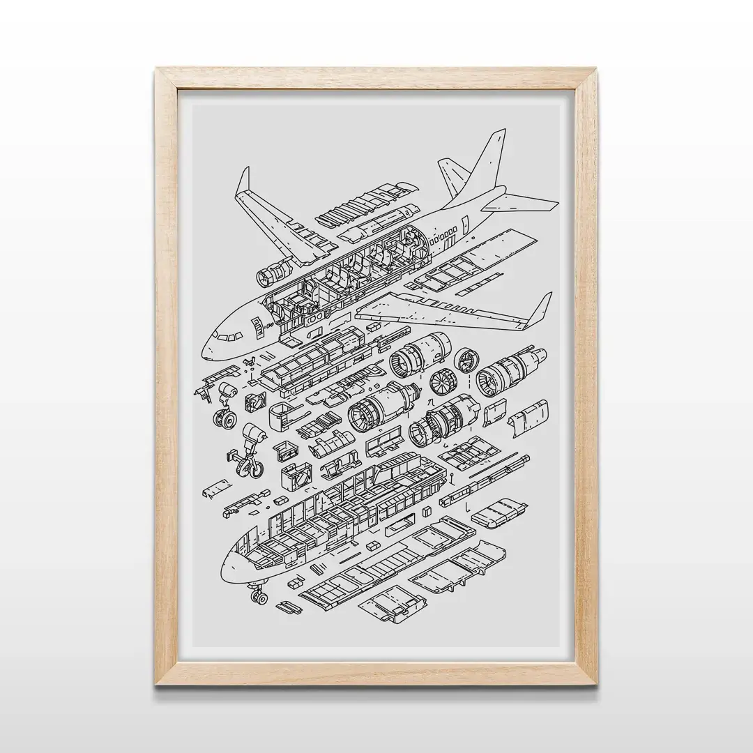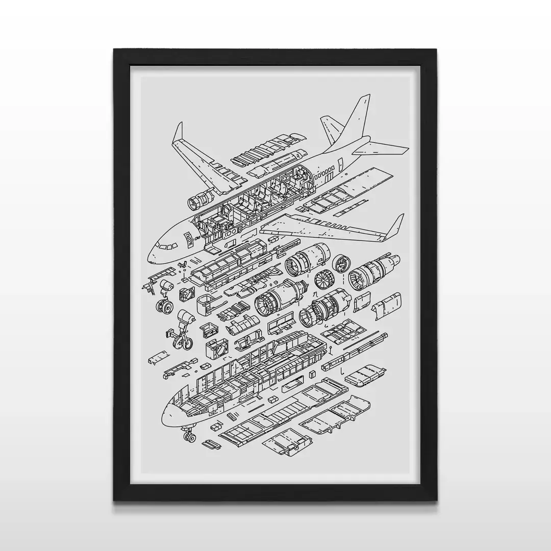 El cuadro decorativo Anatomía Avión traduce la complejidad del vuelo en un diseño preciso y riguroso. La ilustración presenta un avión comercial tipo Boeing en vista explosionada, donde cada componente se despliega con claridad: motores, fuselaje, alas, tren de aterrizaje y distribución interna de cabina. El fondo gris minimalista refuerza la lectura técnica y aporta una estética sobria de inspiración industrial.