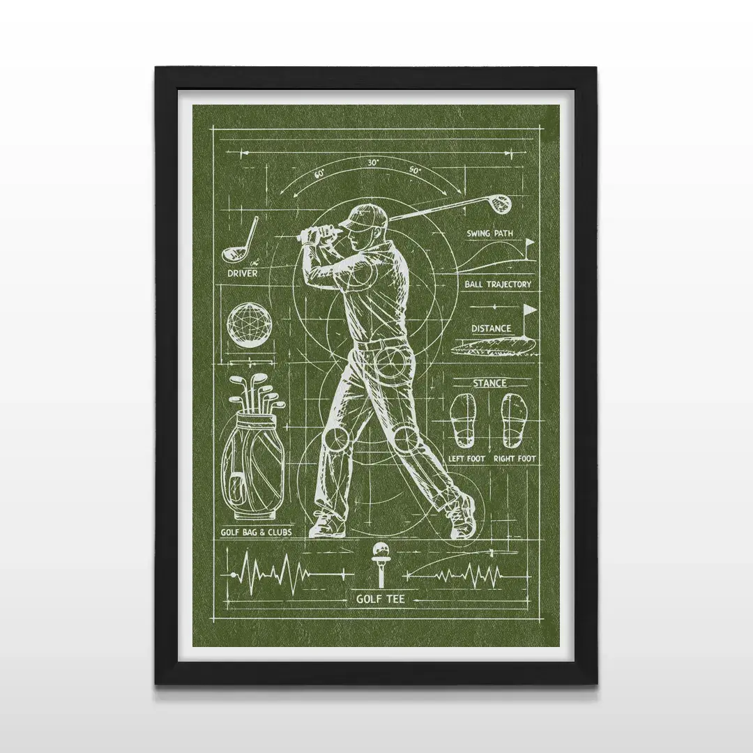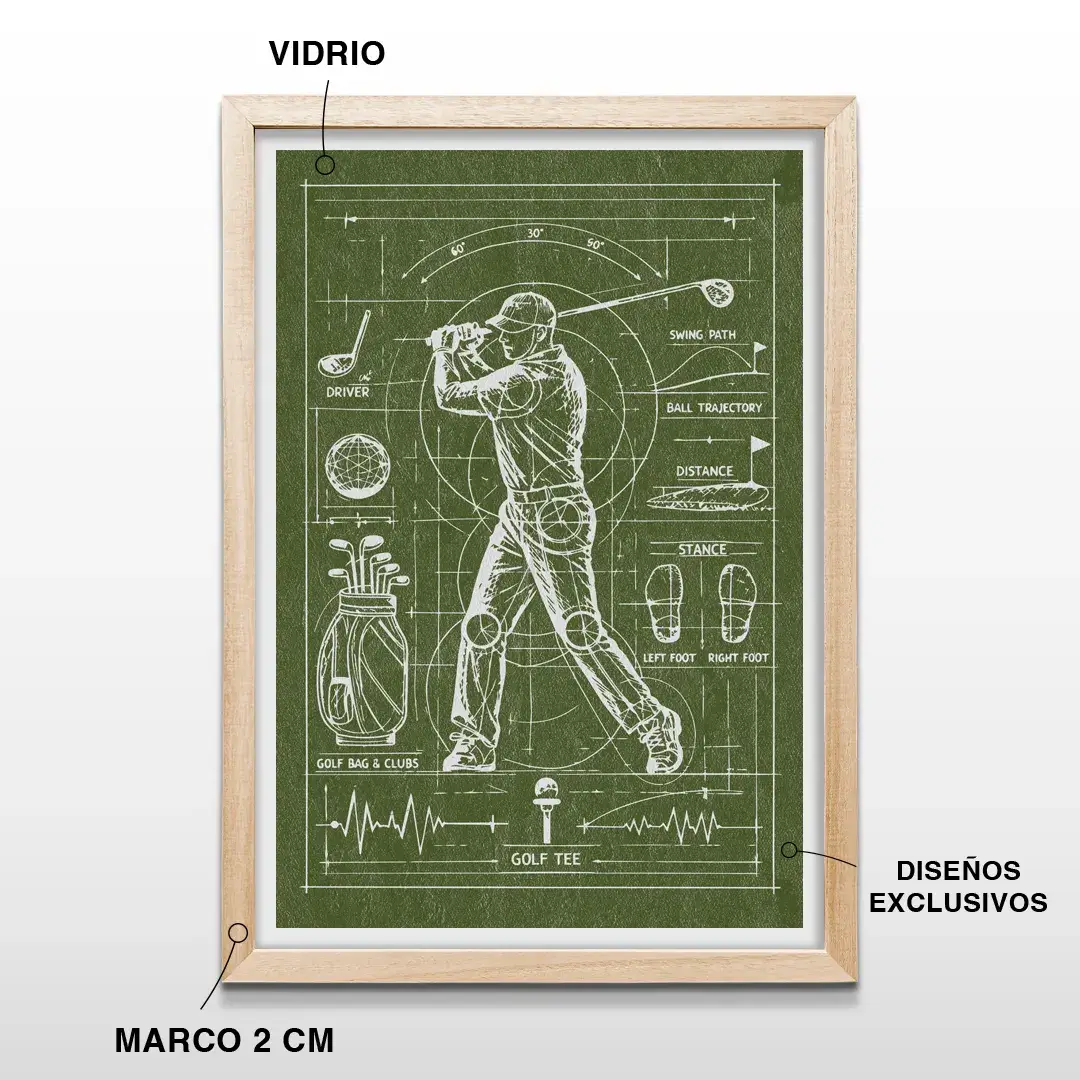 Pensado para quienes buscan comprar cuadros decorativos de golf en Argentina, este cuadro de anatomía del swing de golf es una pieza de arte con estilo vintage que aporta carácter, distinción deportiva y una narrativa visual alineada con la excelencia y la disciplina del juego.