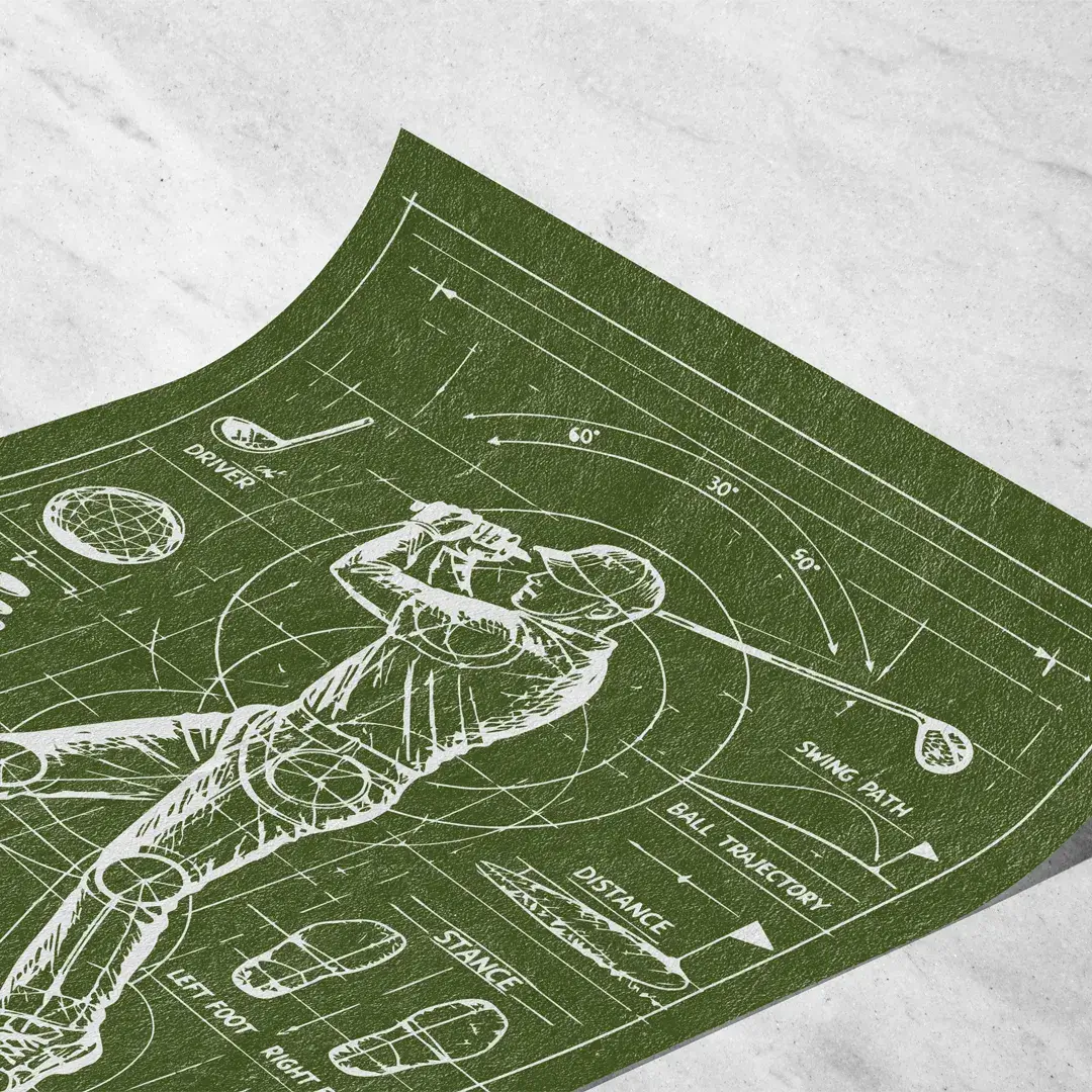 El cuadro decorativo Anatomía de un Golfista propone una lectura visual precisa del swing ideal, fusionando análisis deportivo y estética conceptual. La composición se desarrolla como un diagrama técnico trazado en blanco tipo tiza sobre un fondo verde profundo inspirado en el césped del fairway, donde se estudian la rotación del torso, la alineación de hombros, la posición de los pies y la trayectoria de la bola en cada fase del golpe.