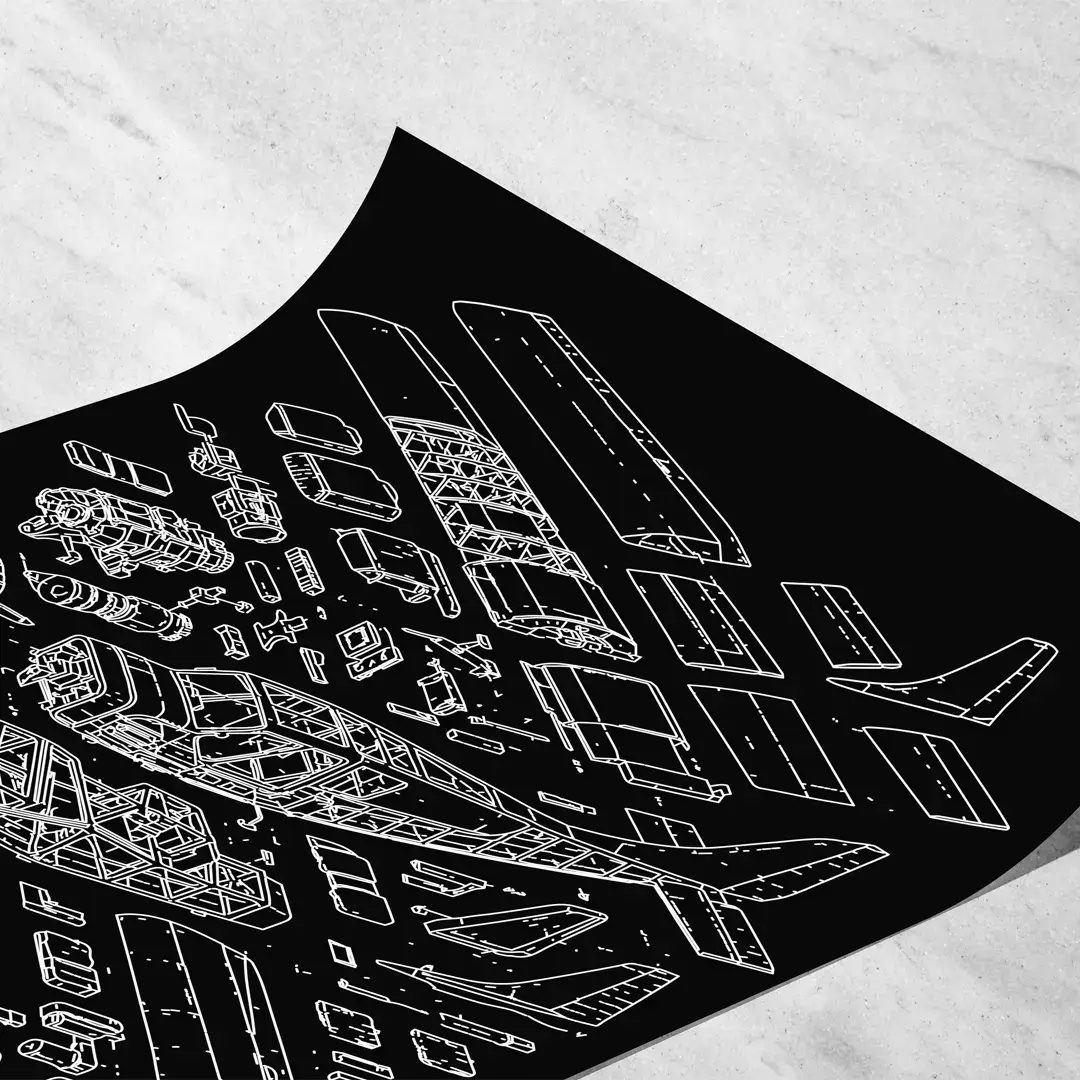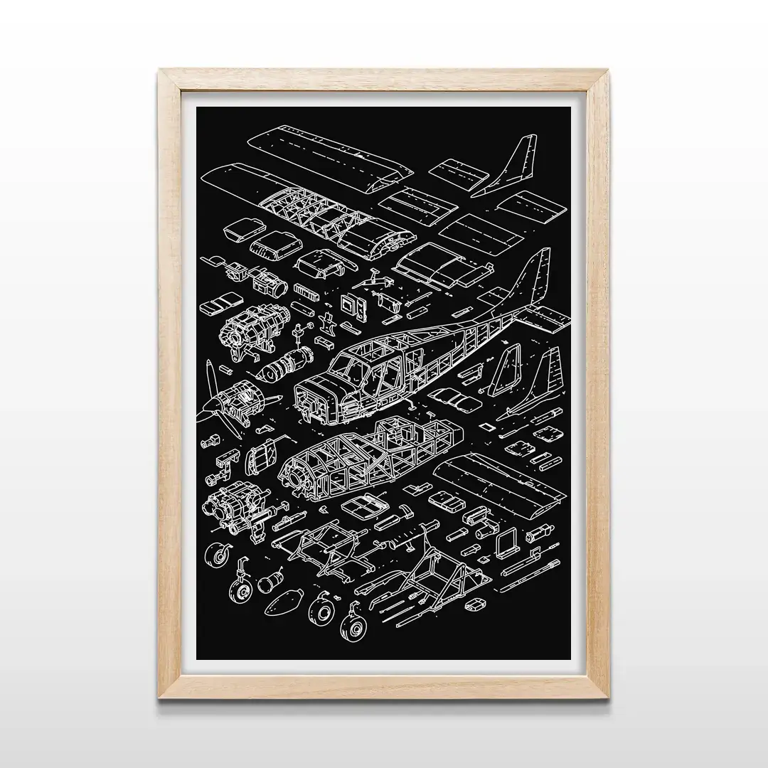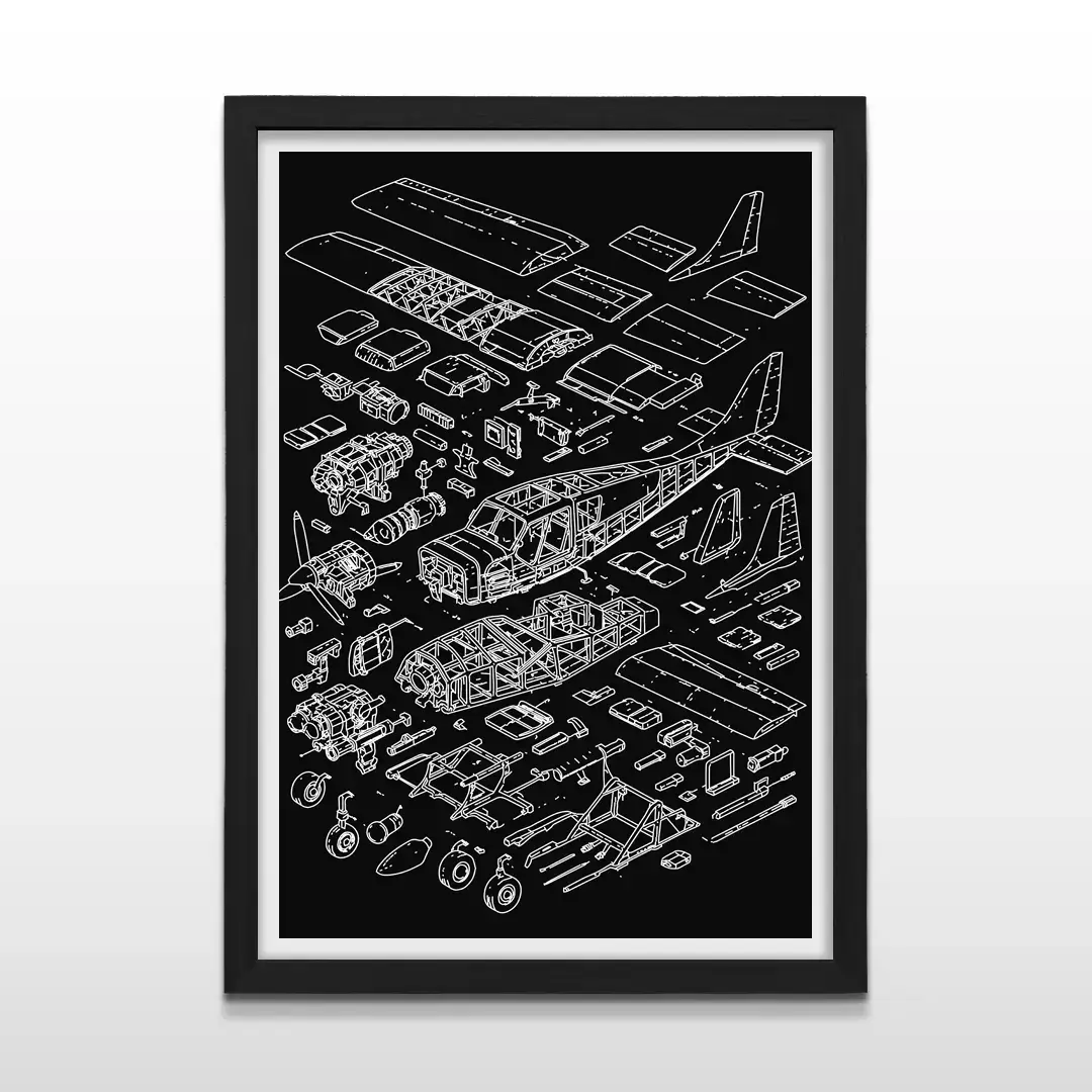 El cuadro decorativo Anatomía de una Avioneta presenta una representación técnica minuciosa de una aeronave ligera en formato despiece, donde cada parte desde la hélice, el motor, la cabina, las alas y el tren de aterrizaje se organiza con precisión sobre un fondo negro de alto contraste. El dibujo lineal en blanco resalta la estructura mecánica y aporta una estética moderna vinculada al diseño industrial y la ingeniería aeronáutica.