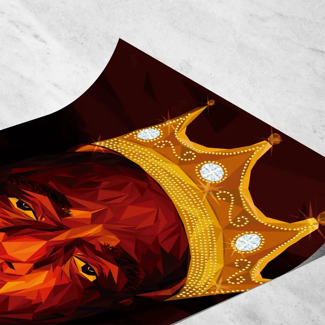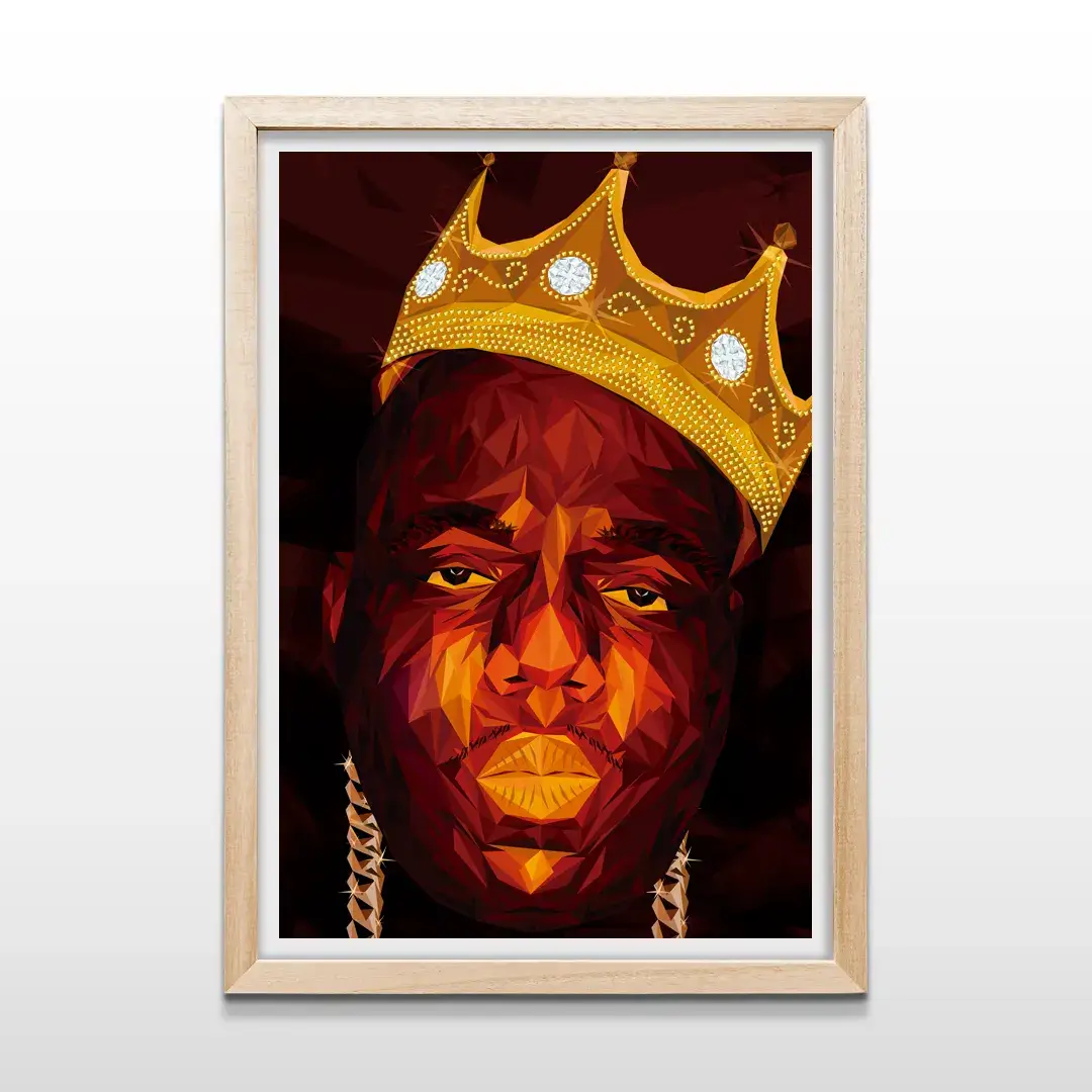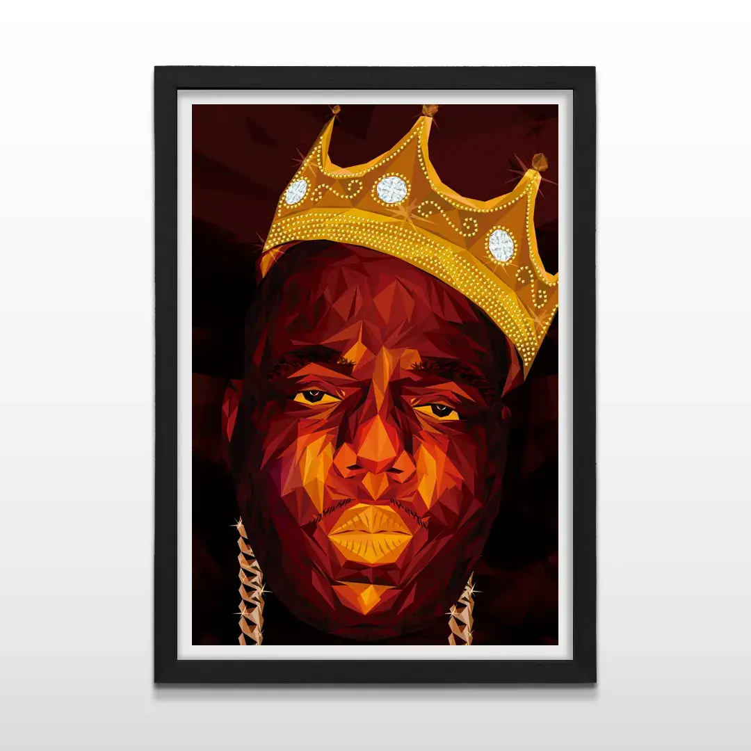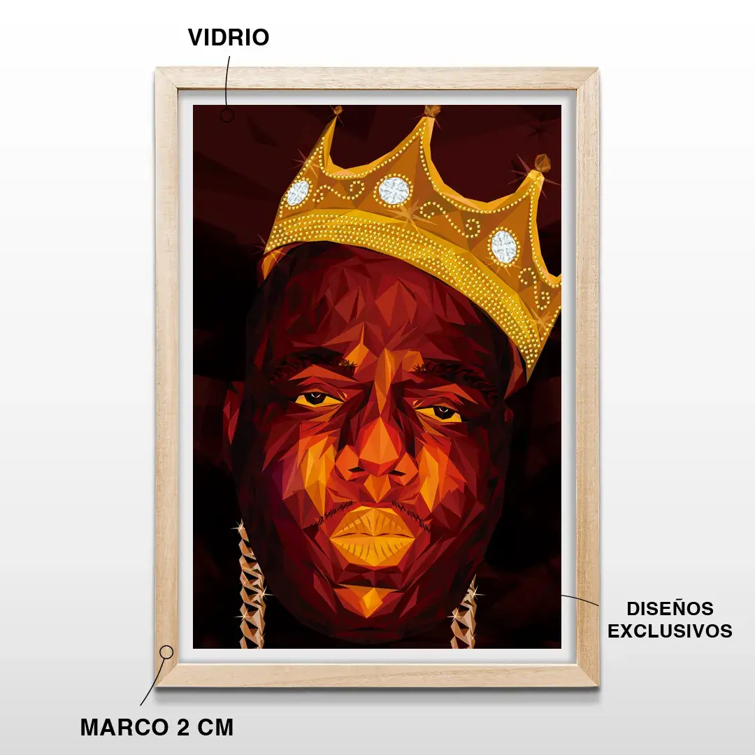 El cuadro decorativo Biggie reinterpreta el ícono absoluto del hip-hop a través de una ilustración digital geométrica de alto impacto. El retrato facetado de The Notorious, coronado con su clásica corona dorada, emerge sobre un fondo oscuro que intensifica el contraste, la fuerza del gesto y la carga simbólica del personaje. Cada plano geométrico refuerza su presencia dominante y su estatus de leyenda cultural.