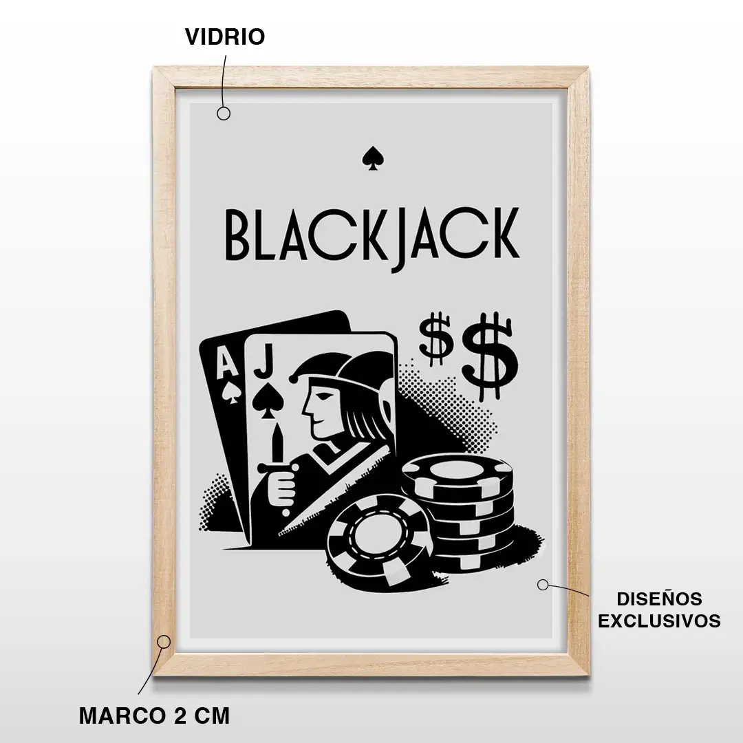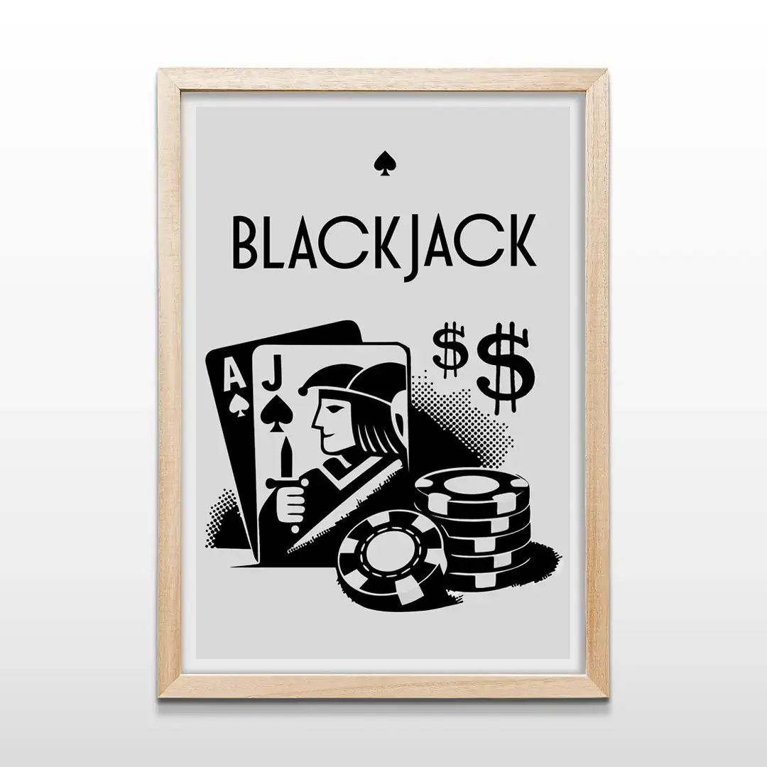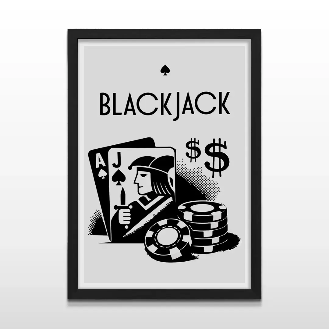 El cuadro decorativo Blackjack interpreta la esencia estratégica y elegante del juego de cartas más emblemático del casino, condensando tensión, cálculo y estilo en una composición minimalista en blanco y negro. Cada elemento visual está pensado para transmitir control, precisión y una sofisticación atemporal, evocando el aura clásica de las mesas de apuestas donde cada decisión define el resultado.