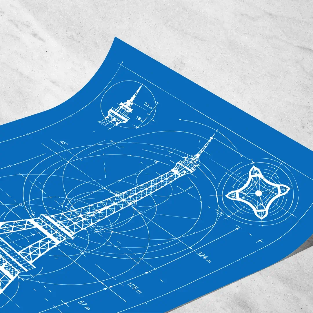El cuadro decorativo Blueprint Torre Eiffel combina precisión técnica y estética icónica en una composición que rinde homenaje a una de las obras arquitectónicas más reconocidas del mundo. La pieza presenta un plano detallado de la Torre Eiffel con medidas, proporciones y estructura visibles, desarrollado sobre un fondo azul cian profundo que remite al lenguaje clásico del blueprint de ingeniería.