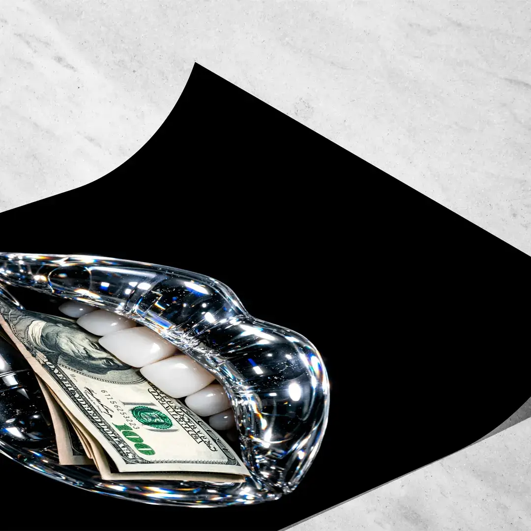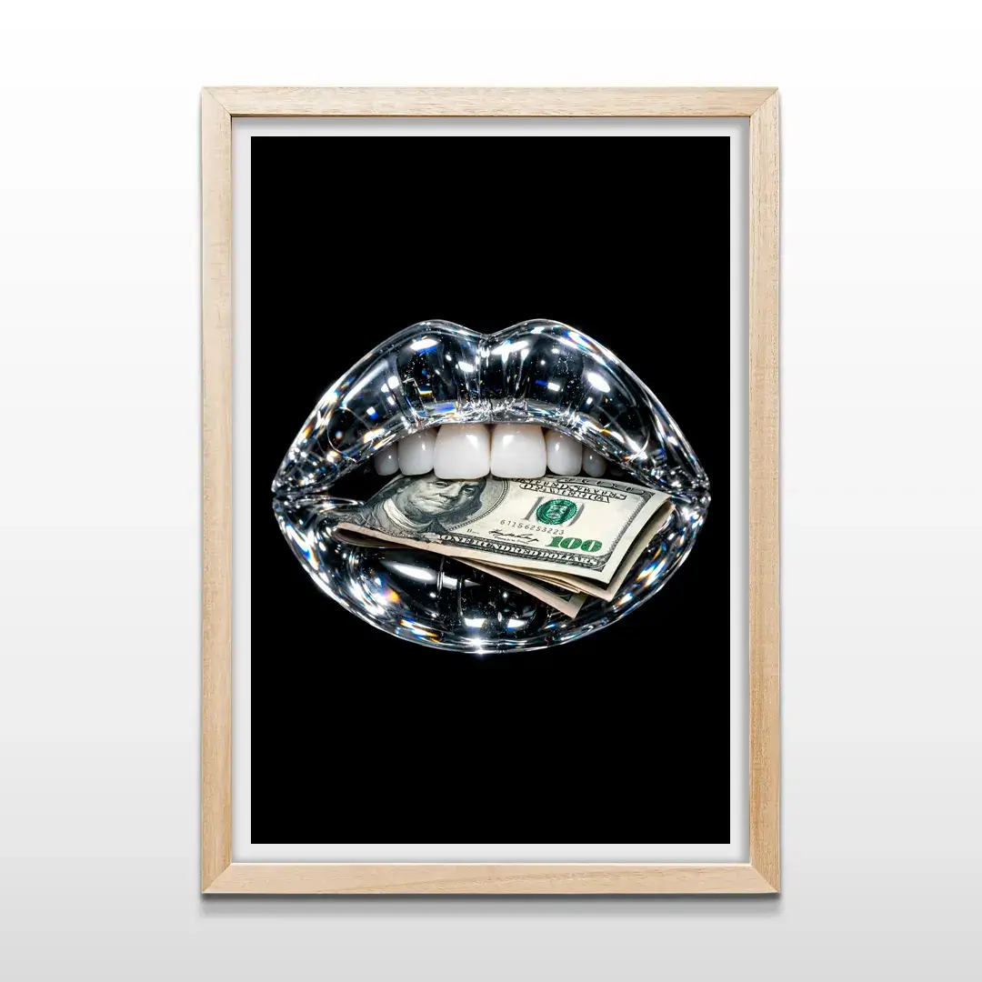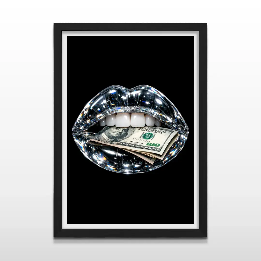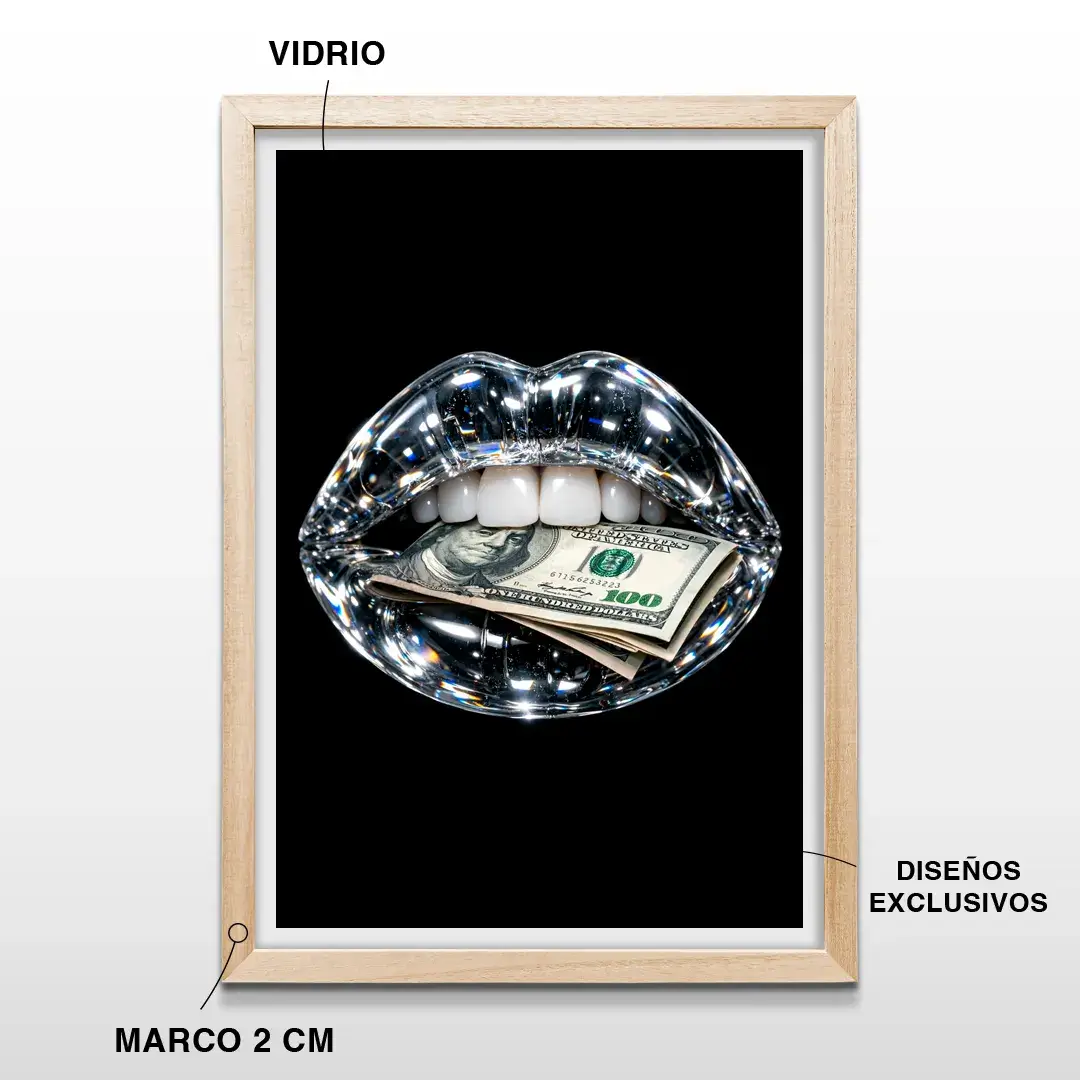 El cuadro decorativo Boca 100 Dólares es una obra de arte contemporáneo y pop de lujo que combina sofisticación, audacia y brillo visual. Presenta una boca hiperrealista de cristal con destellos de diamante que sostiene un billete de 100 dólares, sobre un fondo negro profundo que resalta cada detalle y transmite poder y exclusividad.