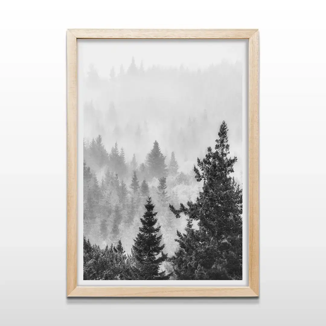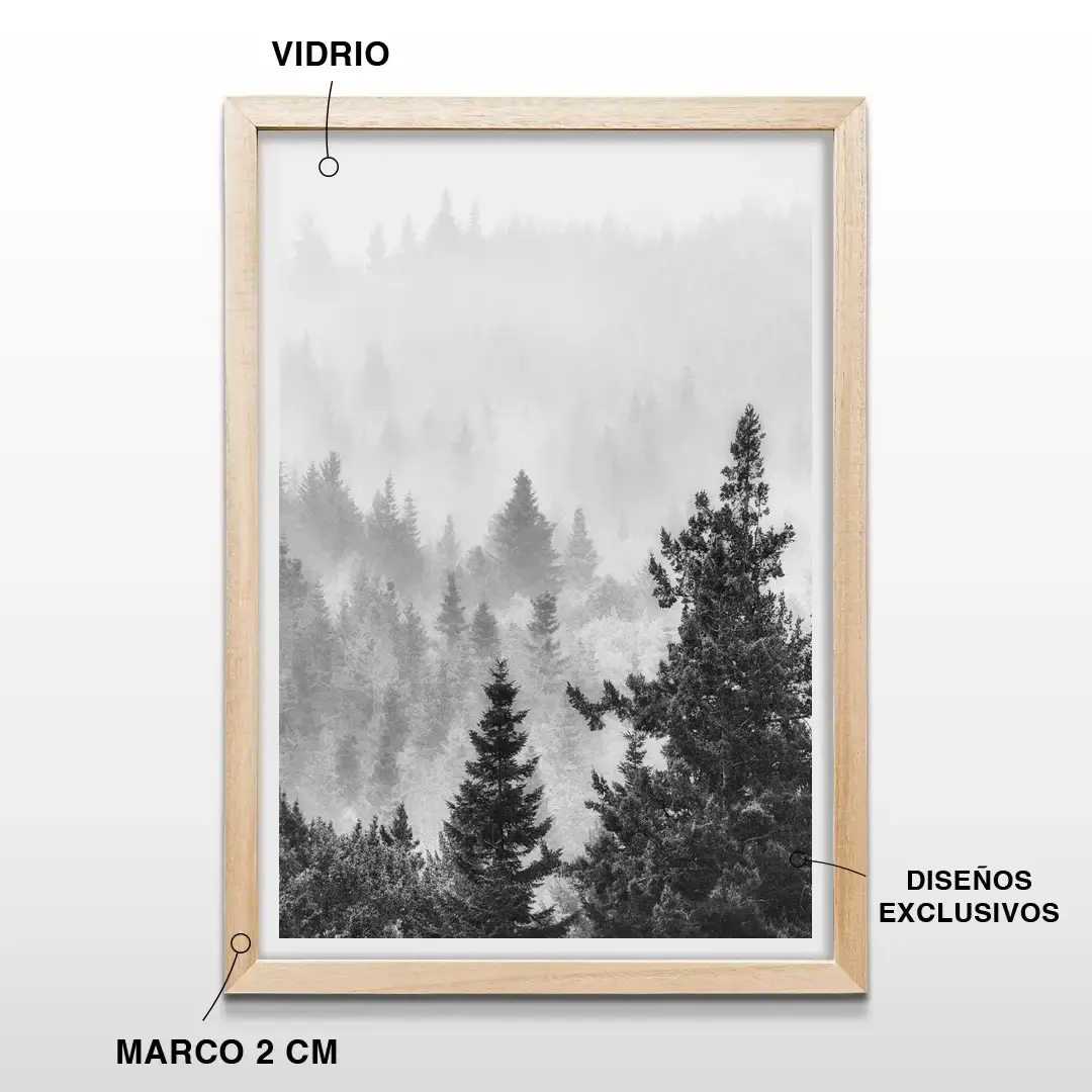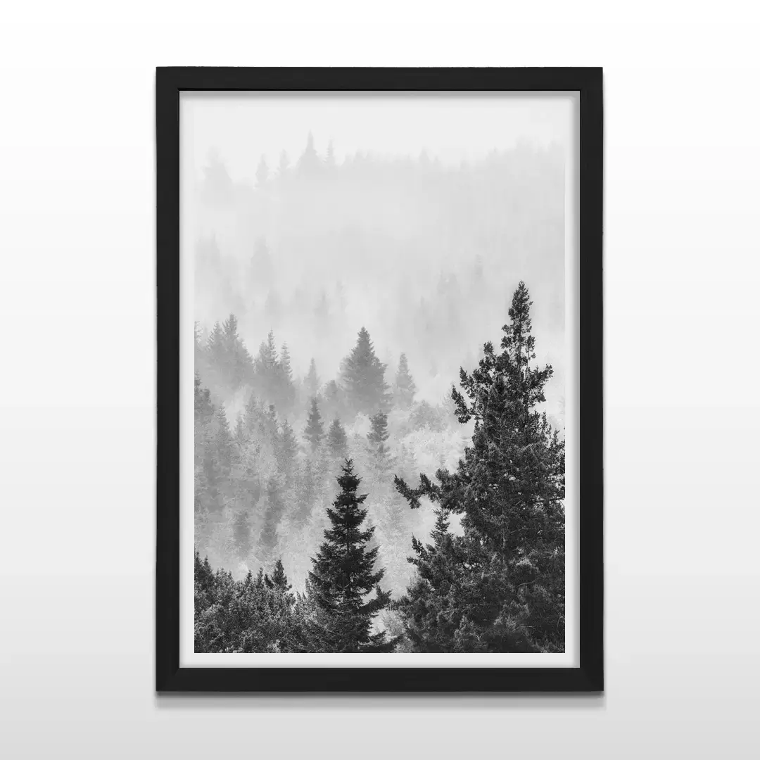El cuadro decorativo Bosque muestra un paisaje de coníferas elevándose entre una niebla suave que envuelve la escena. La composición en blanco y negro de alto contraste resalta las siluetas de los árboles y las texturas naturales del bosque, generando una imagen profunda y silenciosa que transmite calma visual.