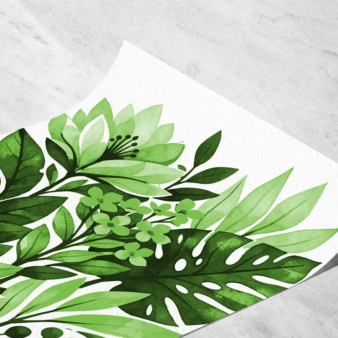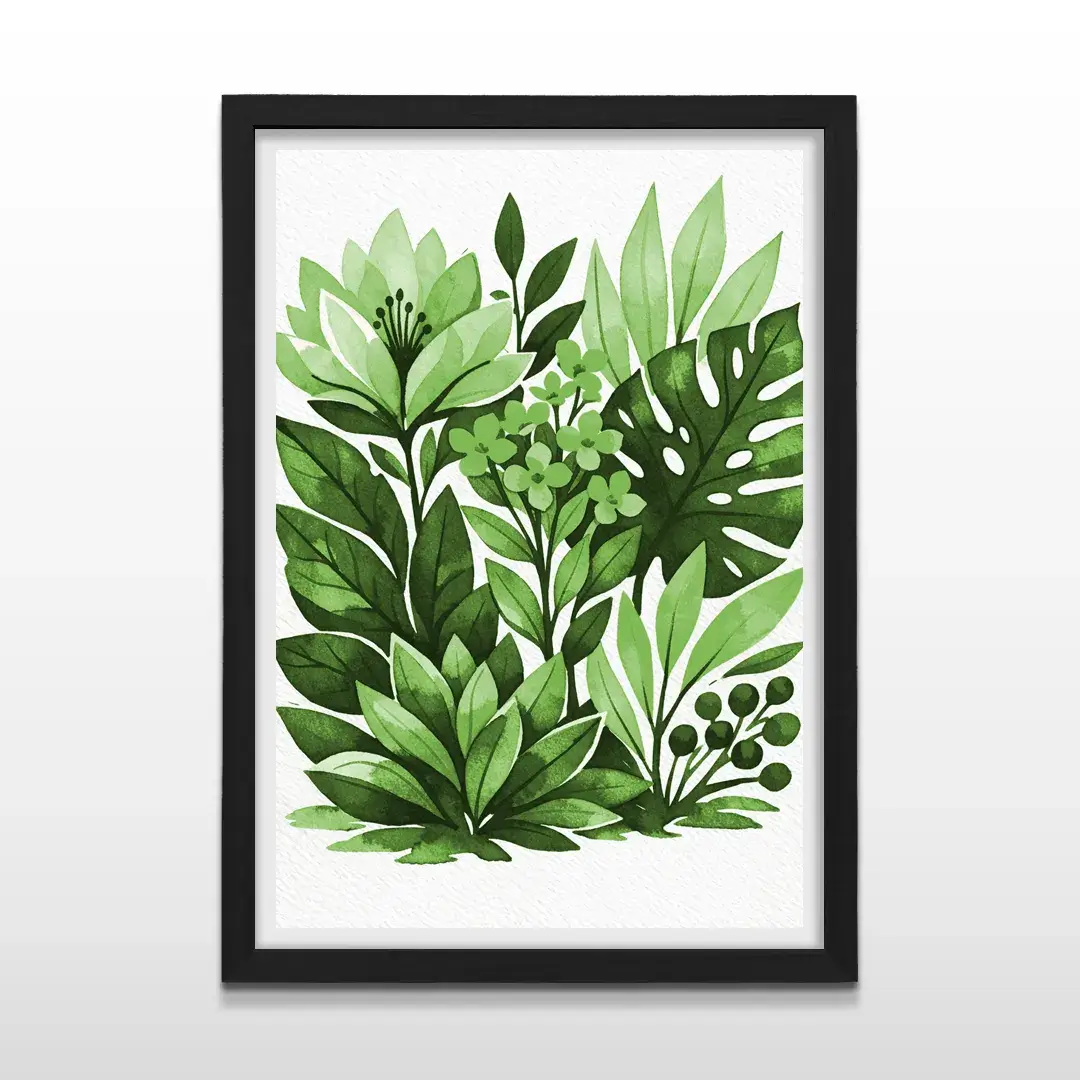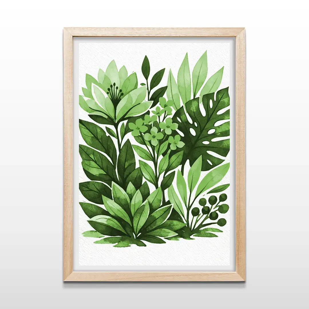 El cuadro decorativo Botánica interpreta la naturaleza desde una mirada contemporánea y serena, a través de una ilustración en acuarela que combina hojas de monstera, follaje tropical y flores orgánicas en una composición equilibrada. La paleta de verdes profundos y matices suaves se despliega sobre un fondo blanco limpio, generando una sensación de frescura visual y respiración estética.