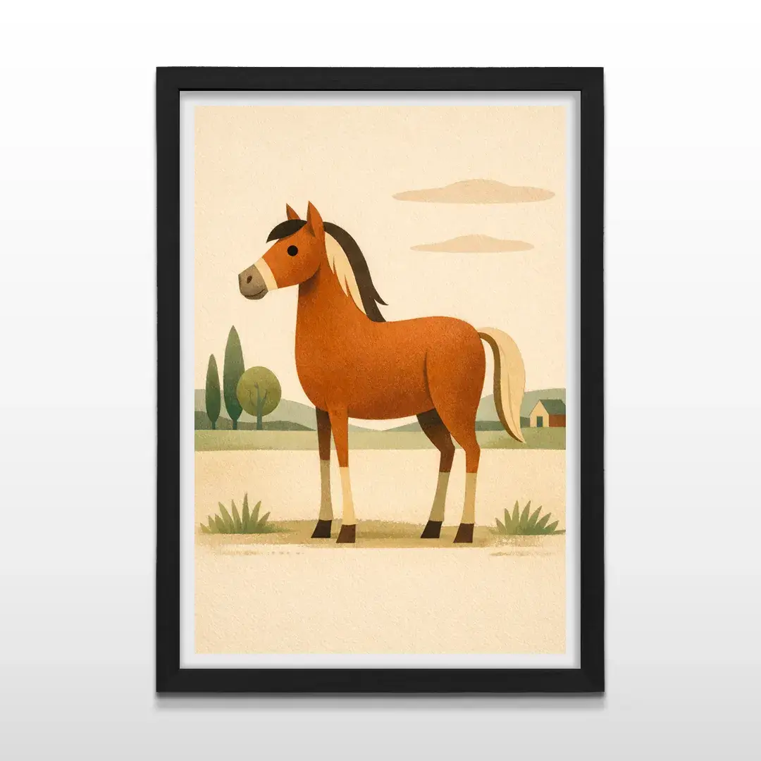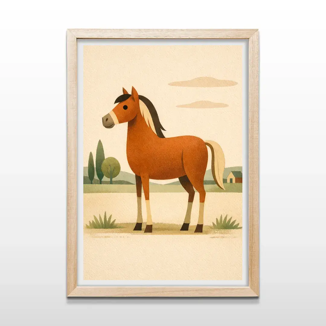 El cuadro decorativo Caballo Niños transmite ternura y conexión con la naturaleza a través de una ilustración suave y orgánica. La escena presenta un caballo amigable en tonos terracota, con crines oscuras y expresión serena, integrado a un paisaje campestre con pinos delicados, nubes simples y una pequeña casa rural que refuerza la sensación de refugio y calma. El fondo crema aporta luminosidad y equilibrio visual, ideal para espacios infantiles.