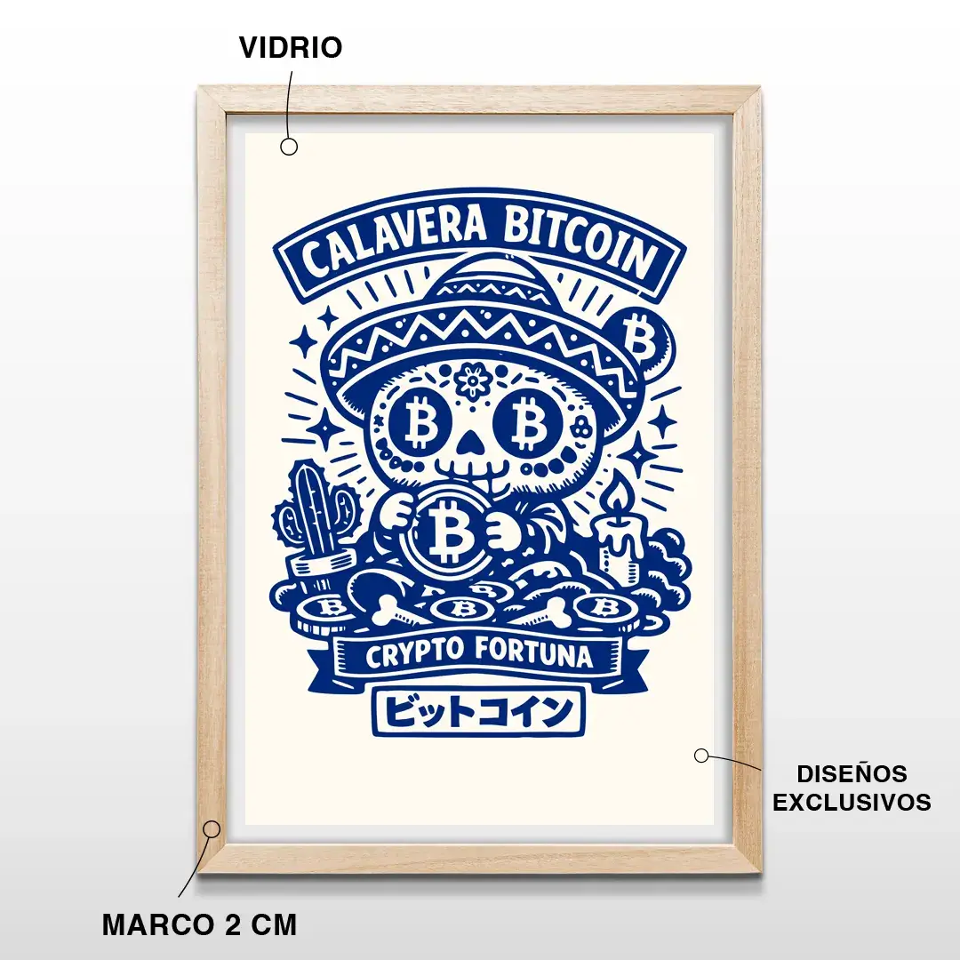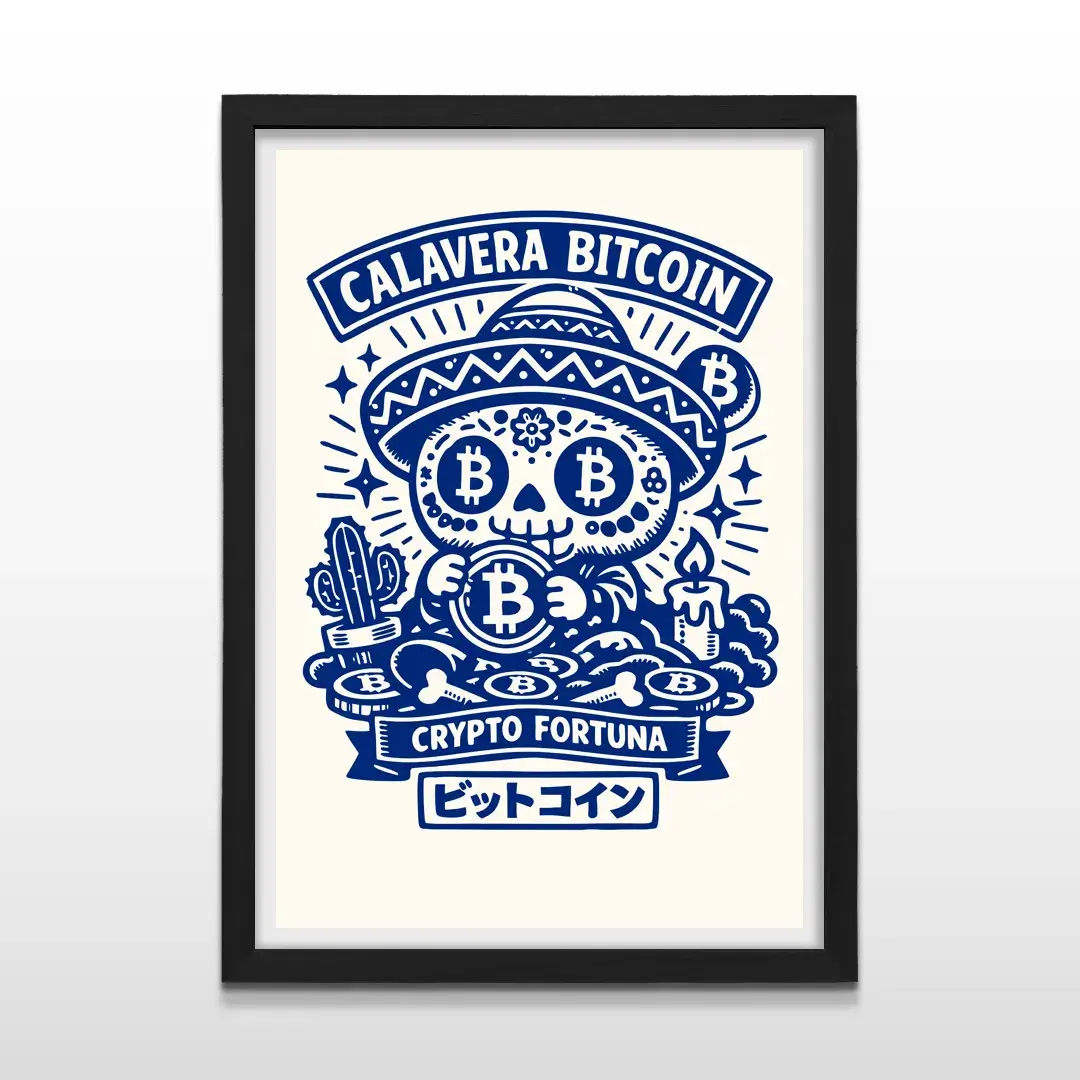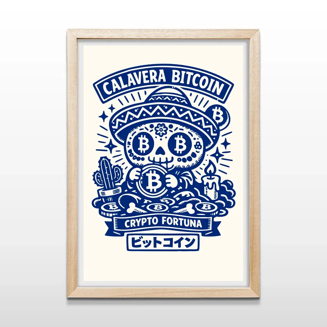 El cuadro decorativo Calavera BTC es una obra de arte contemporáneo que celebra la resiliencia y la audacia del ecosistema cripto. Presenta una calavera estilizada adornada con símbolos de Bitcoin sobre una montaña de monedas y huesos, combinando ilustración minimalista en azul profundo con tipografía japonesa y el lema “Crypto Fortuna”, para un efecto visual moderno y conceptual.