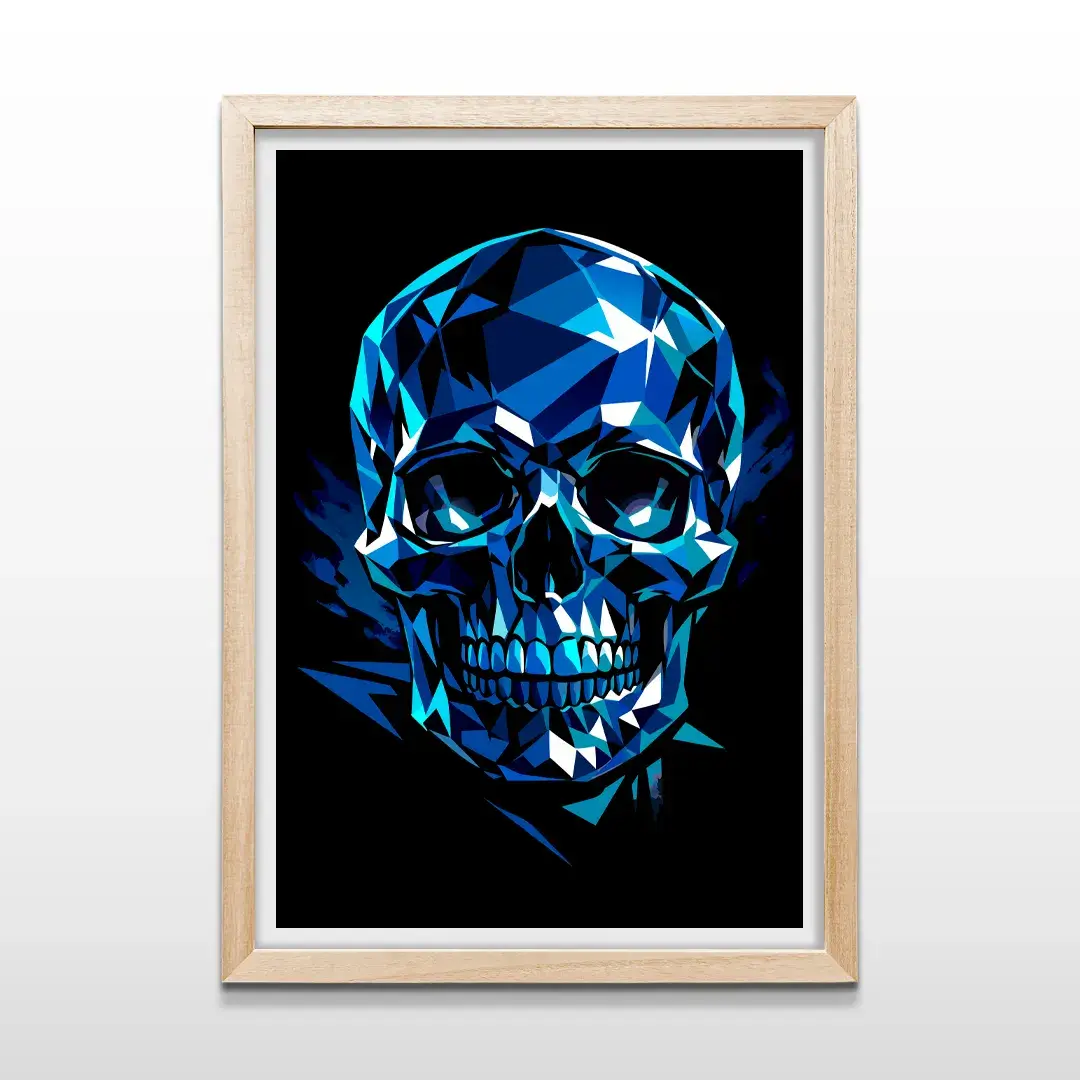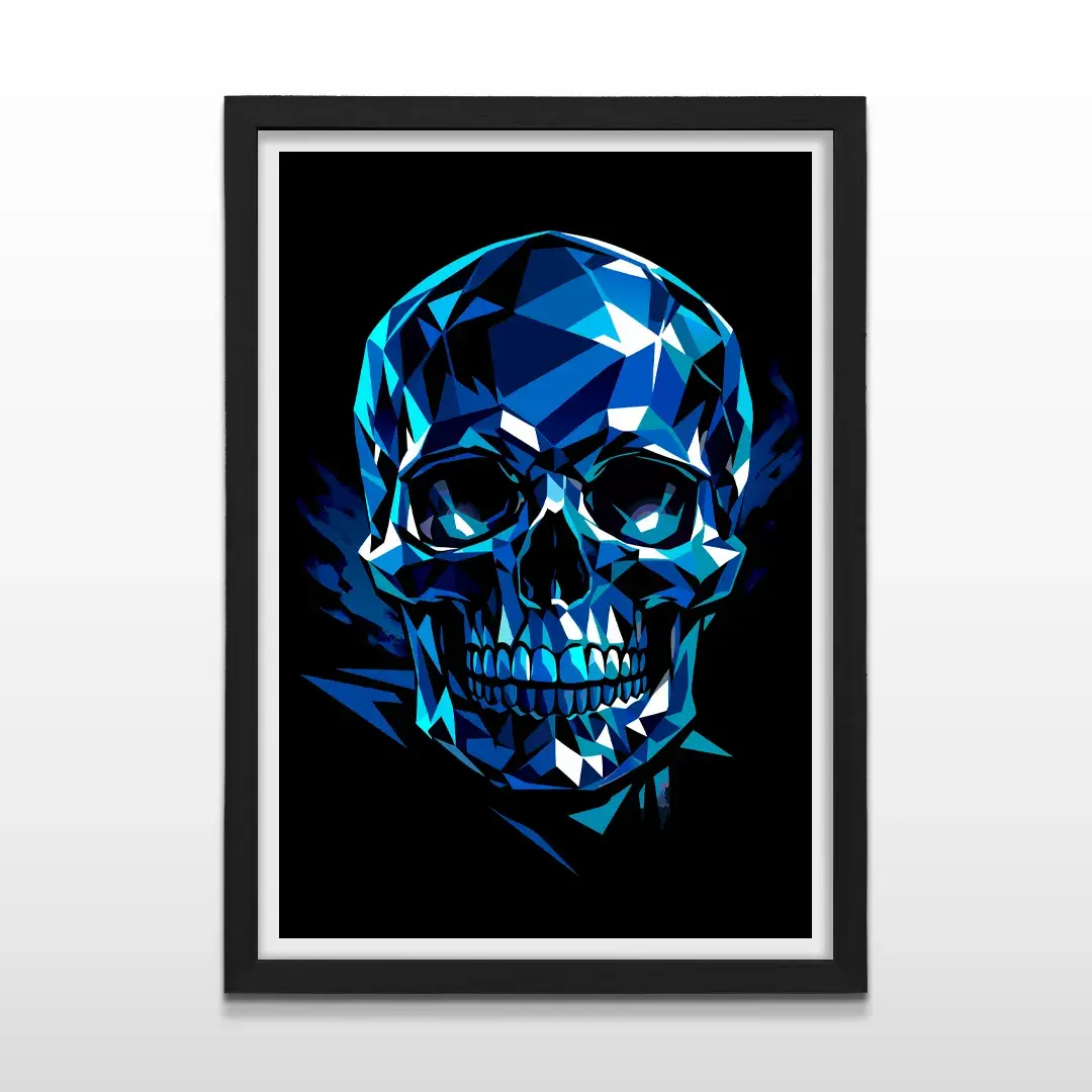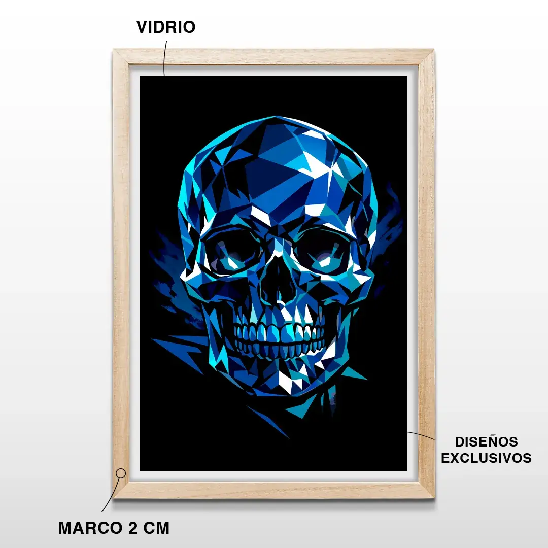 El cuadro decorativo Calavera Cristales es una obra de arte moderno de fuerte impacto visual que explora la transformación y el poder simbólico de la forma. La ilustración presenta una calavera geométrica construida a partir de facetas cristalinas en un azul eléctrico profundo, que captura y refleja la luz con un efecto gélido sobre un fondo negro absoluto, generando una sensación de profundidad y presencia inmediata.
