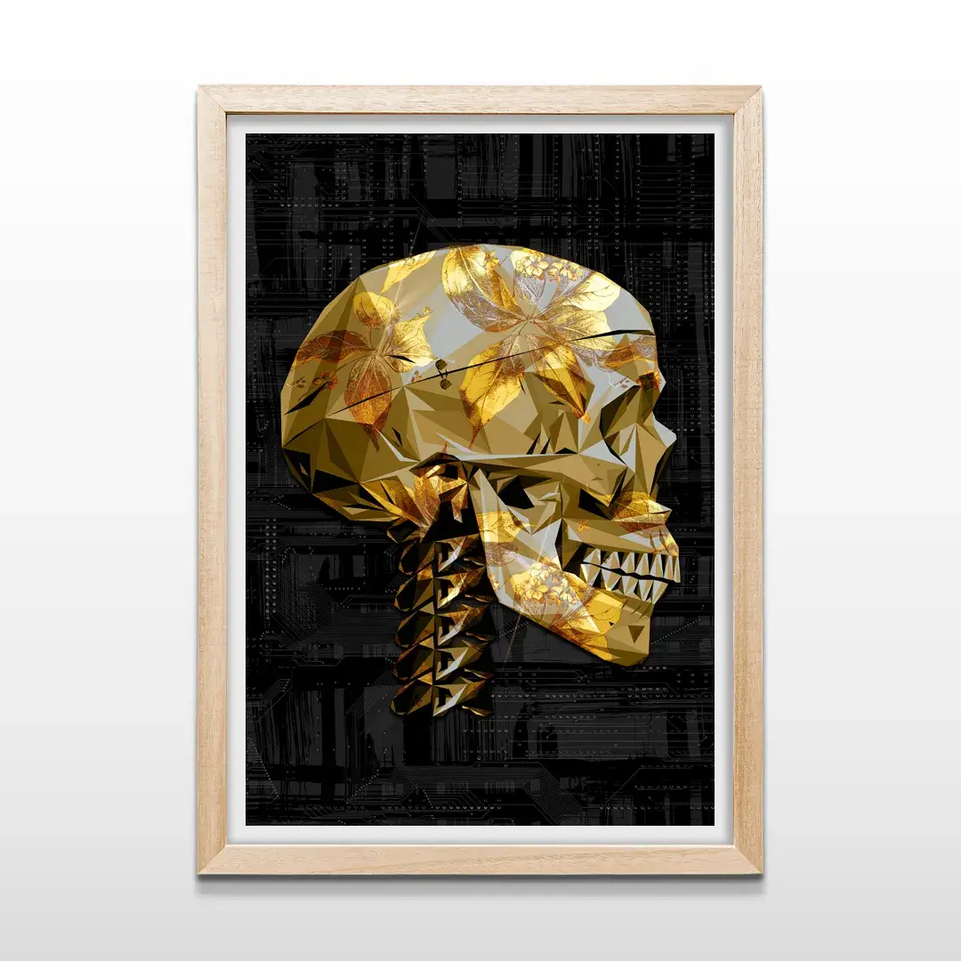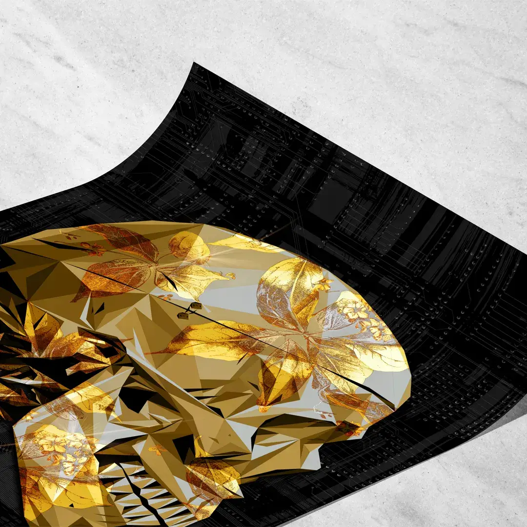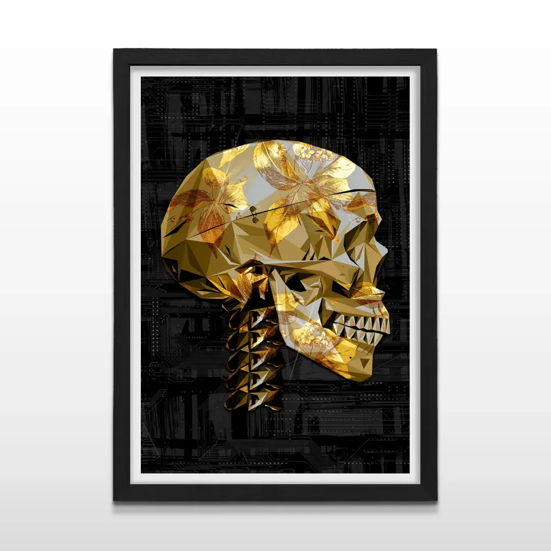 El cuadro decorativo Calavera Flores Oro es una pieza de arte digital conceptual que combina sofisticación, misticismo y elegancia contemporánea. Presenta una calavera geométrica estilo low-poly, embellecida con delicadas flores doradas que emergen de su interior sobre un fondo negro profundo con texturas inspiradas en circuitos, creando un efecto visual hipnótico y de lujo.