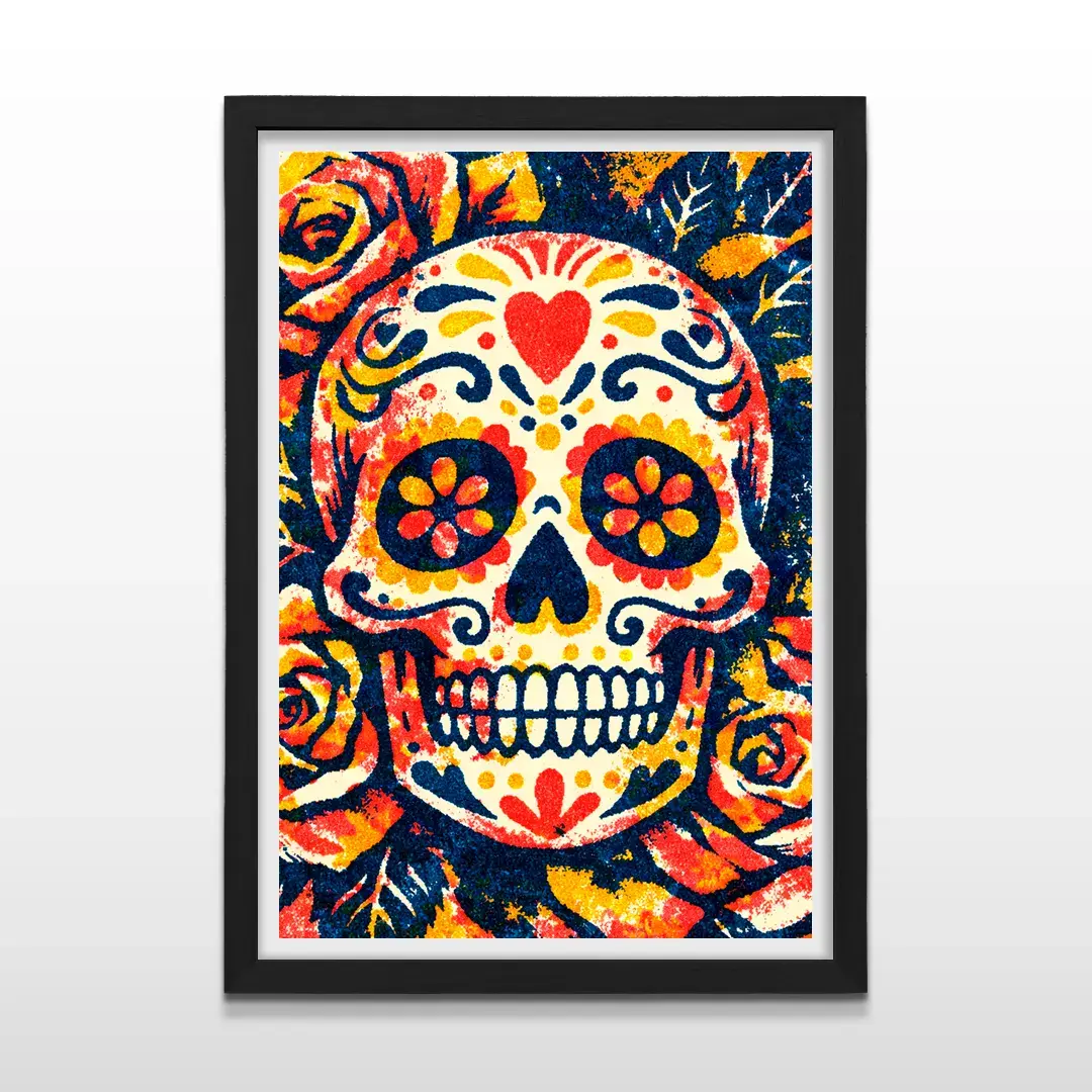 El cuadro Calavera Rosas es ideal para interiores que buscan una estética audaz y contemporánea, integrándose perfectamente en decoración moderna, ecléctica o de inspiración latinoamericana. Sus colores vibrantes y acabado premium permiten que combine con muebles neutros o espacios que necesitan un foco visual impactante, aportando dinamismo y calidez al entorno.