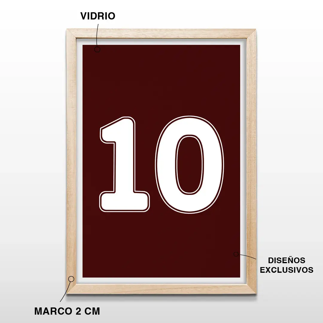 El cuadro decorativo Camiseta 10 Lanús traduce la identidad granate en una composición sobria y contundente, donde el número diez en blanco puro emerge con precisión sobre un fondo borravino intenso que remite de forma directa a la historia, el carácter y la mística del club. Su enfoque minimalista pone en primer plano el símbolo, logrando una pieza elegante que conecta emoción y diseño contemporáneo.