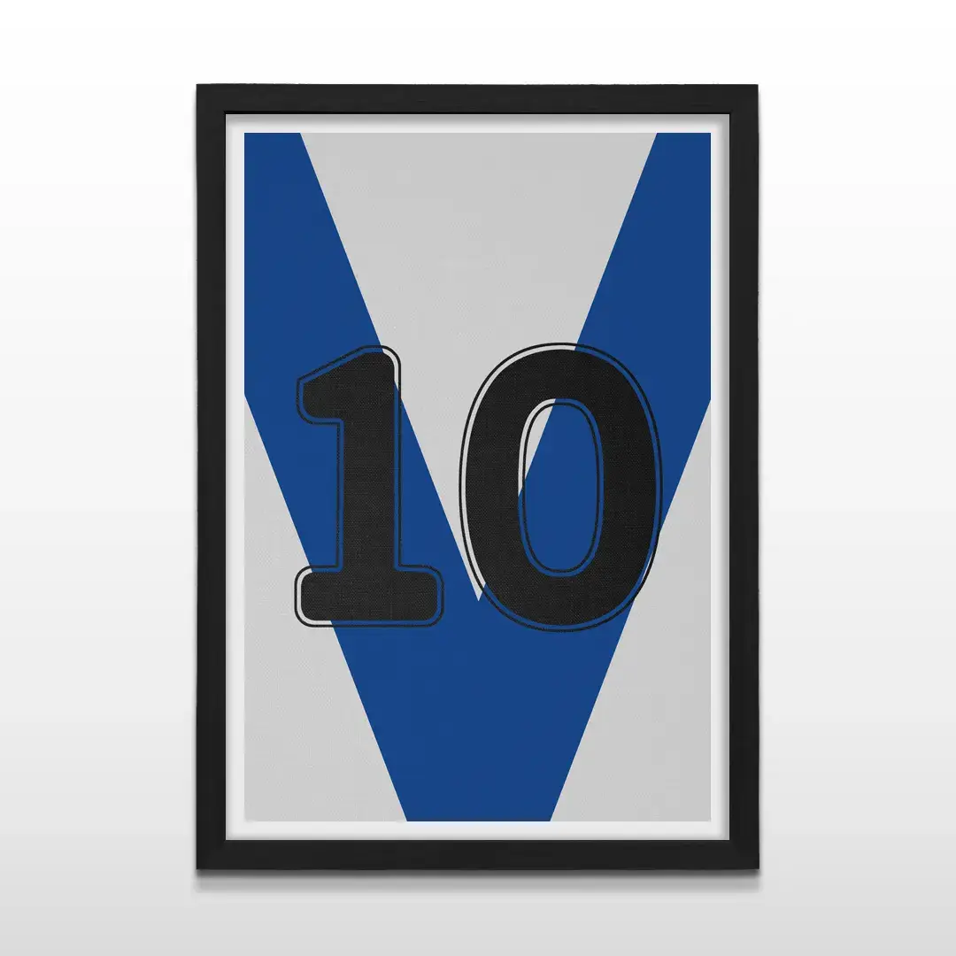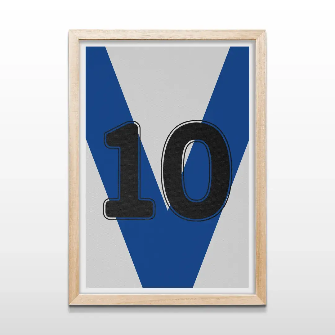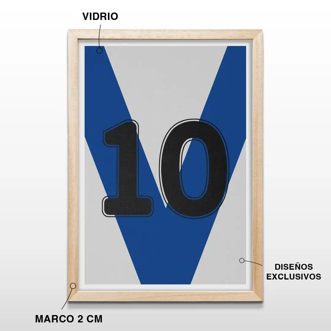 El cuadro decorativo “Camiseta 10 de Vélez” sintetiza la identidad del Fortín a través de una estética limpia y contemporánea, donde la icónica V azul se convierte en un símbolo de historia, carácter y excelencia deportiva. Esta pieza reinterpreta la herencia de Vélez Sarsfield desde el diseño, transformando un emblema futbolero en una obra visual pensada para perdurar.