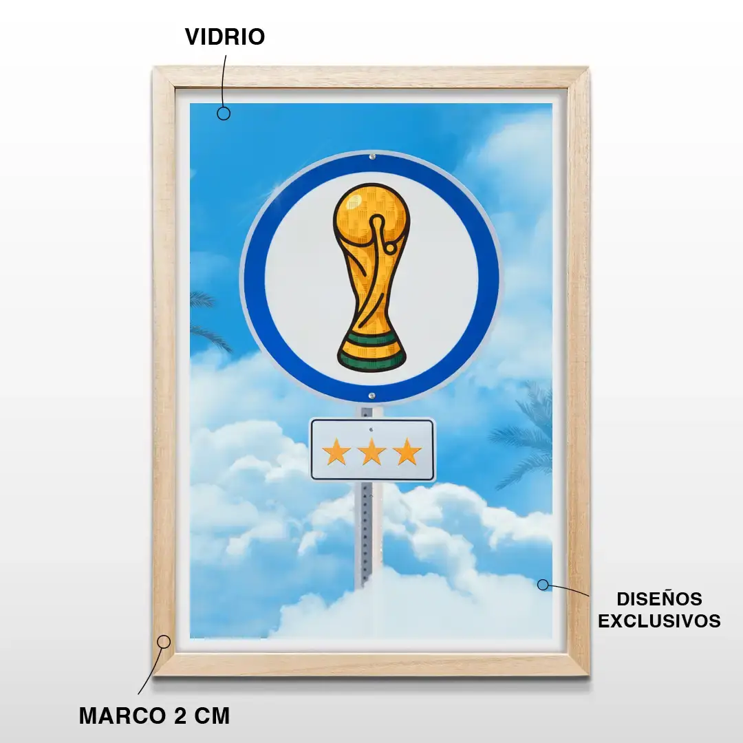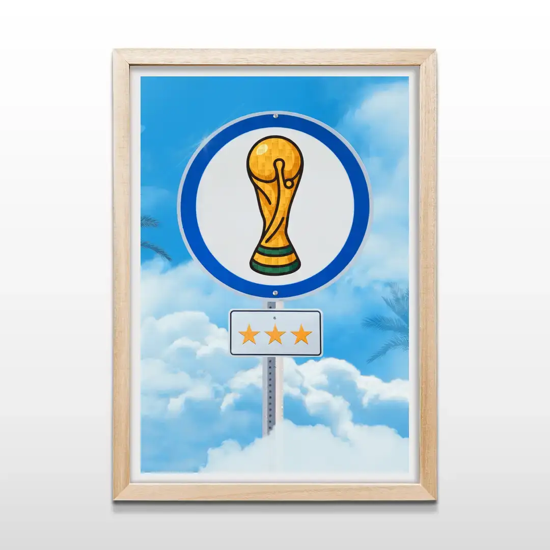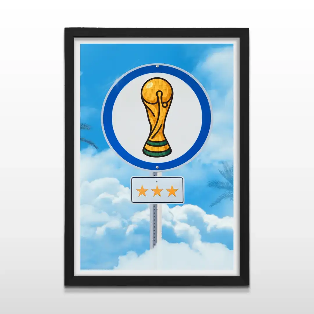 El cuadro decorativo Campeones del Mundo captura la euforia eterna de la consagración argentina con una composición de impronta pop contemporánea. La escena presenta una señal de tránsito intervenida donde la Copa del Mundo en dorado vibrante y las tres estrellas se elevan sobre un cielo azul profundo con nubes blancas, generando una imagen potente, simbólica y cargada de identidad nacional.