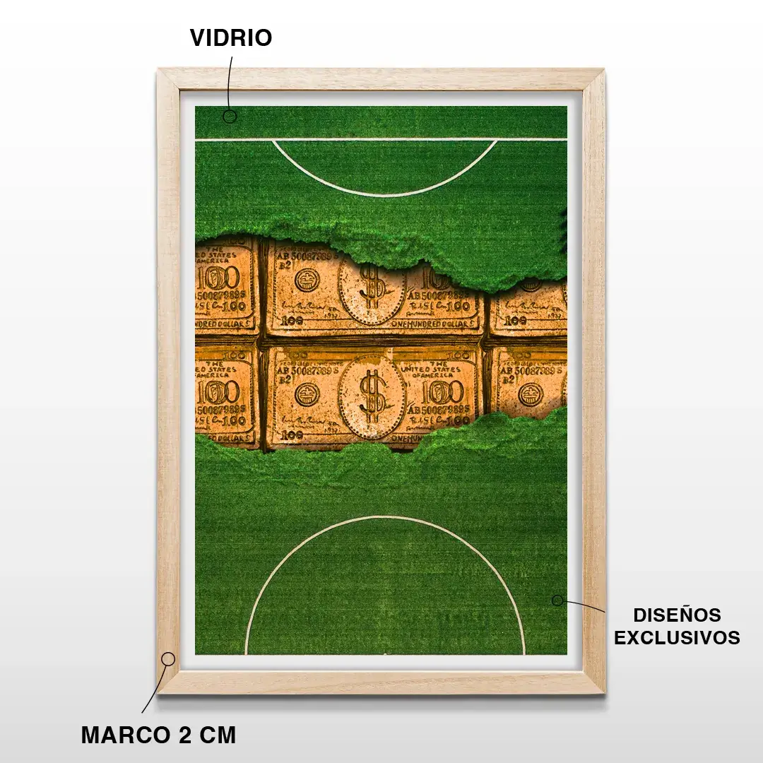 El cuadro decorativo Cancha Fútbol Kilates combina la épica del deporte con el simbolismo del éxito material en una composición de alto impacto visual. La obra presenta una cancha de fútbol de césped verde intenso intervenida por un efecto de rasgado central que revela lingotes de oro macizo, grabados con el número cien y el signo dólar, creando un contraste directo entre pasión, estrategia y recompensa.
