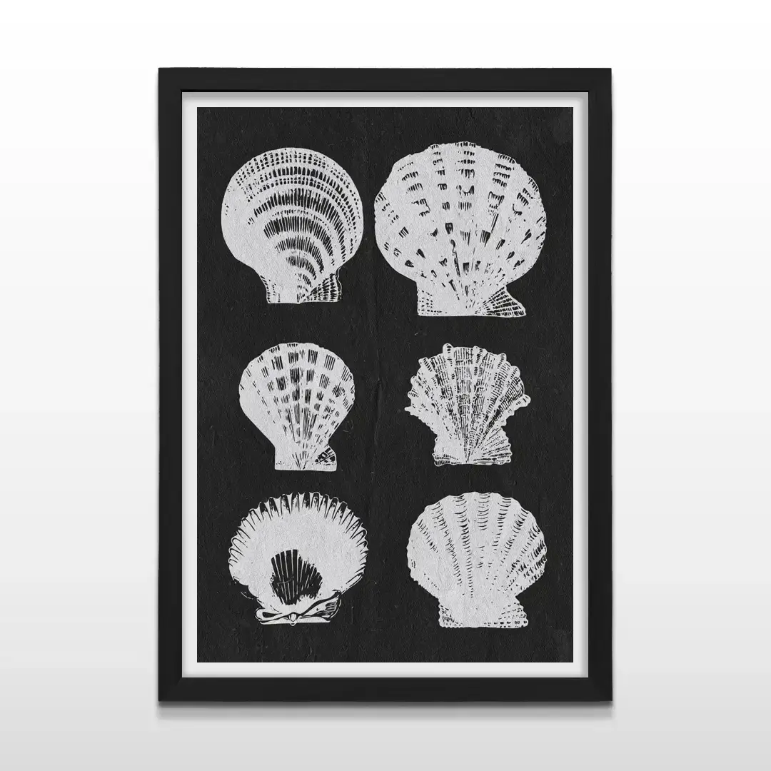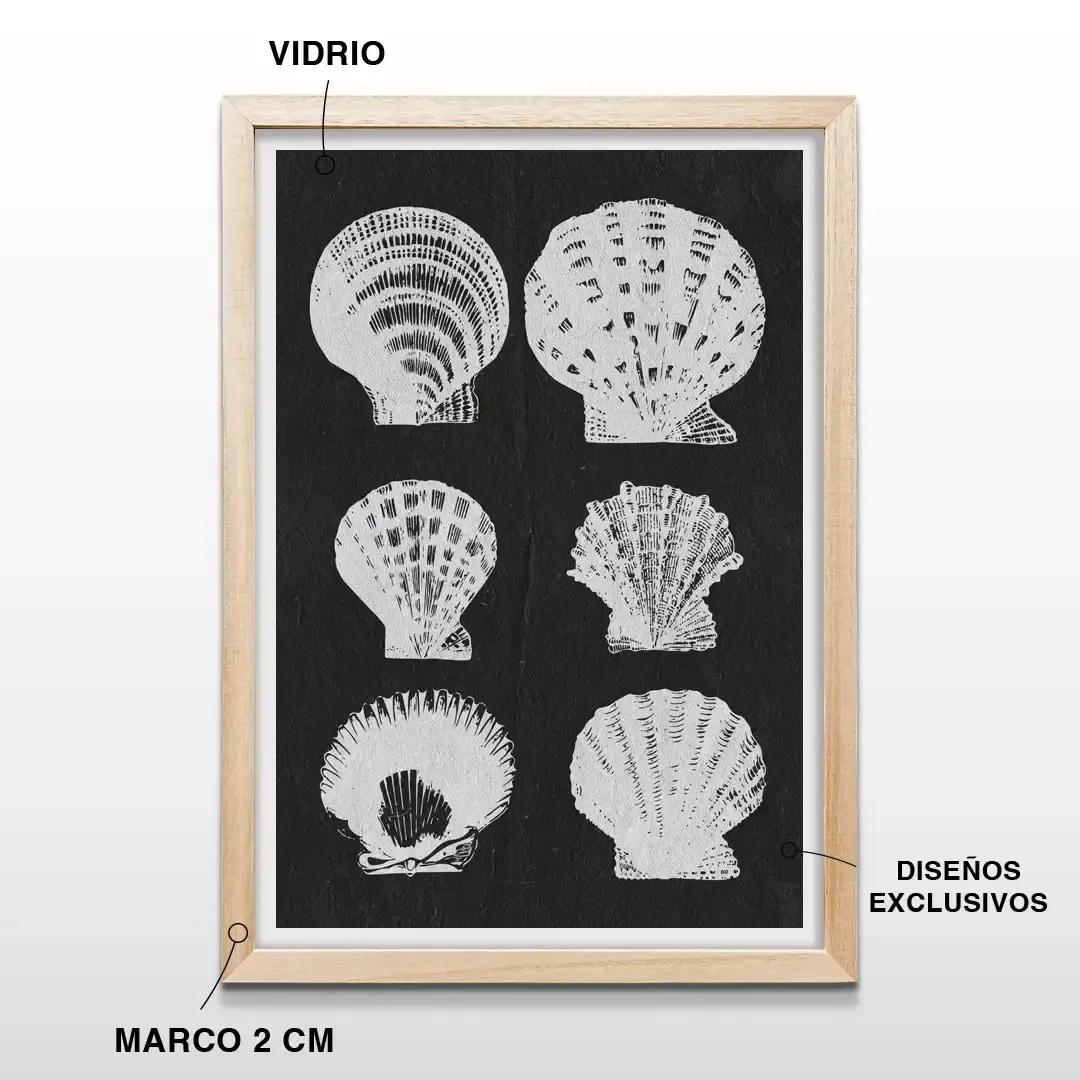 El cuadro decorativo Caracoles Abstractos presenta seis siluetas de caracoles y conchas marinas en blanco con efecto relieve, dispuestas sobre un fondo negro de textura fina que potencia el contraste y la profundidad visual. La composición monocromática resalta las formas orgánicas del océano desde una mirada contemporánea y depurada.