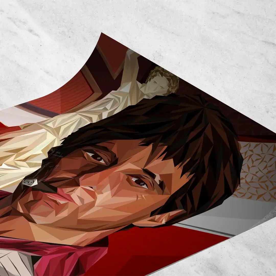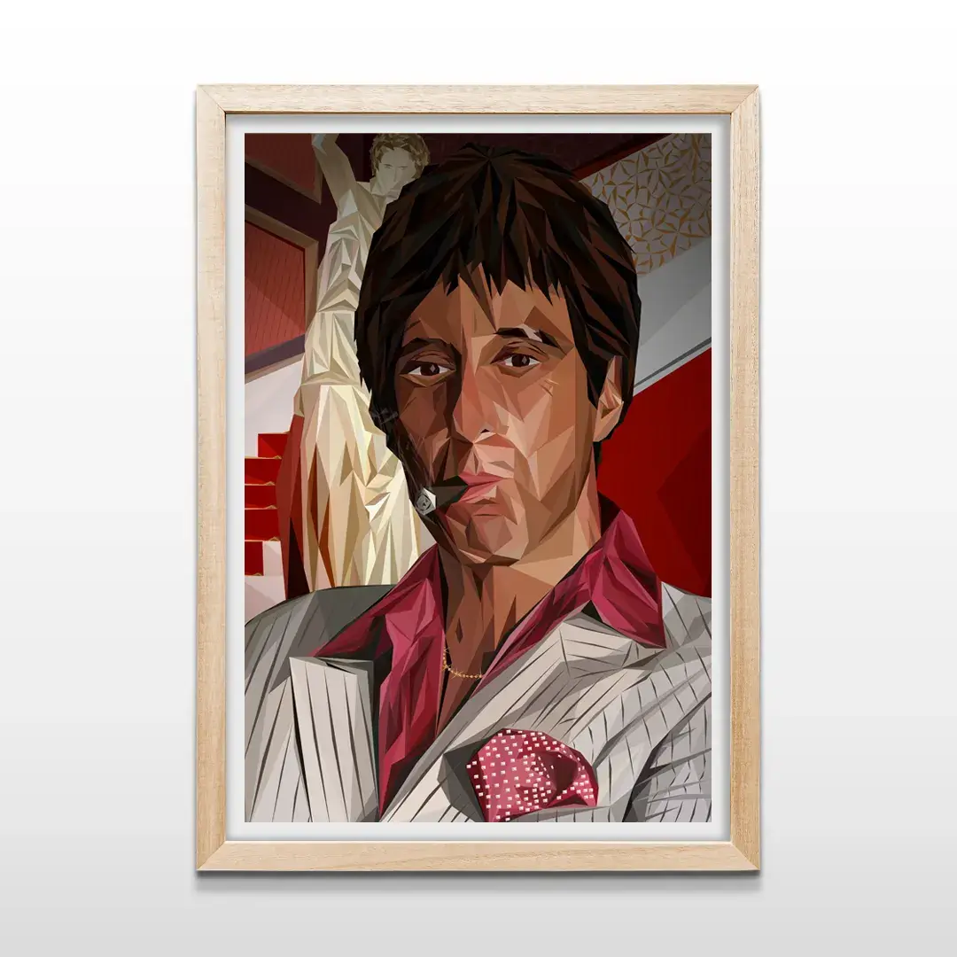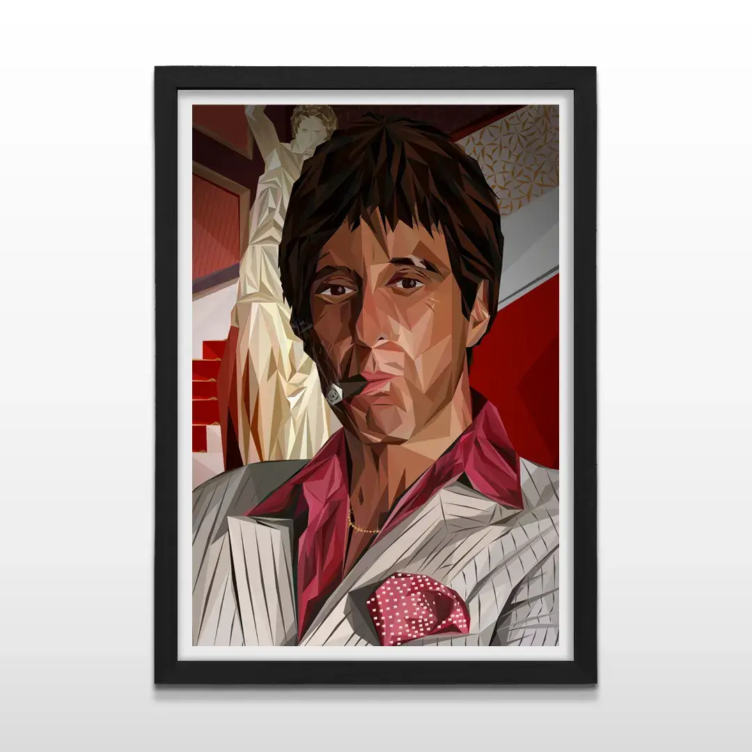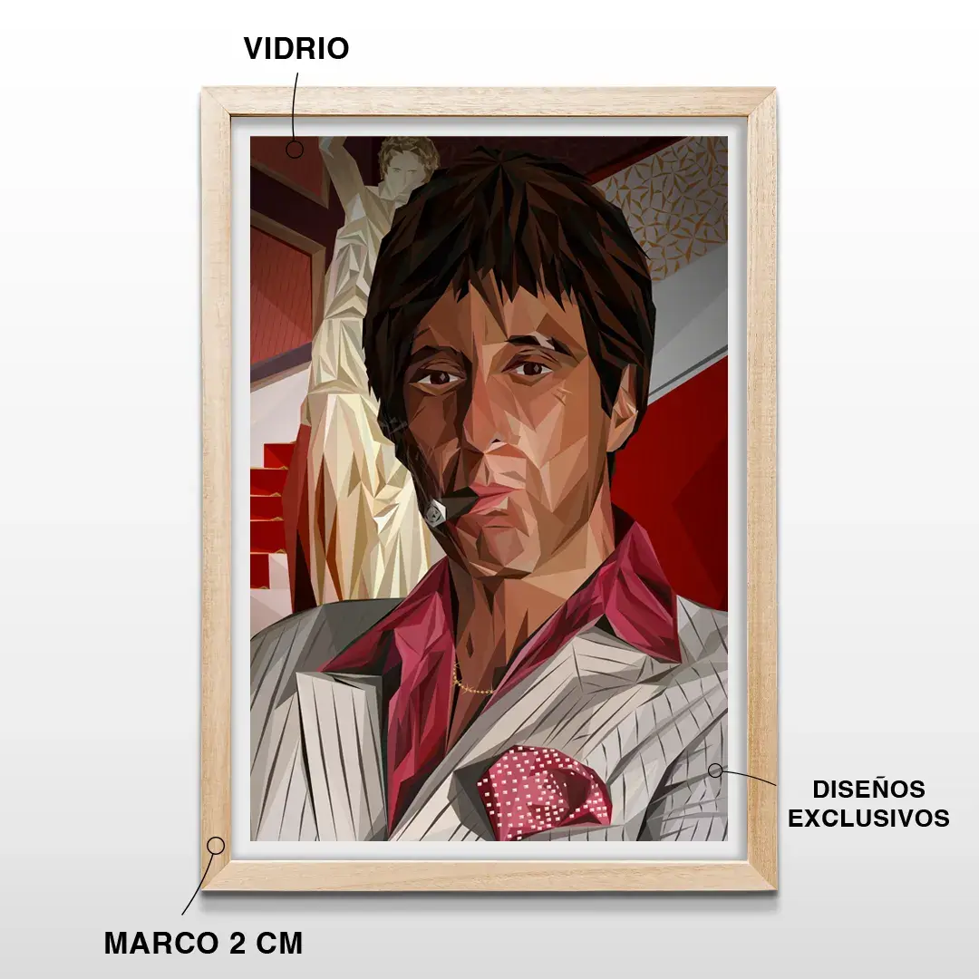 El cuadro decorativo Caracortada es una obra de arte moderno de estilo geométrico que reinterpreta al icónico Tony Montana desde una estética vanguardista y de alto impacto visual. El retrato facetado combina planos angulares precisos con una composición dramática que resalta el habano, el traje impecable y la expresión desafiante, evocando el ascenso al poder, la ambición y el control absoluto.