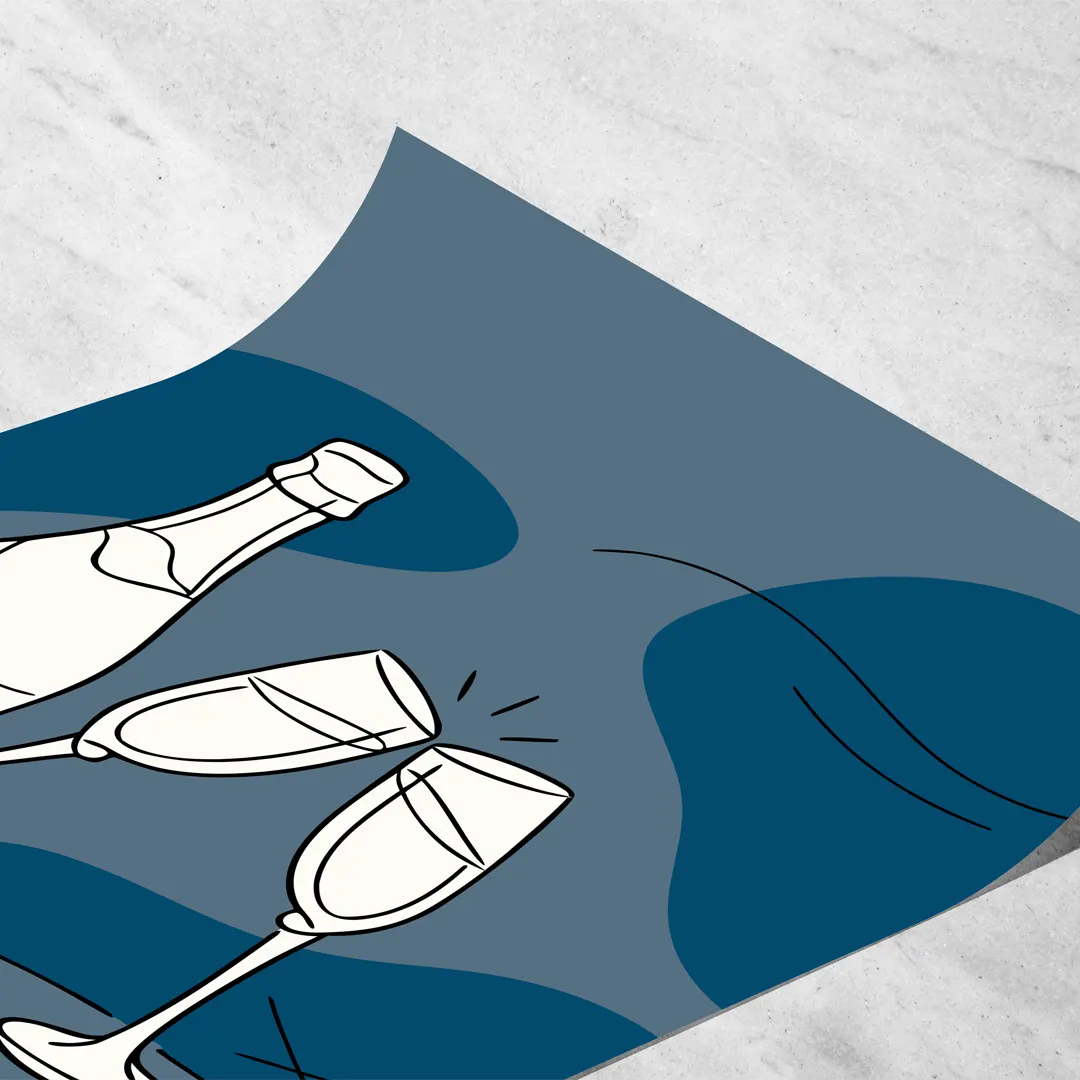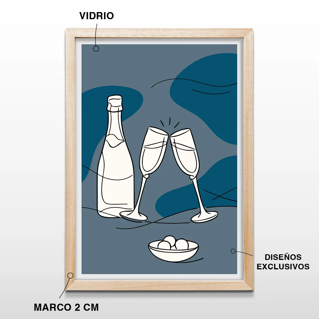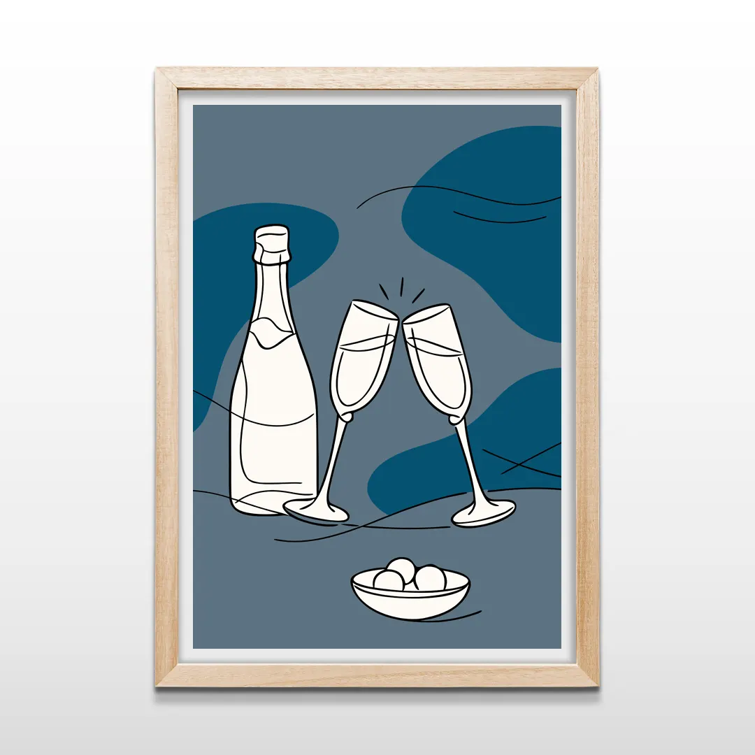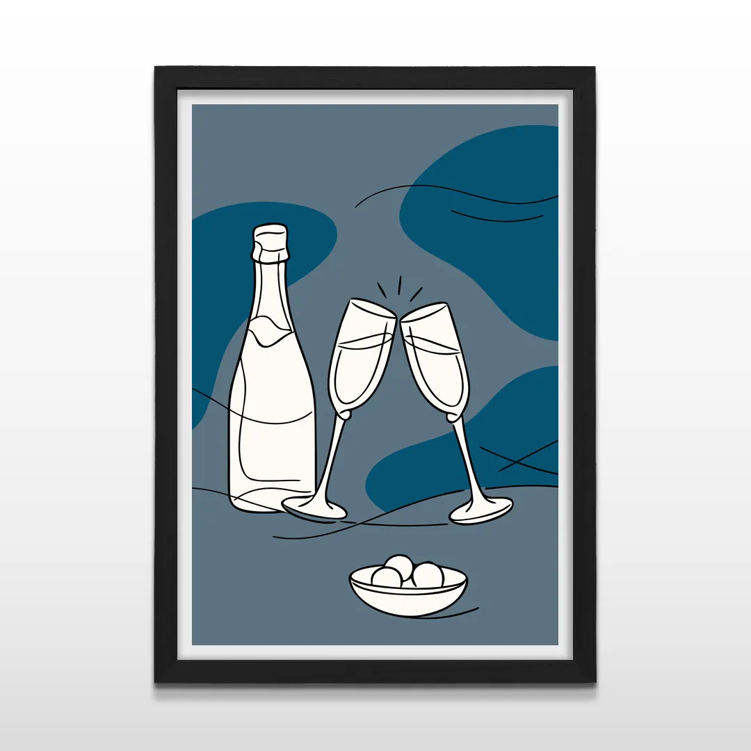El cuadro decorativo Champagne Night es una obra de arte moderno de estética minimalista que captura la intimidad de una noche serena marcada por el ritual del brindis. La composición se construye a partir de trazos lineales suaves que delinean una botella de champagne, dos copas enlazadas y un cuenco delicado, integrados sobre un fondo de formas orgánicas en tonos azul profundo y grises nocturnos que evocan calma, silencio y sofisticación.