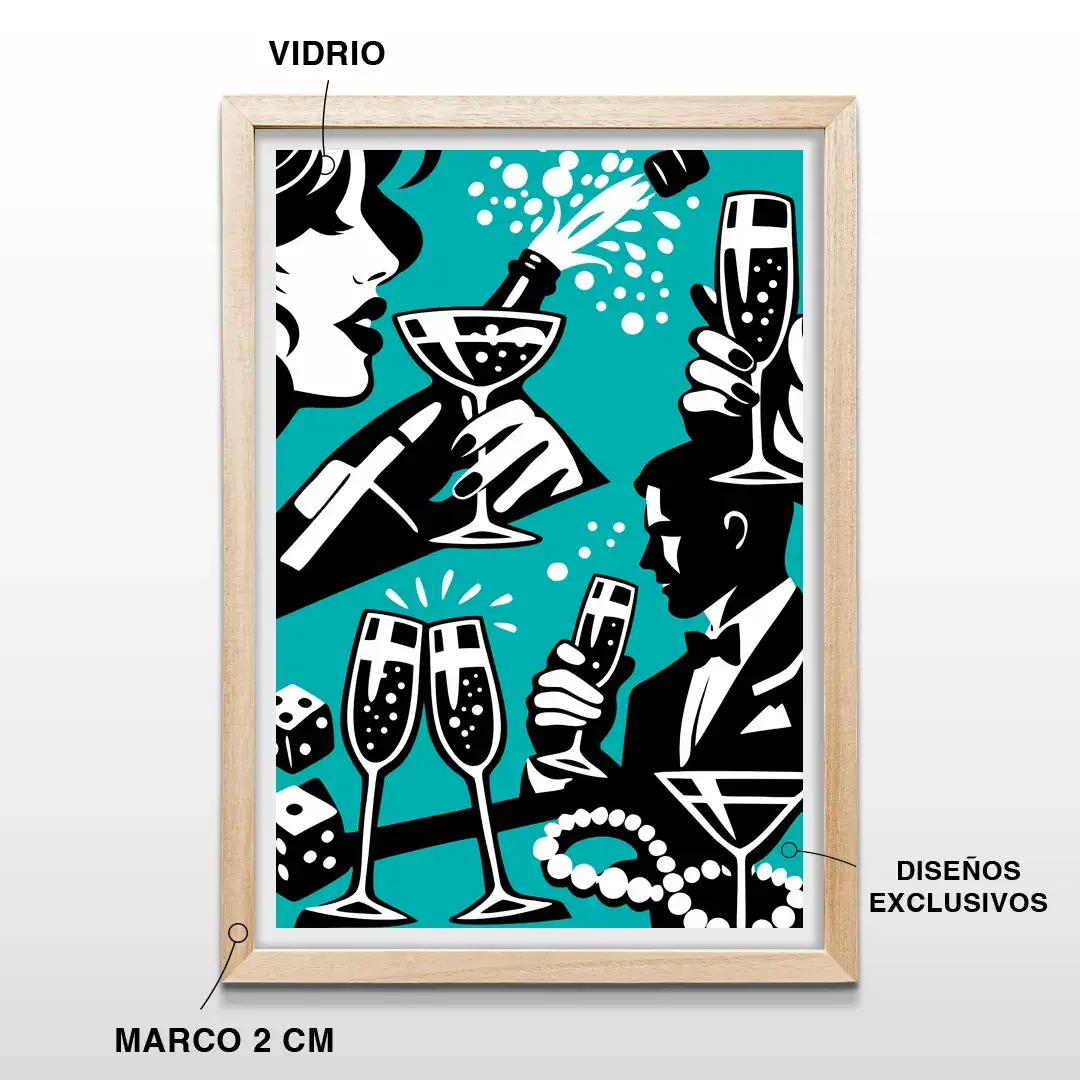 Este cuadro está pensado para barras de tragos hogareñas, livings de concepto abierto, espacios de entretenimiento o departamentos modernos donde la socialización y el disfrute ocupan un lugar central. Aporta carácter, conversación y una sensación constante de celebración bien entendida, ligada al buen gusto y la vida nocturna elegante.