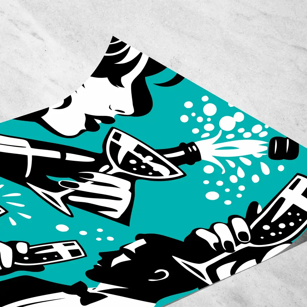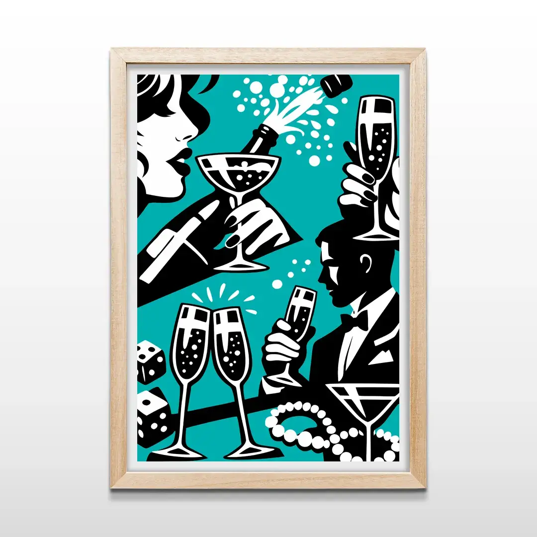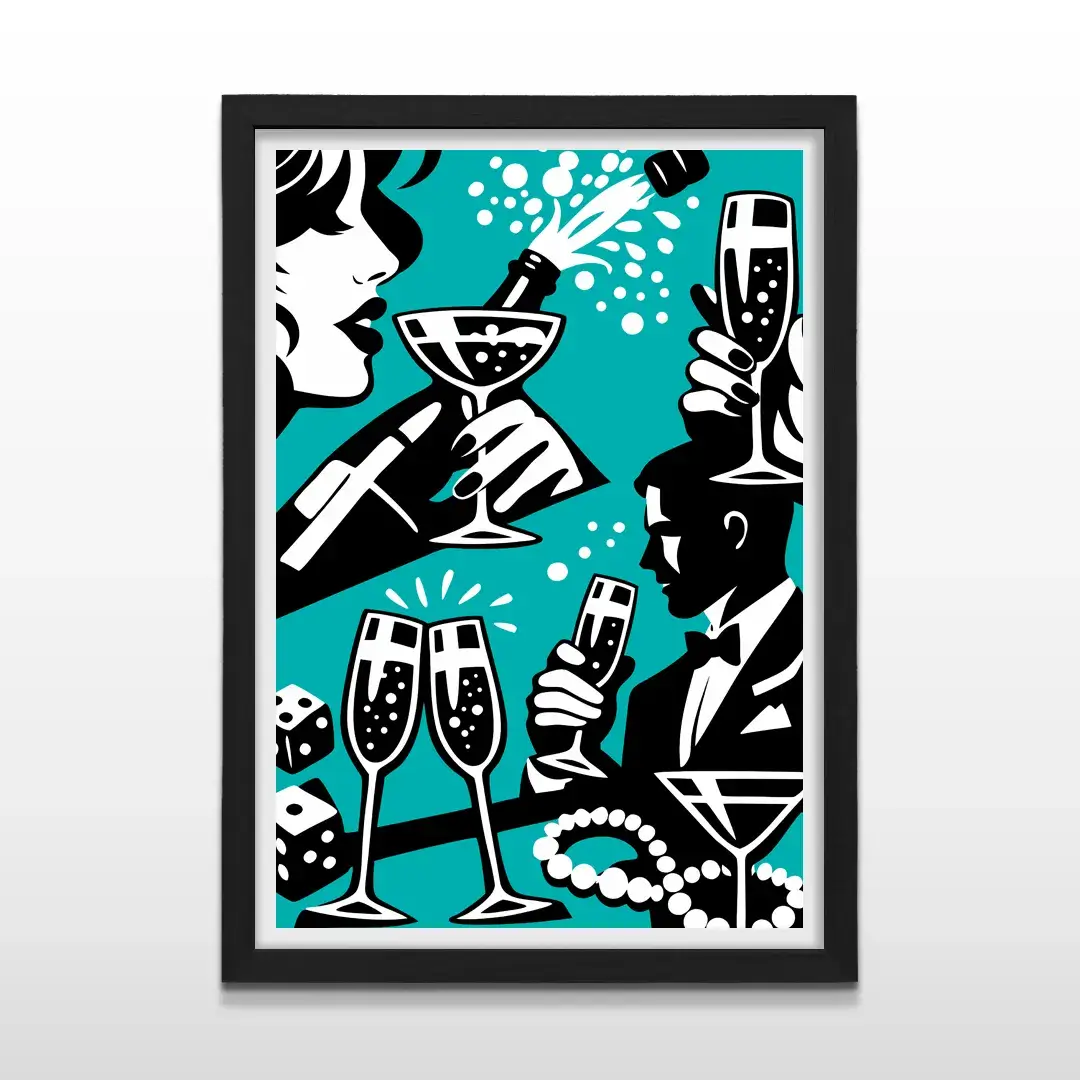 El cuadro decorativo Champagne Party es una pieza de arte moderno de fuerte impronta social que celebra el ritual del éxito y la celebración. La ilustración combina alto contraste en turquesa, blanco y negro, donde el descorche de una botella de champagne se convierte en el gesto central de una noche marcada por copas rebosantes, dados de la suerte y collares de perlas, símbolos clásicos de lujo, juego y estatus.