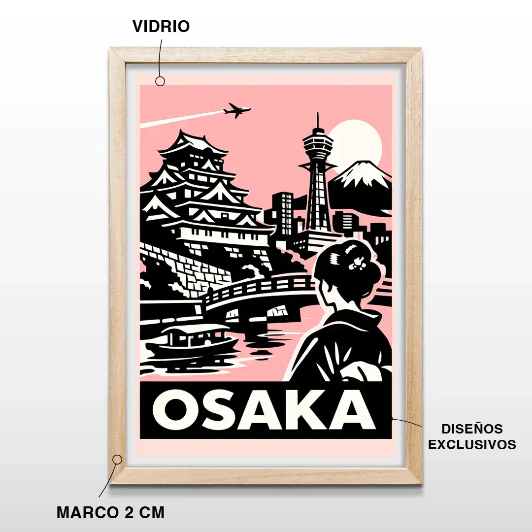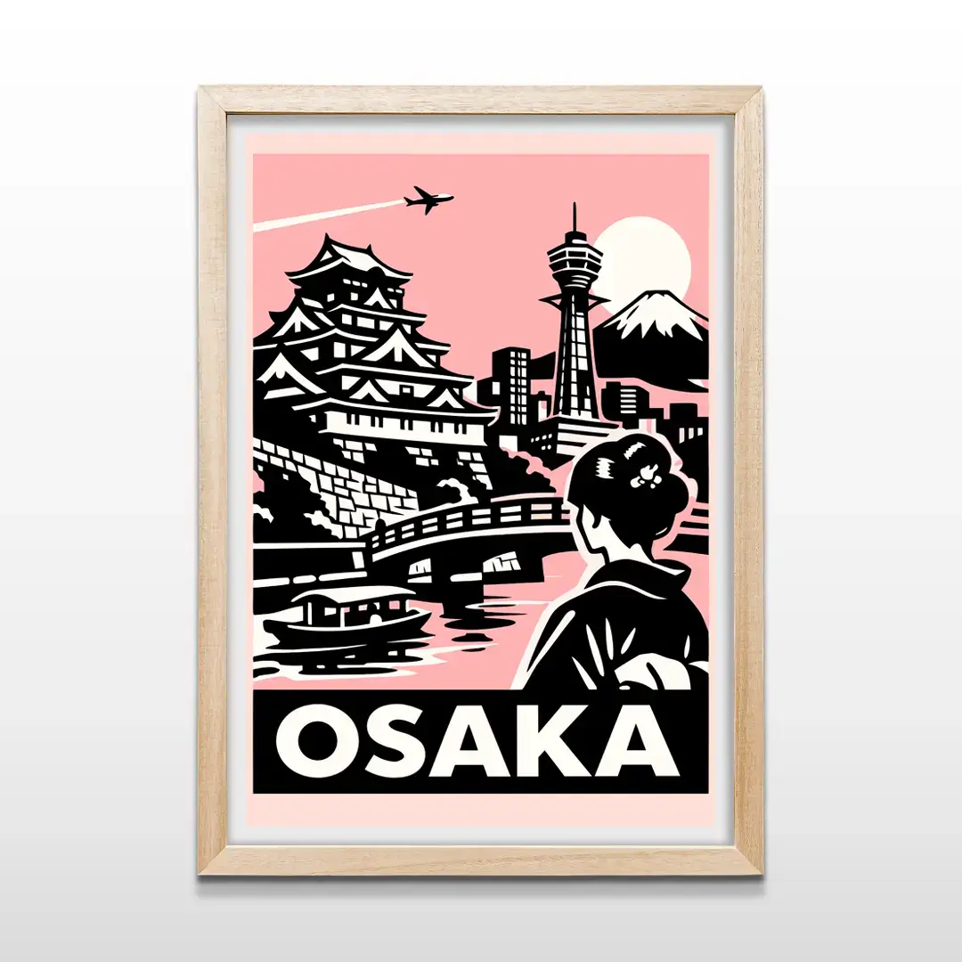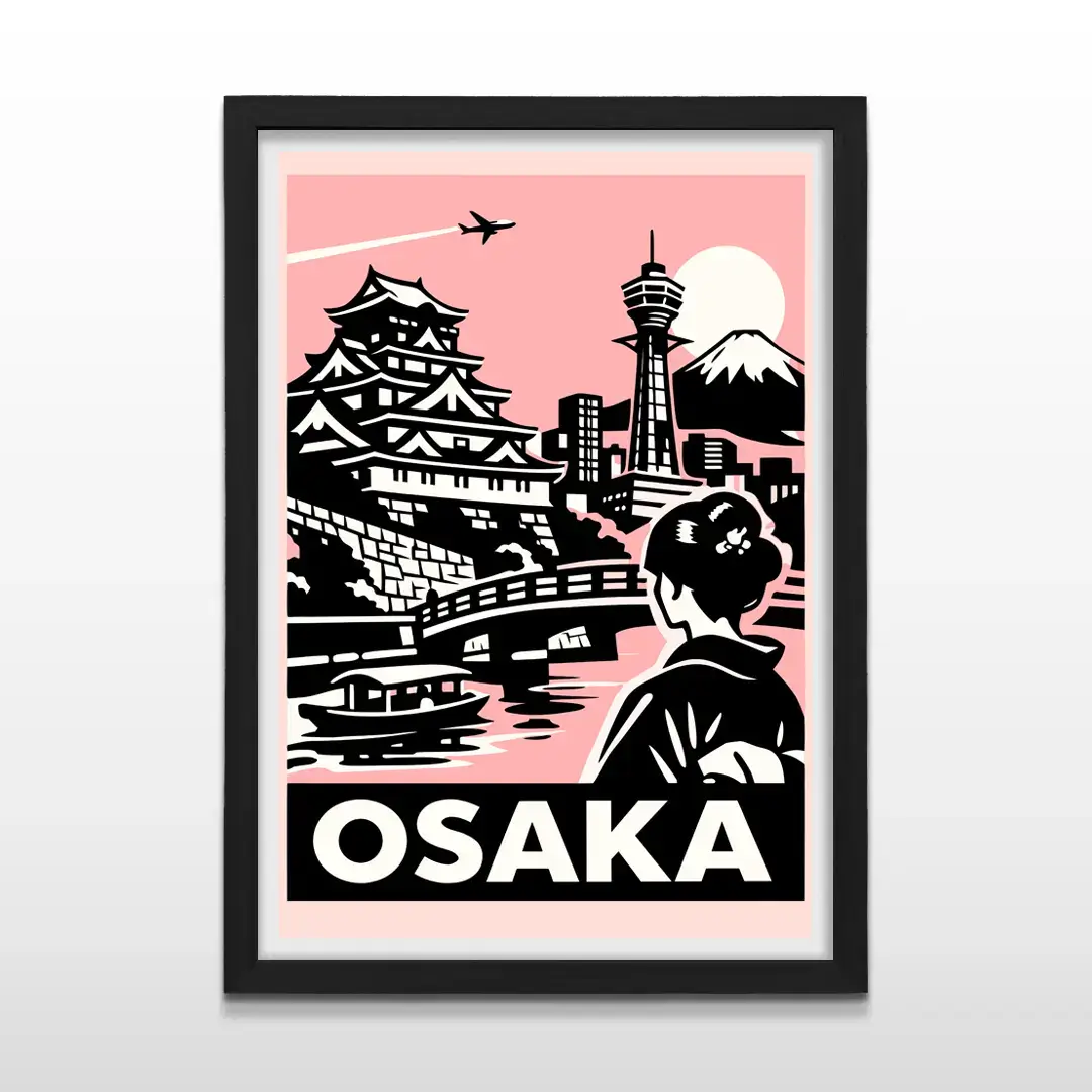 El cuadro decorativo Ciudad de Osaka representa un paisaje icónico de Japón a través de una ilustración retro minimalista que fusiona arquitectura histórica y símbolos culturales. La composición incluye la silueta de un castillo tradicional japonés, la torre Tsutenkaku, el Monte Fuji y el sol naciente, acompañados por la figura femenina con vestimenta tradicional, todo en una paleta armónica de rosa pastel, blanco y negro.