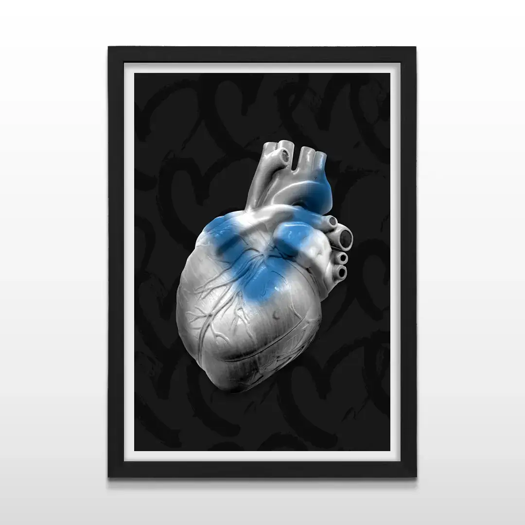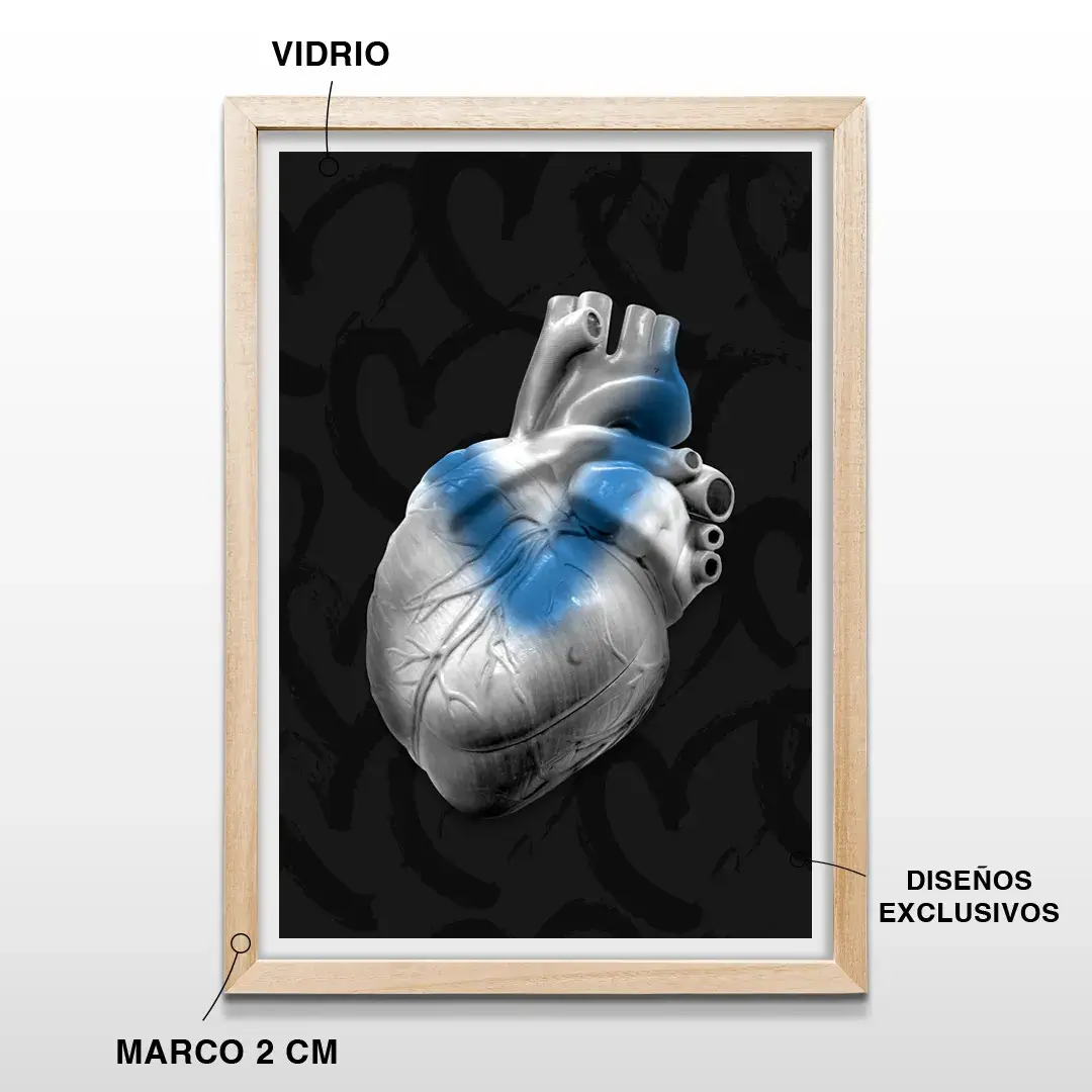El cuadro decorativo Corazón Fortín es una pieza de arte anatómico contemporáneo que interpreta la identidad de Vélez Sarsfield desde una estética sobria, moderna y profundamente simbólica. La imagen presenta un corazón humano hiperrealista atravesado por la inconfundible “V” azul, destacándose con precisión sobre un fondo negro profundo que potencia el contraste y la fuerza visual de la composición.