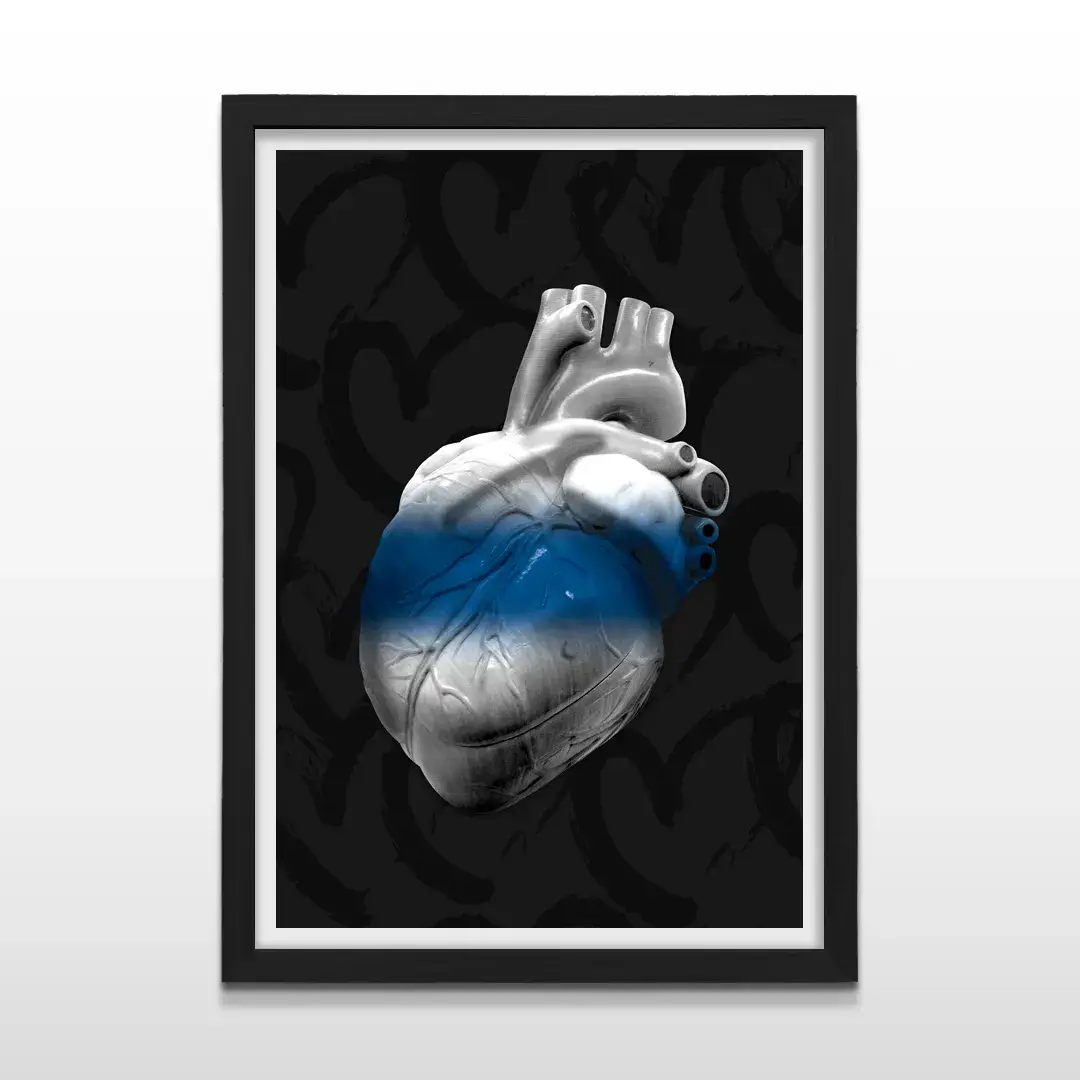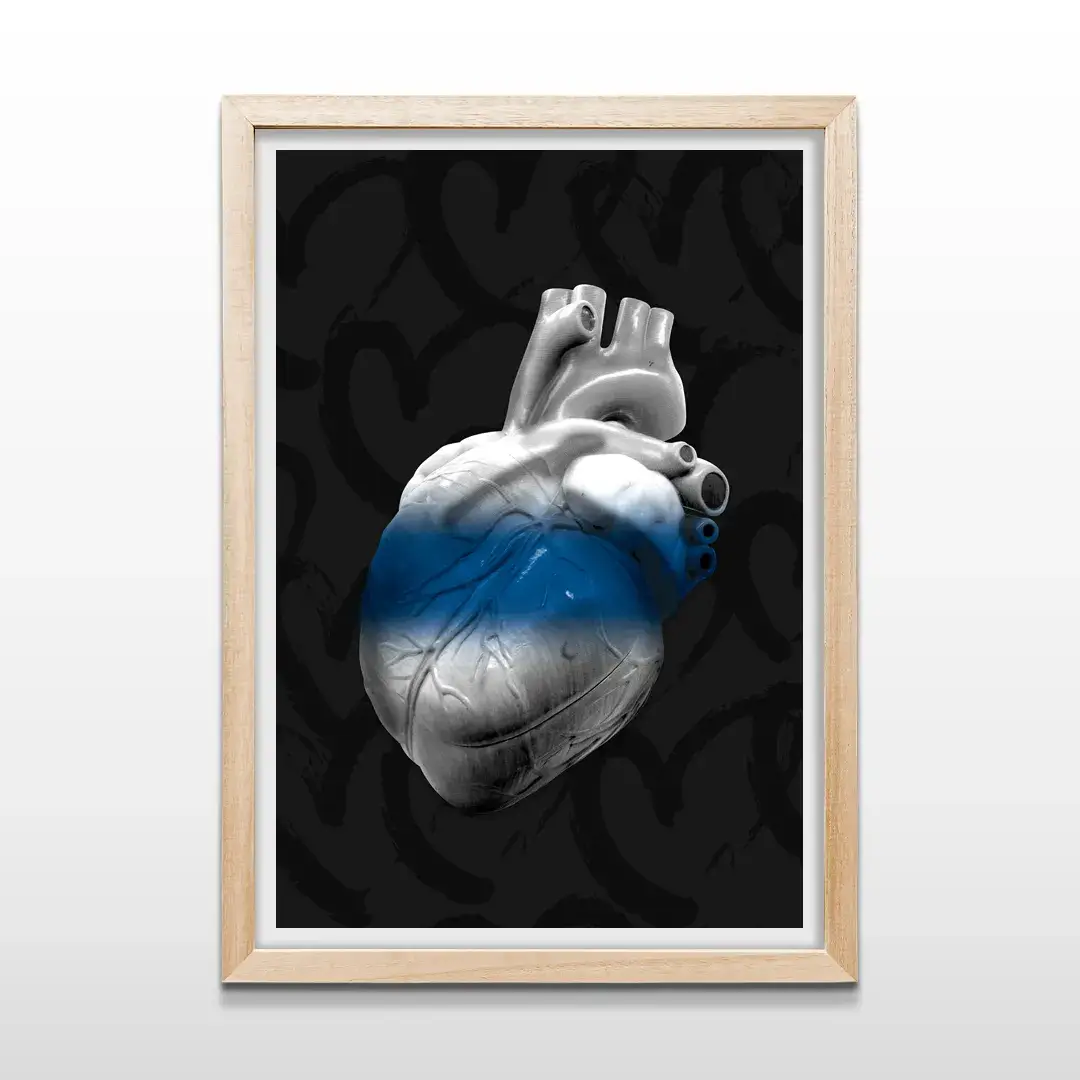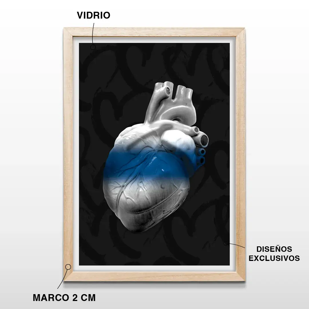 El cuadro decorativo Corazón Lobo es una obra de arte anatómico contemporáneo que expresa la identidad visceral de Gimnasia y Esgrima La Plata desde una estética cruda y elegante. La pieza muestra un corazón humano hiperrealista intervenido por la icónica franja azul, suspendido sobre un fondo negro profundo con grafismos sutiles que refuerzan el pulso emocional del club y su mística ligada al Bosque.