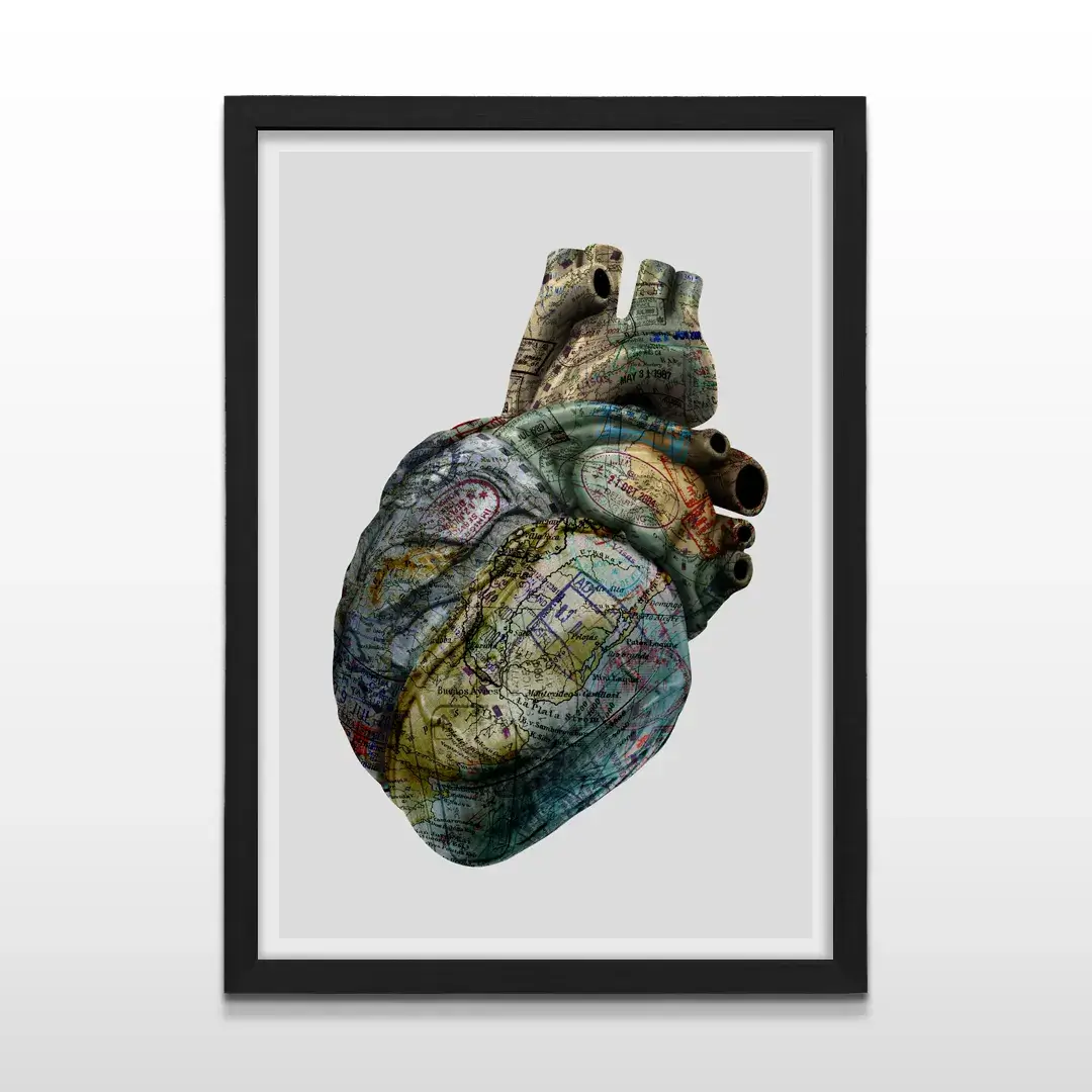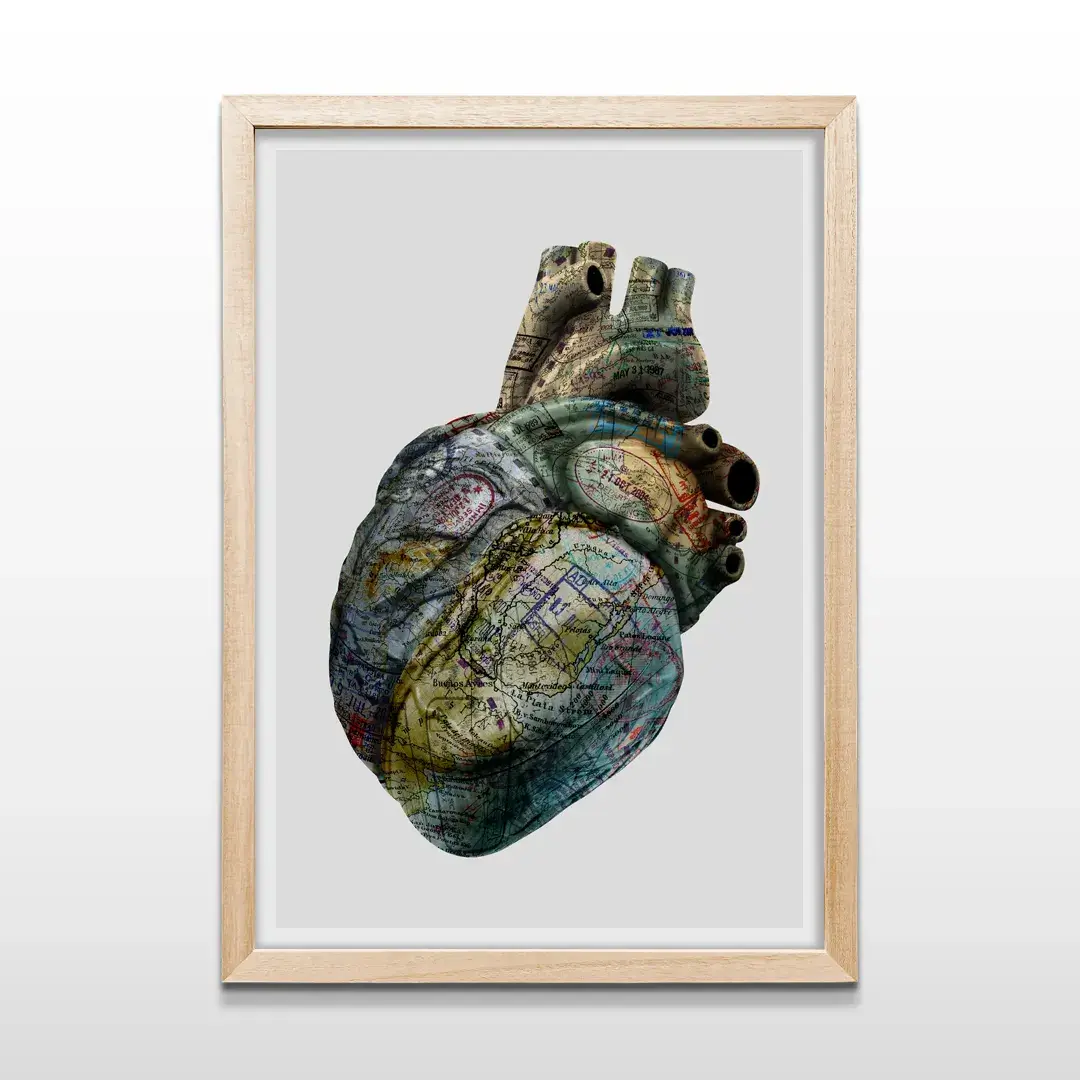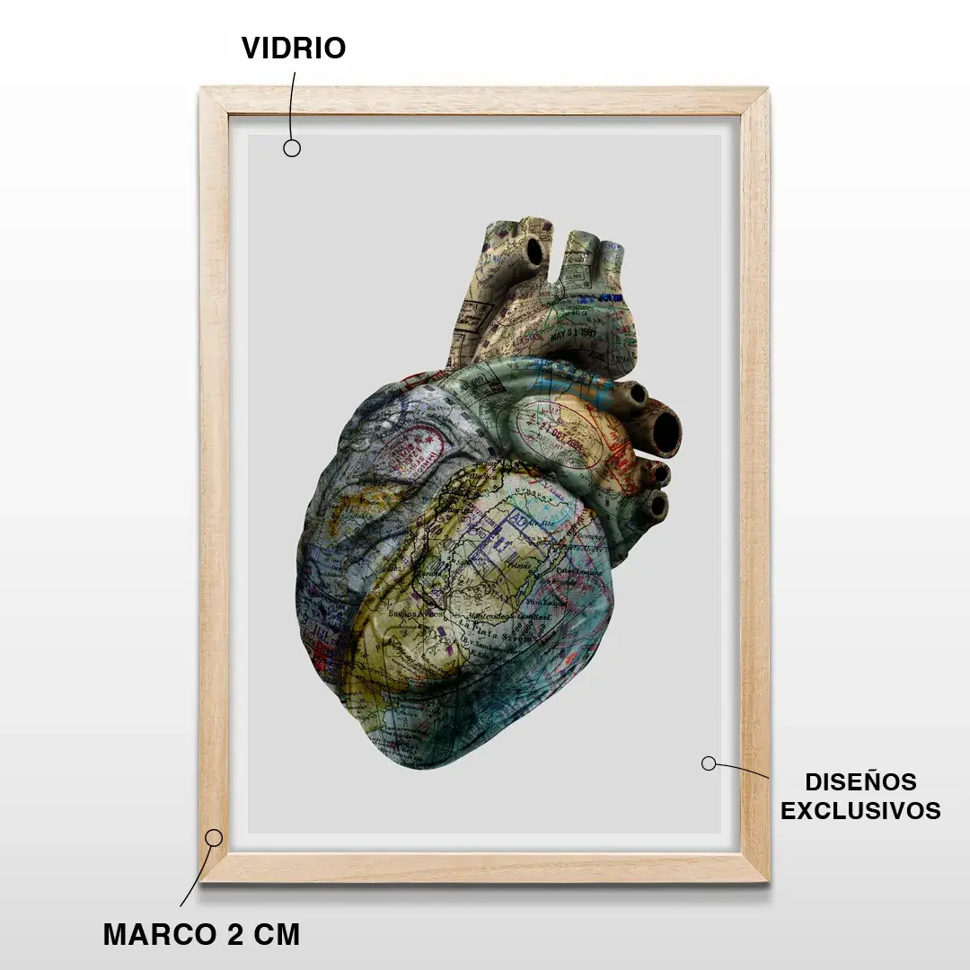 El cuadro decorativo Corazón Viajero es una obra artística que combina anatomía y geografía, perfecta para quienes sienten pasión por explorar el mundo. Presenta un corazón humano detallado, revestido con un mapamundi vintage donde cada arteria conecta con fronteras distintas, complementado con sellos postales y texturas de papel antiguo que realzan su estilo único y sofisticado.