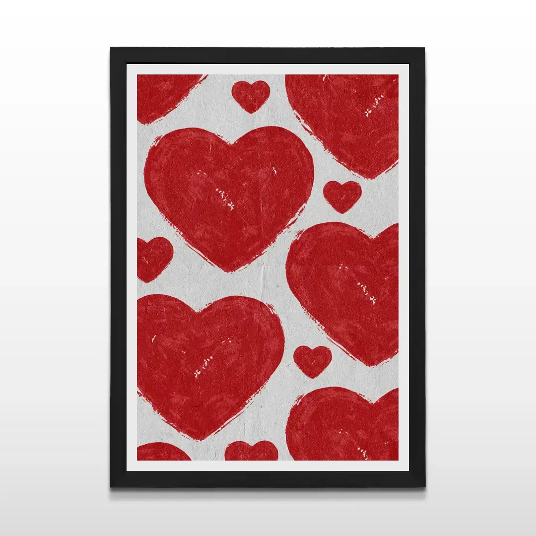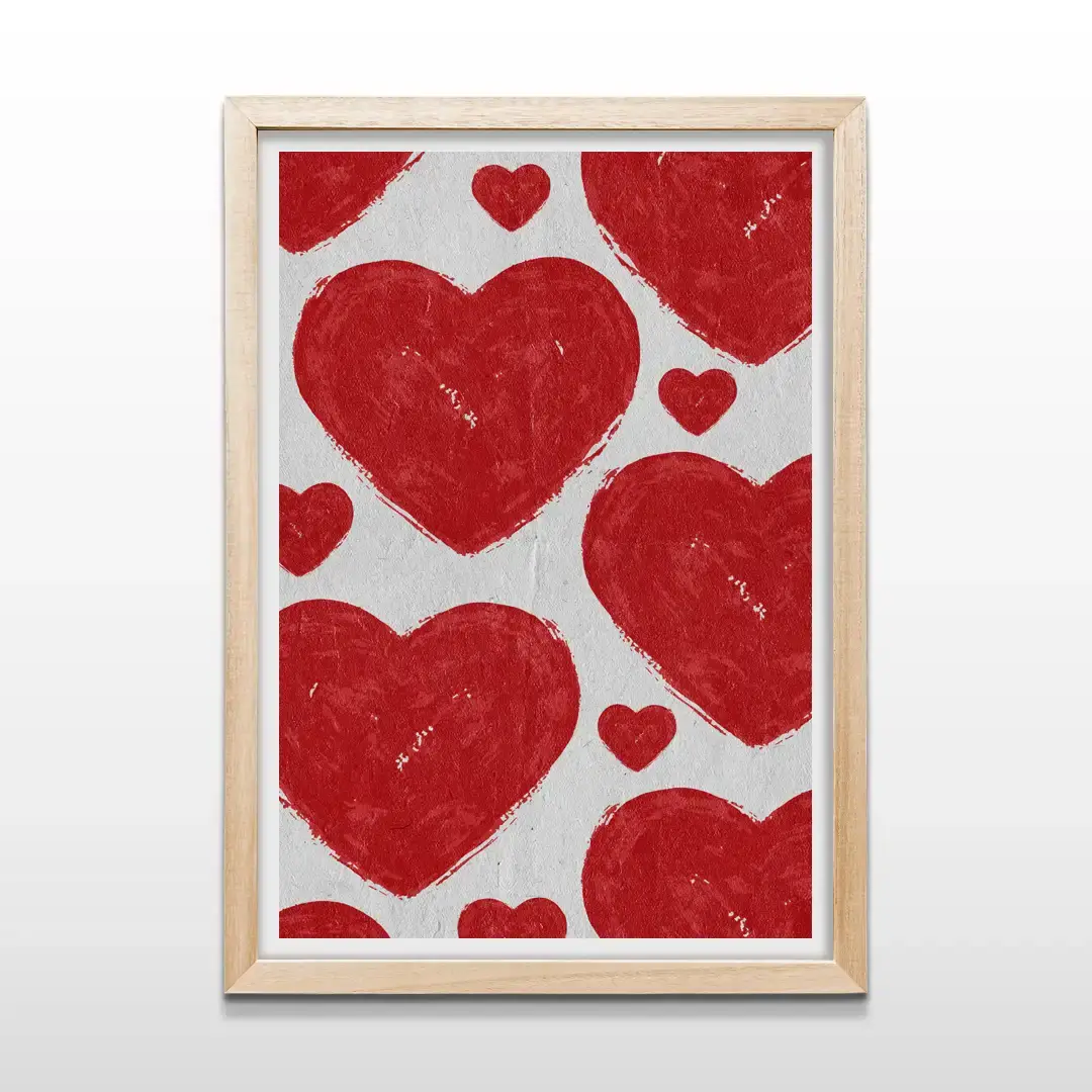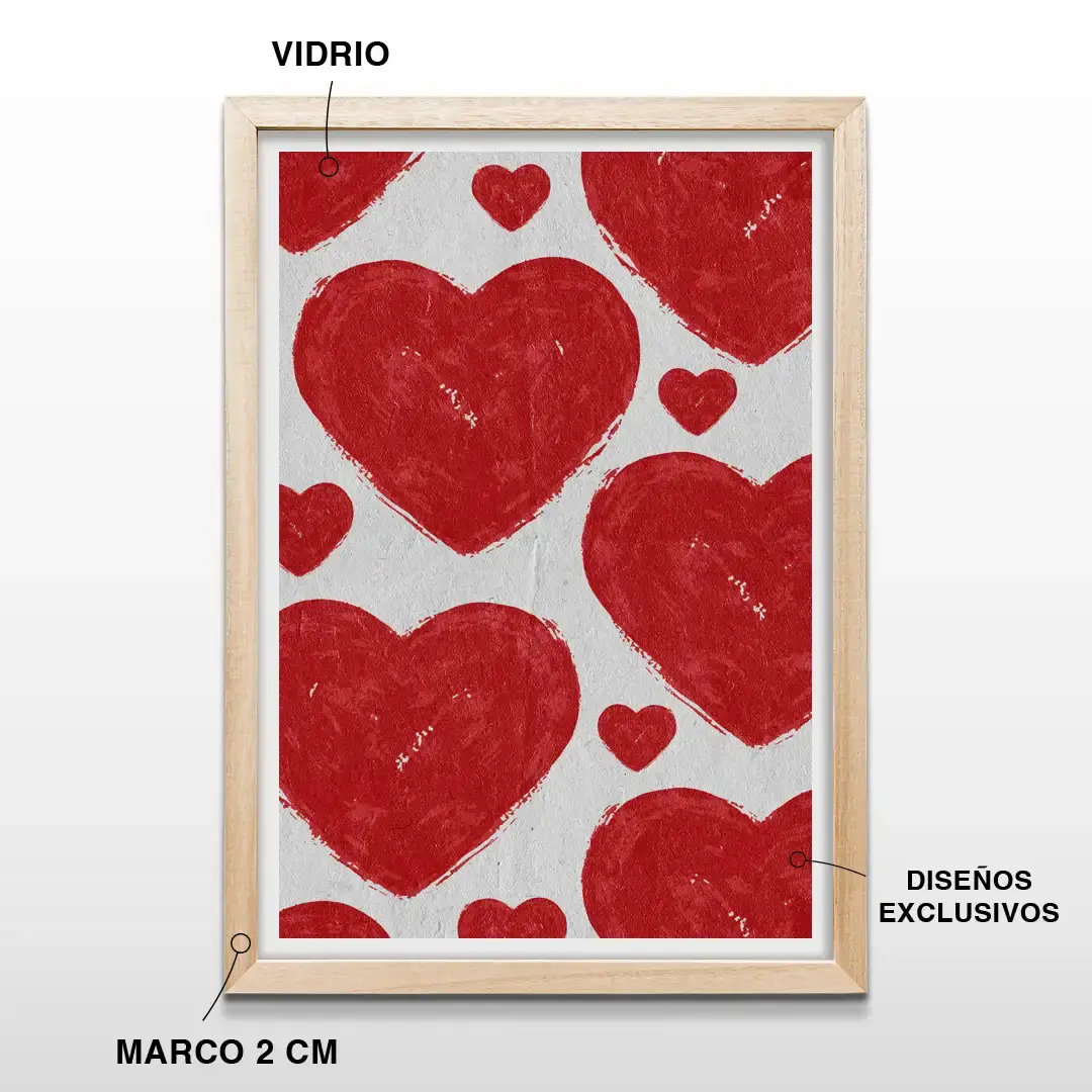 El cuadro decorativo Corazones propone una composición visual ligera donde múltiples corazones en tonos rojos se distribuyen con ritmo sobre un fondo blanco limpio. La variación de tamaños y matices genera movimiento y profundidad dentro de un lenguaje de arte gráfico moderno y decoración romántica minimalista.