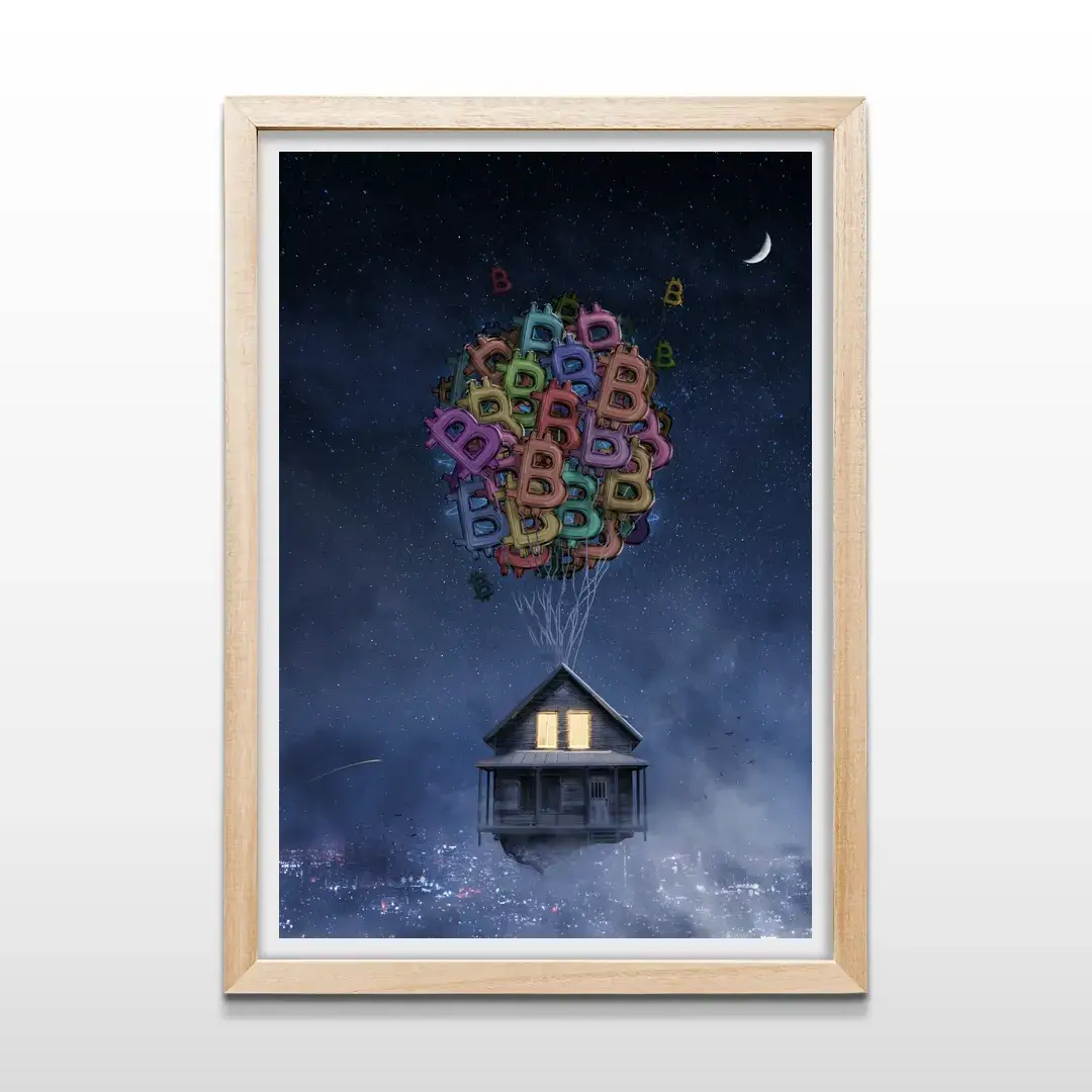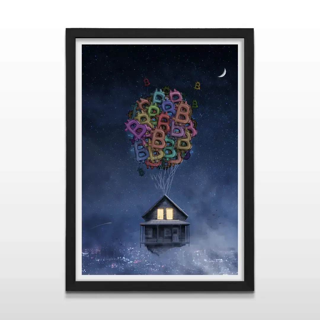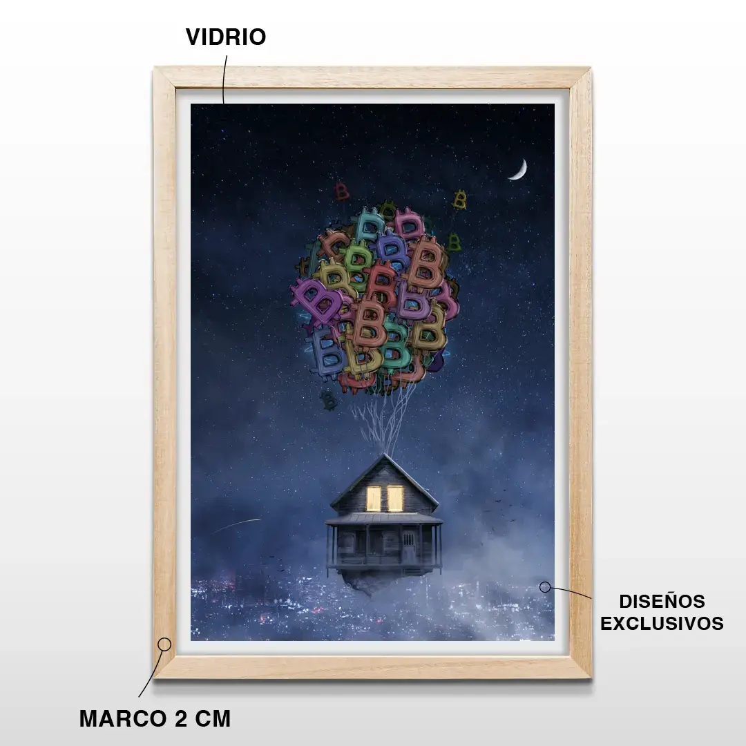 El cuadro decorativo Cripto Por Las Nubes es una pieza de arte digital surrealista con una fuerte narrativa visual que conecta el mundo cripto con la idea de libertad financiera. La escena muestra una casa iluminada flotando sobre una ciudad nocturna, sostenida por un conjunto de globos de colores con el símbolo de Bitcoin, bajo una luna creciente que refuerza la sensación de ascenso, visión y nuevo comienzo.