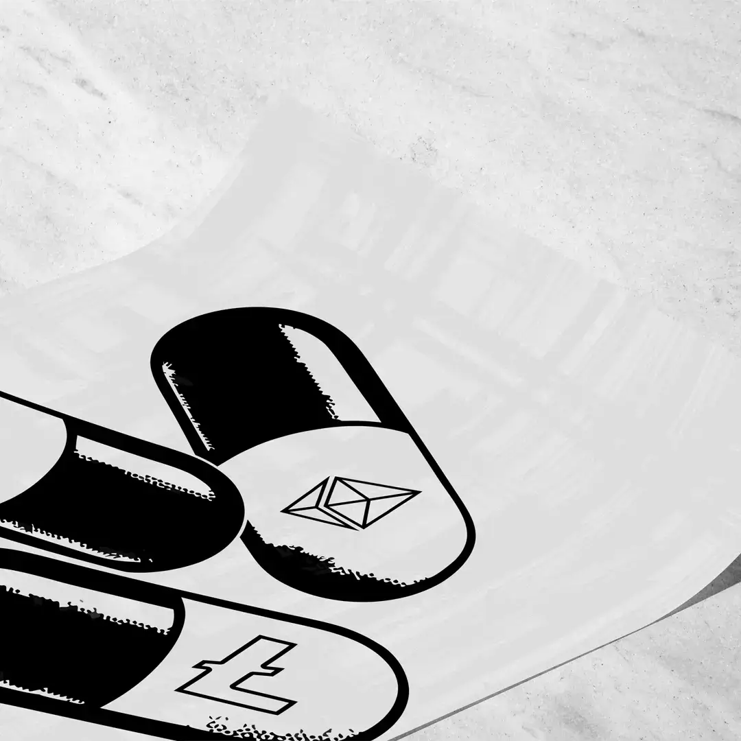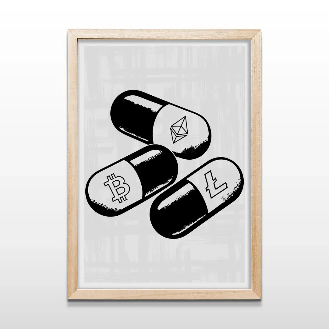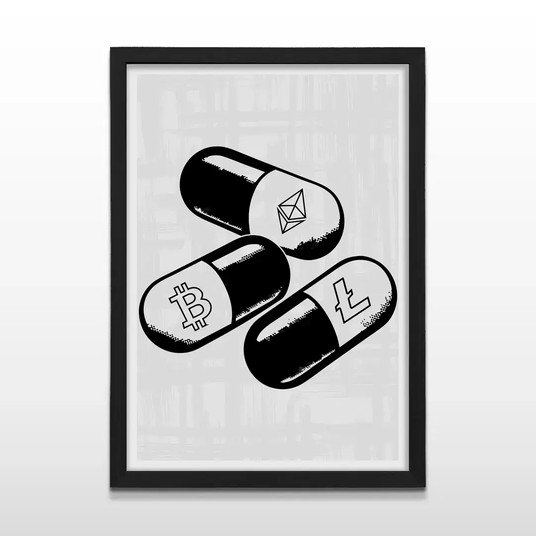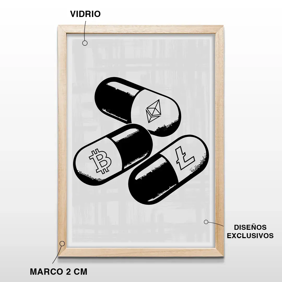 Crypto Dosis es un cuadro decorativo moderno de estética minimalista y conceptual que traduce el universo cripto en un lenguaje visual sobrio y potente. La composición presenta tres cápsulas de alto contraste que encapsulan a Bitcoin, Ethereum y Litecoin, suspendidas sobre un fondo gris texturizado que remite a la precisión, la lógica y la estabilidad del entorno tecnológico.