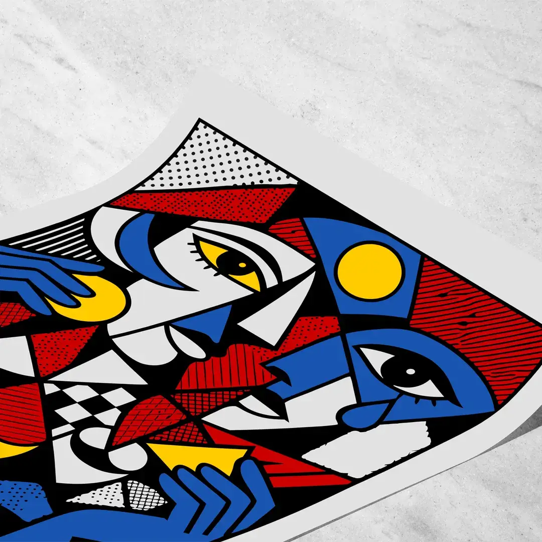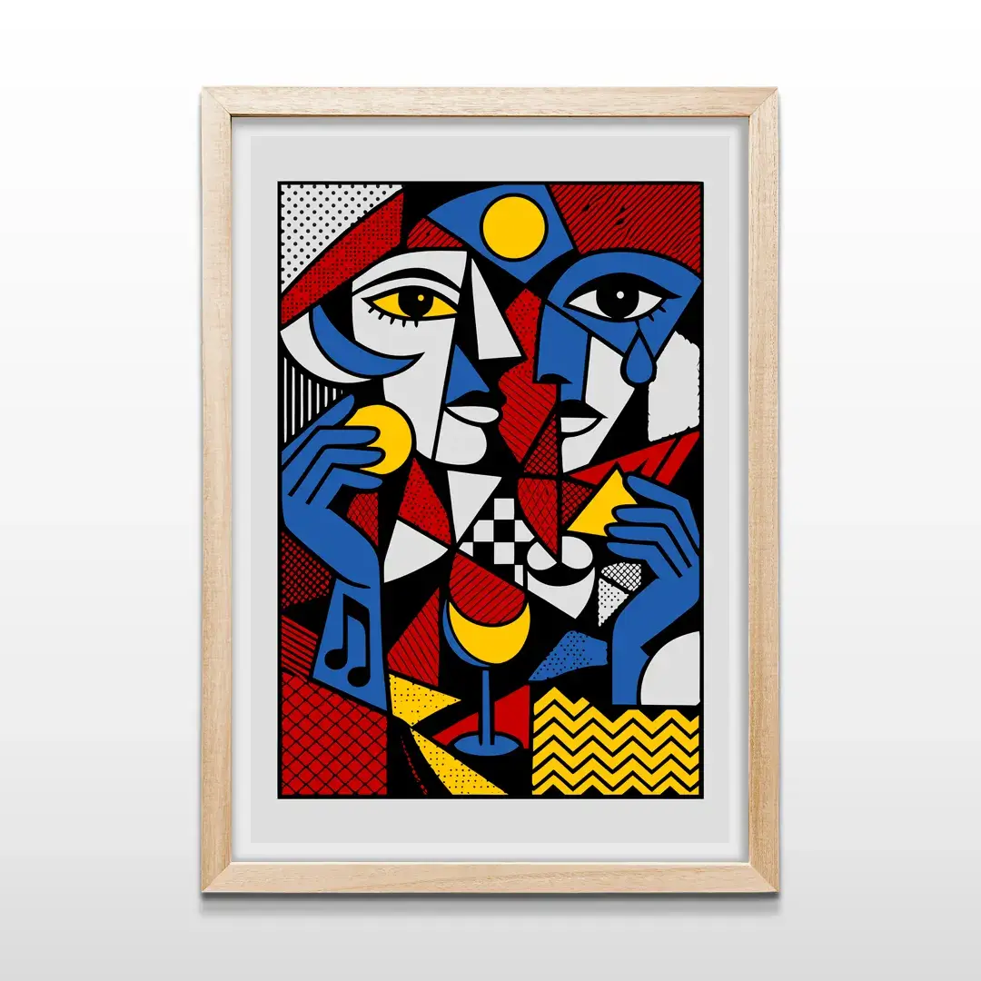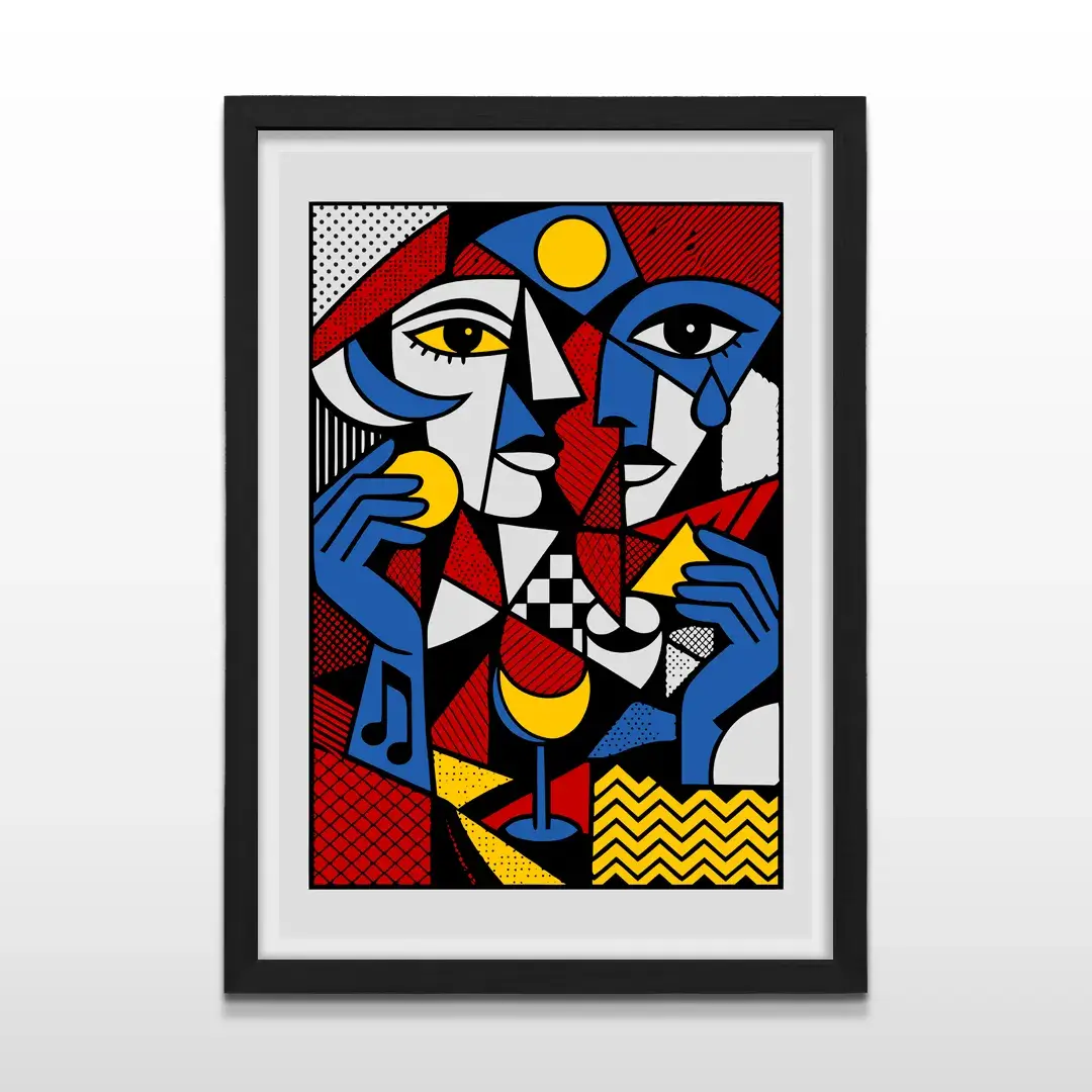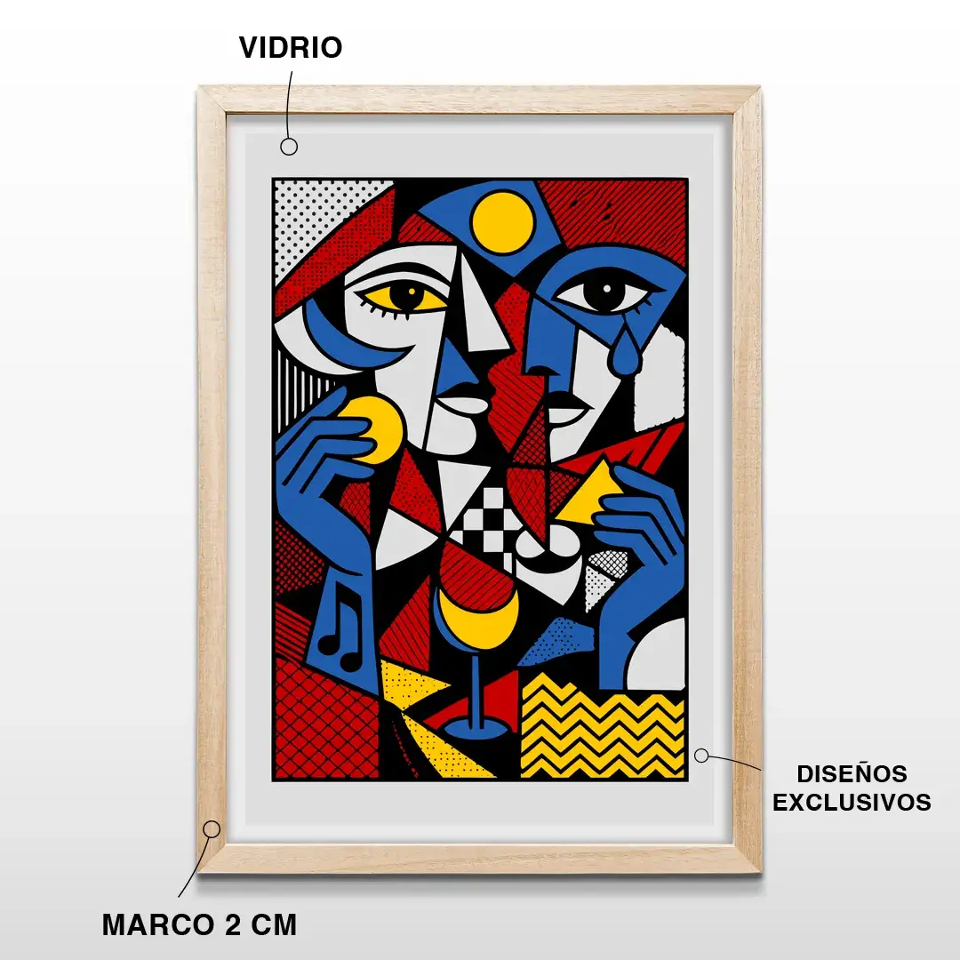 El cuadro decorativo Cubismo es una pieza de arte moderno de alto impacto visual inspirada en la vanguardia artística del siglo XX. La composición reúne rostros fragmentados, miradas intensas y referencias musicales, construidas a partir de formas geométricas, tramas puntillistas y líneas dinámicas que dialogan entre sí.