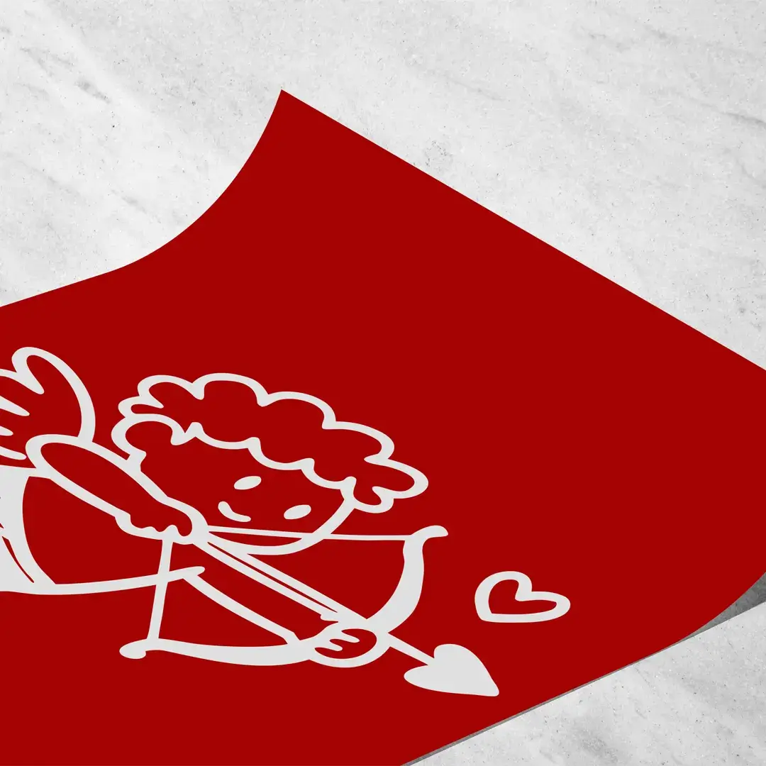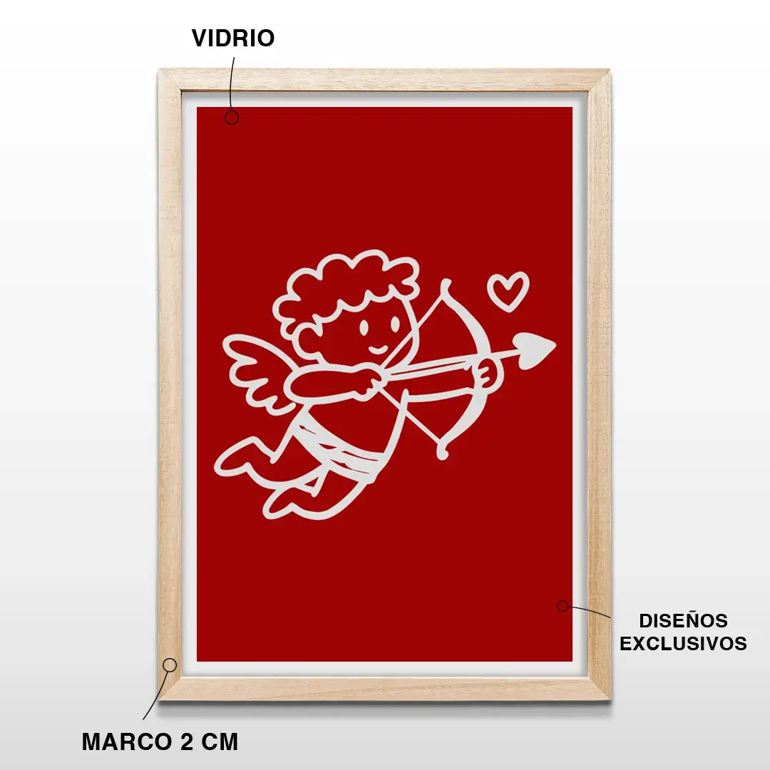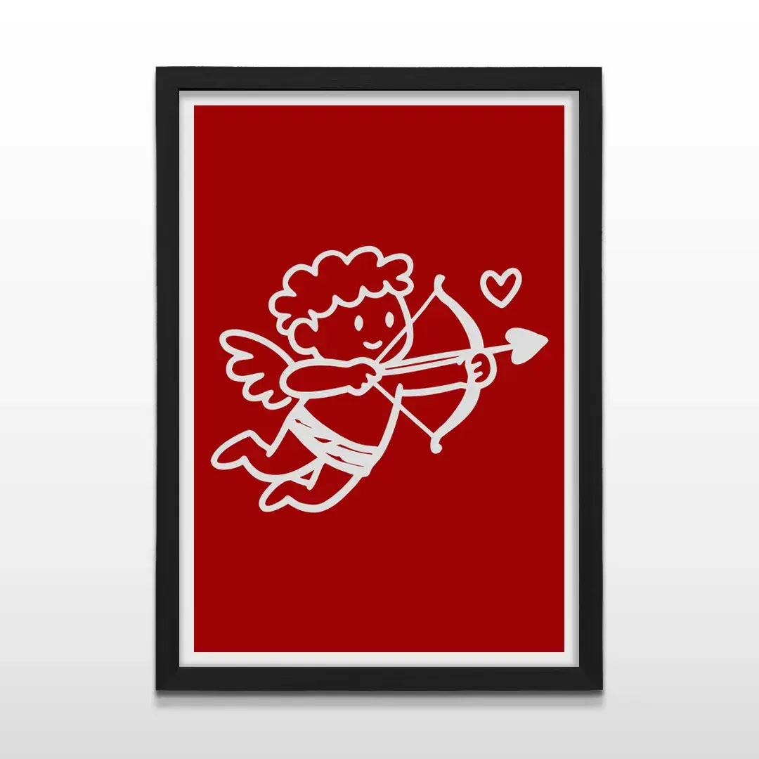 El cuadro decorativo Cupido transmite el simbolismo del amor desde una estética limpia y contemporánea. La composición presenta la silueta lineal de un pequeño ángel blanco en pleno gesto de disparar su flecha, resuelta con trazos simples y equilibrados que contrastan con un fondo rojo intenso. Esta combinación cromática potencia el mensaje emocional de la obra y genera un impacto visual inmediato sin perder elegancia.