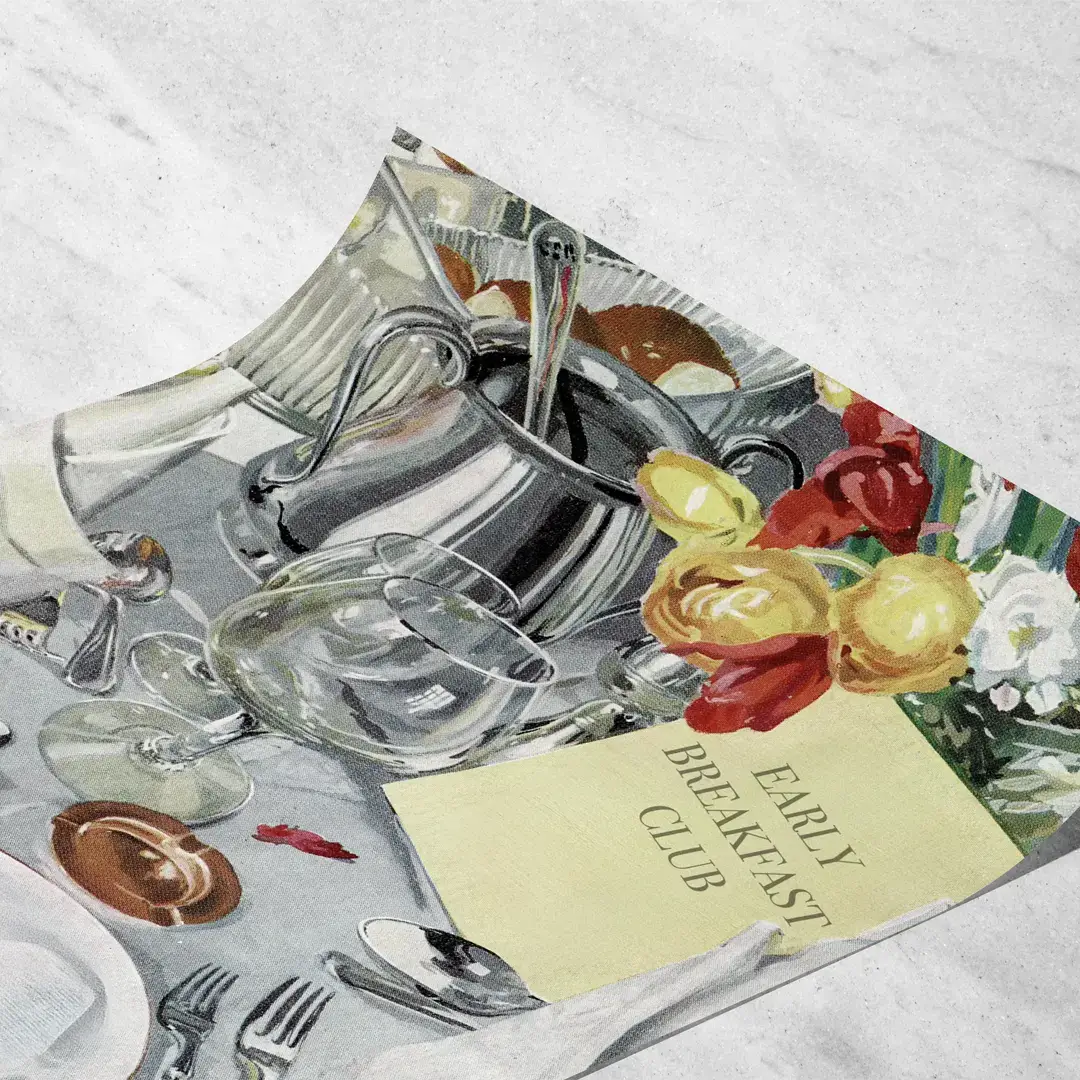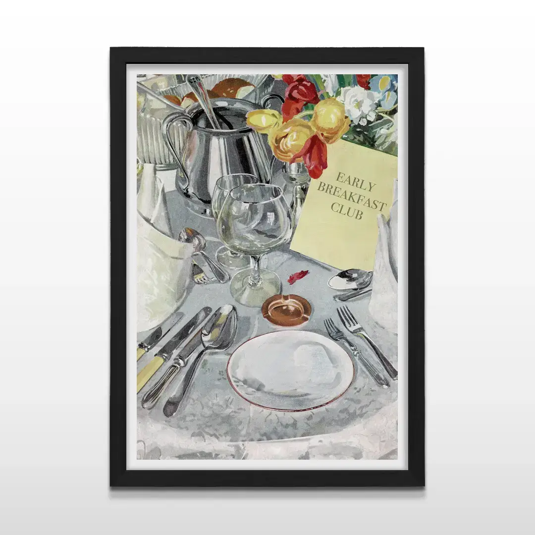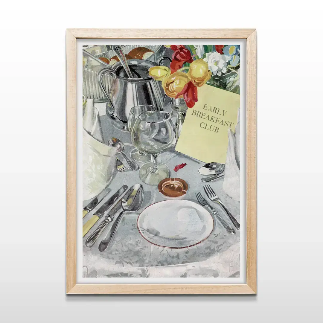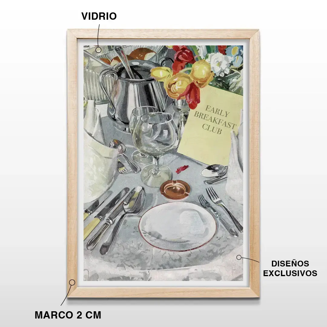 El cuadro decorativo Desayuno de Hotel captura el encanto silencioso de las mañanas sin apuro a través de una composición de acuarela impresionista que celebra el ritual del desayuno como experiencia sensorial. La escena muestra una mesa elegantemente dispuesta con cristalería delicada, cubiertos de plata, flores frescas y una tarjeta del Early Breakfast Club, todo envuelto en una paleta de tonos suaves que recrean la luz natural de un hotel boutique al amanecer.
