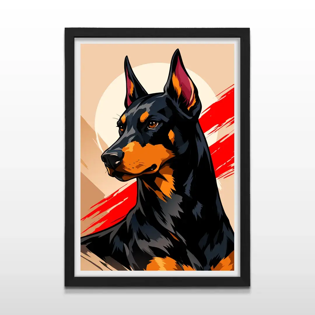 El cuadro decorativo Doberman es una pieza de arte contemporáneo que transmite carácter, control y presencia. El retrato estilizado de esta raza icónica se construye a partir de trazos firmes y expresivos que combinan negros profundos con tonos fuego, sobre un fondo cálido atravesado por pinceladas rojas que refuerzan su energía visual y su impacto inmediato.