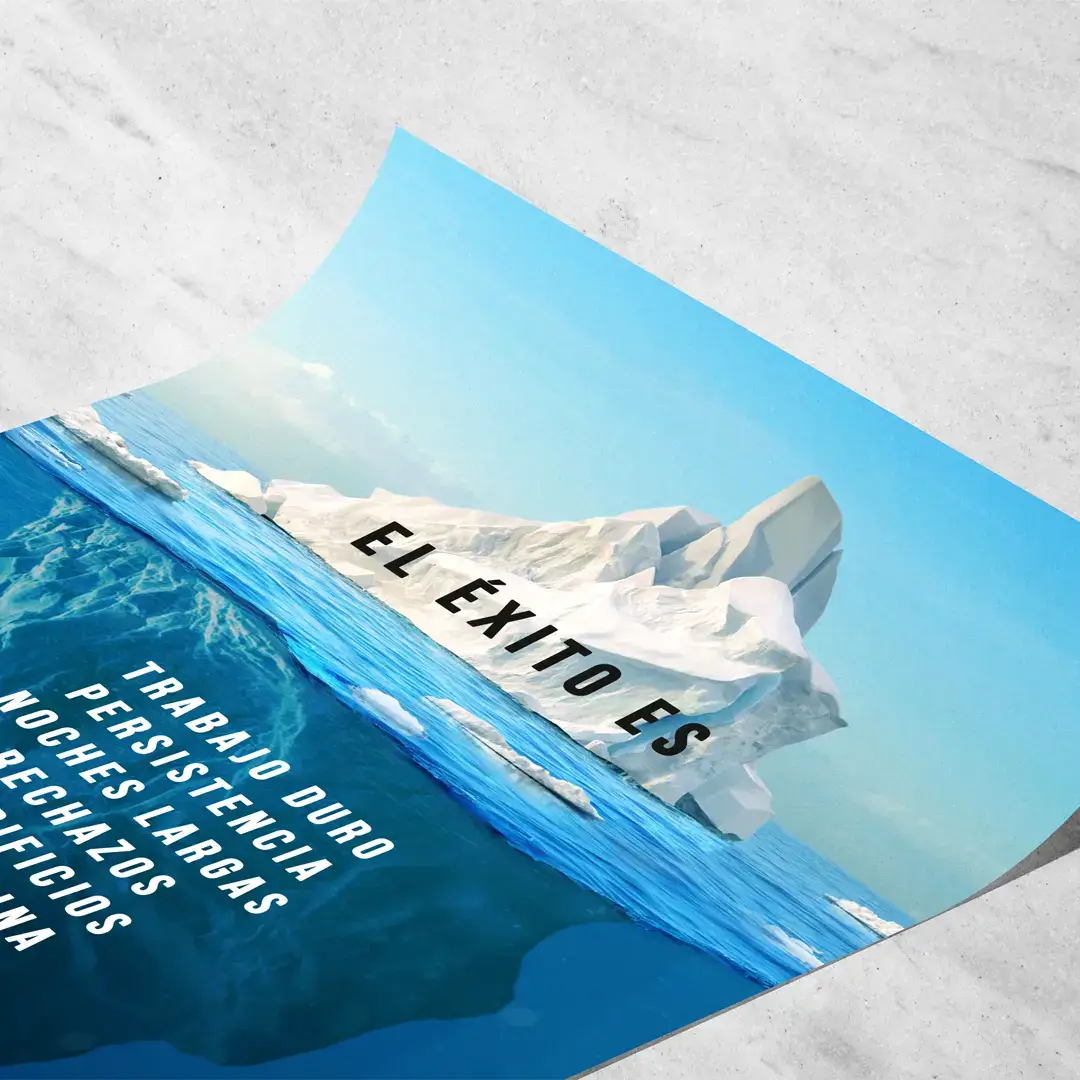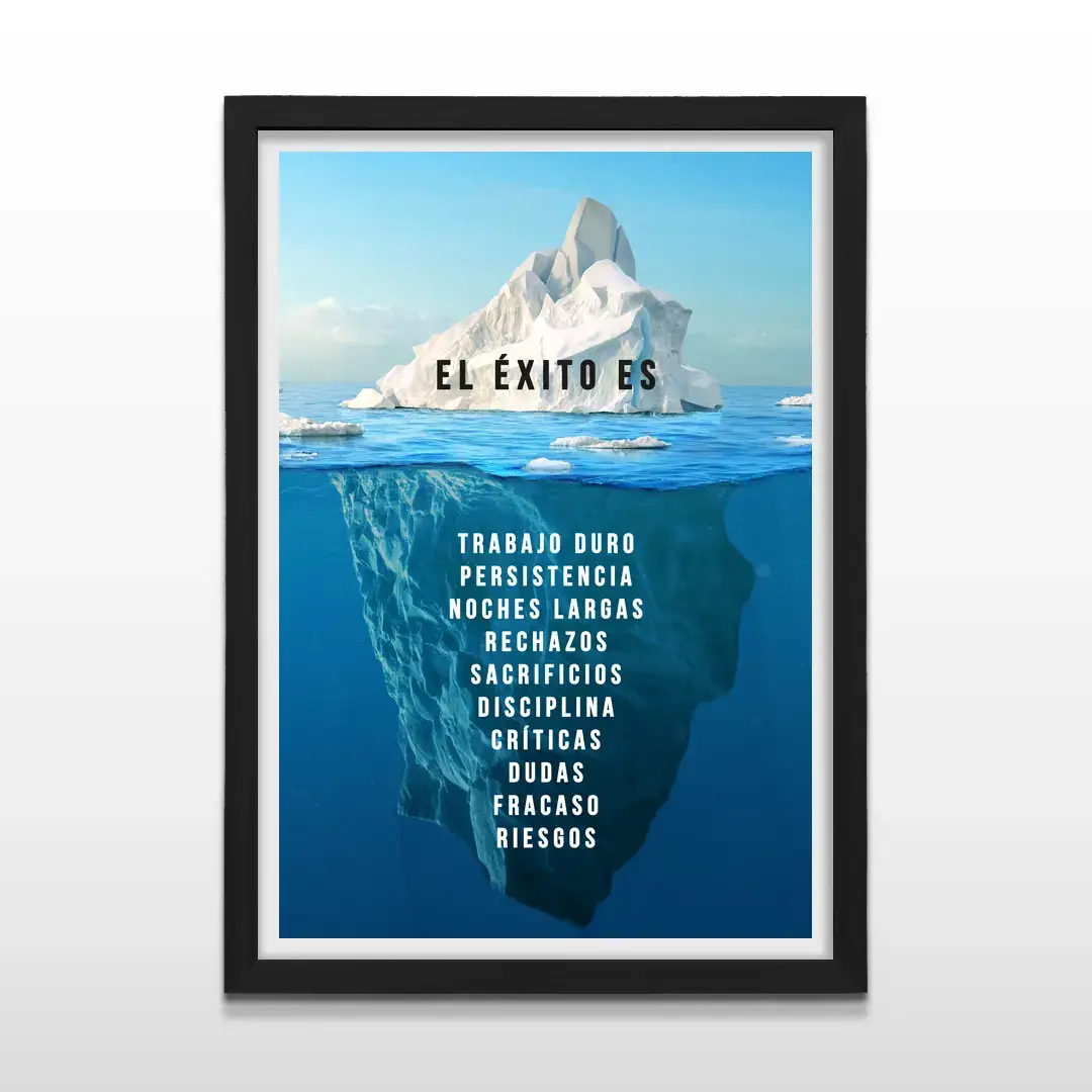 El cuadro decorativo Iceberg Éxito propone una lectura honesta y poderosa del camino hacia los logros reales mediante un diseño de realismo fotográfico conceptual que utiliza la metáfora del iceberg como eje narrativo. En la superficie, el mensaje “El éxito es” aparece limpio y directo, mientras que bajo el agua se despliega la verdadera estructura del progreso: trabajo constante, disciplina, errores, sacrificios, rechazos, dudas, riesgos y aprendizaje continuo, todo inmerso en un océano azul profundo de gran impacto visual.