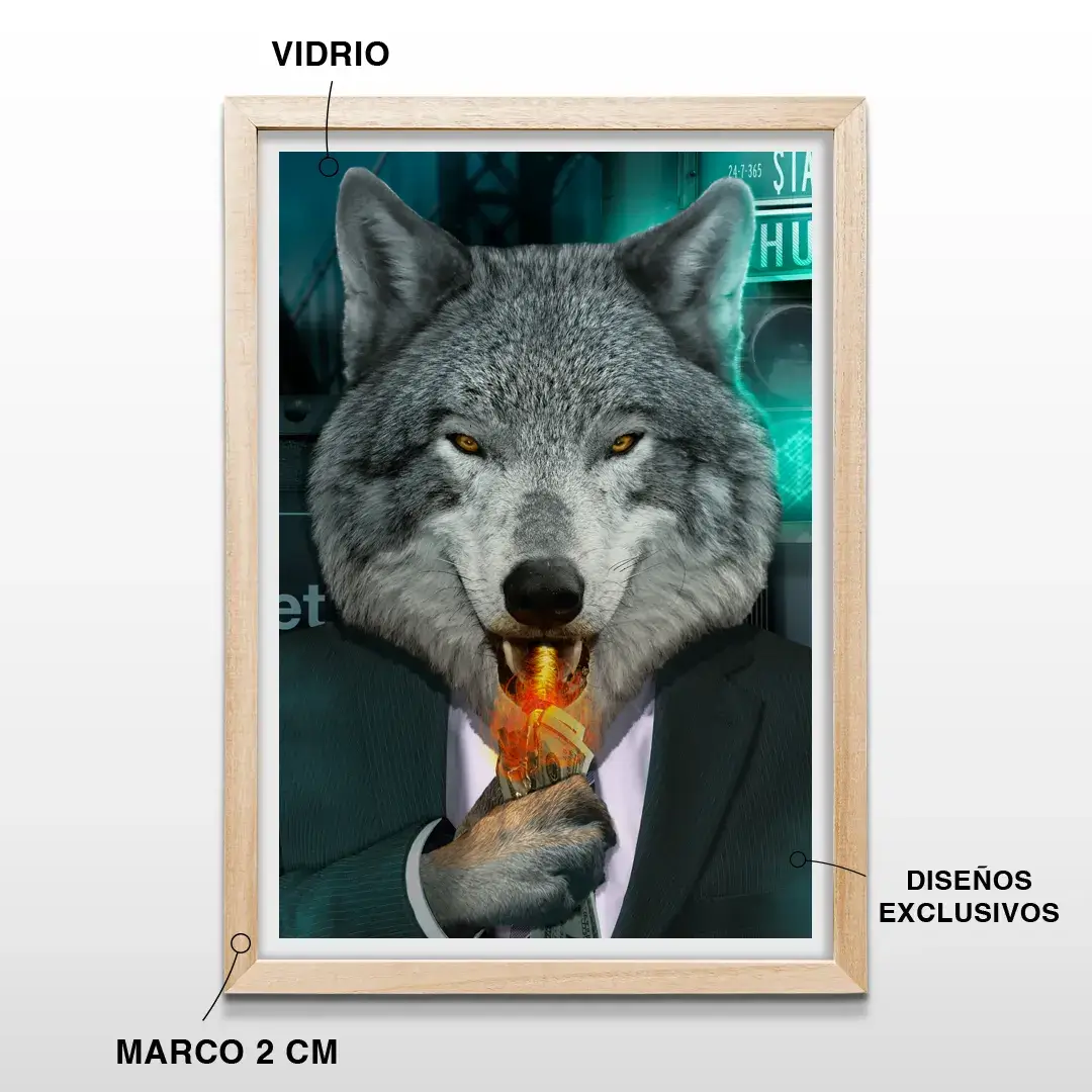 El cuadro decorativo El Lobista es una obra de arte digital contemporánea que retrata la lógica implacable del poder financiero desde una mirada simbólica y provocadora. La composición presenta a un lobo de expresión fría y calculadora, vestido con un traje ejecutivo de líneas precisas, sosteniendo un fajo de billetes en llamas que sintetiza riesgo, ambición y control en el corazón del sistema económico.