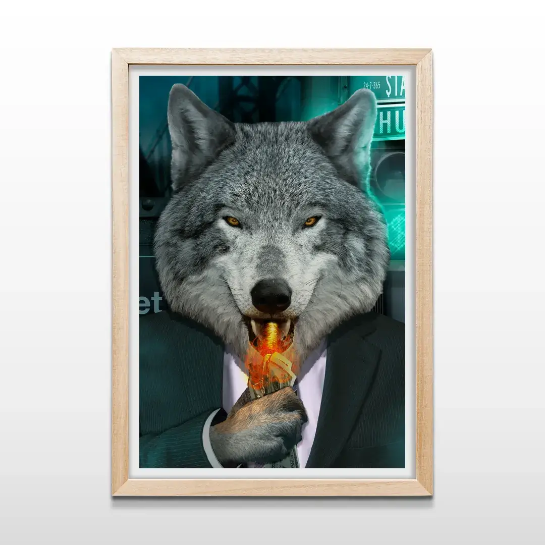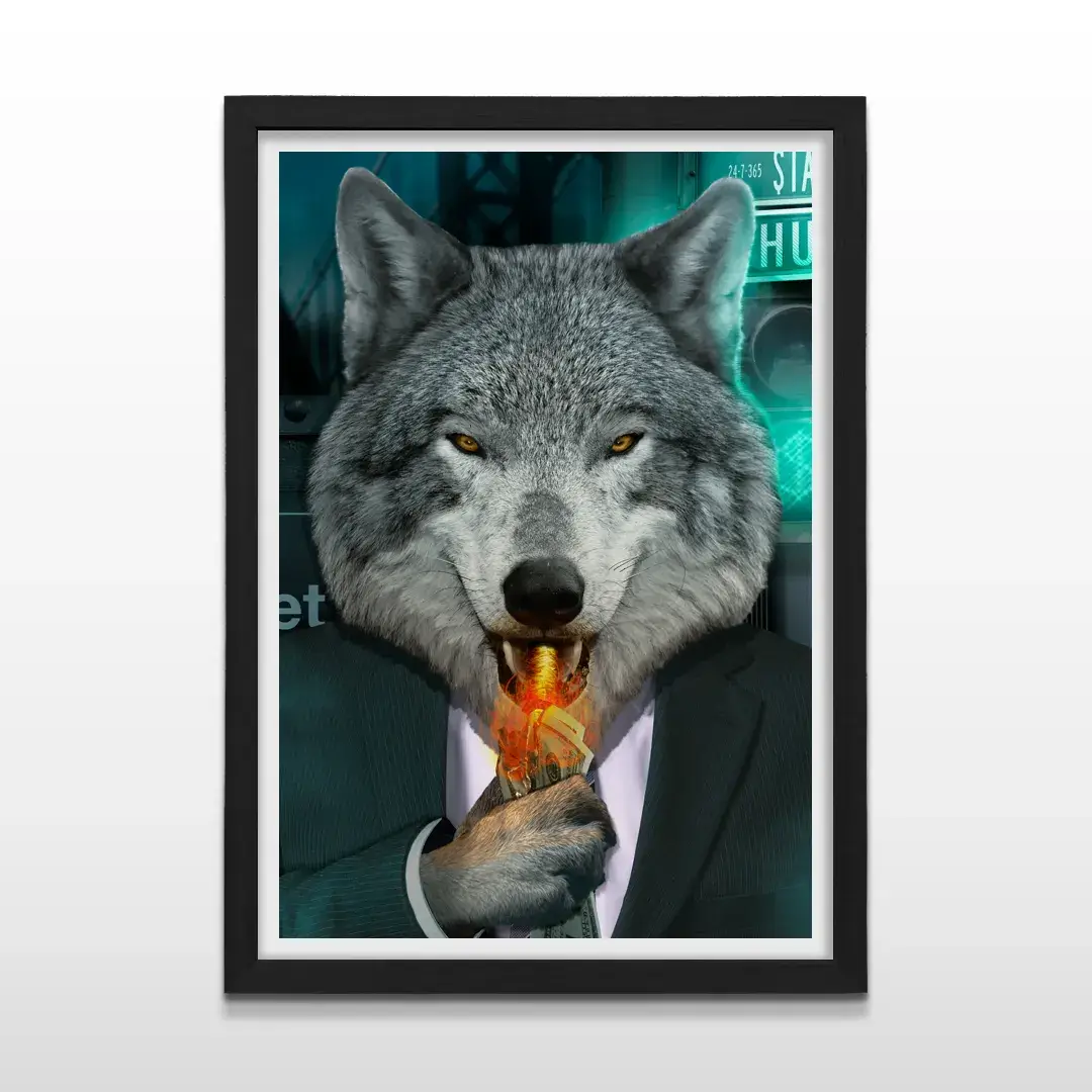 La escena combina realismo animal y estética corporativa para construir una metáfora visual del instinto dominante en los negocios, donde la inteligencia estratégica y la determinación marcan la diferencia. El contraste entre el fuego, el dinero y la figura del lobo refuerza el carácter agresivo y decidido de la pieza, posicionándola como un cuadro moderno de finanzas con fuerte impacto conceptual.