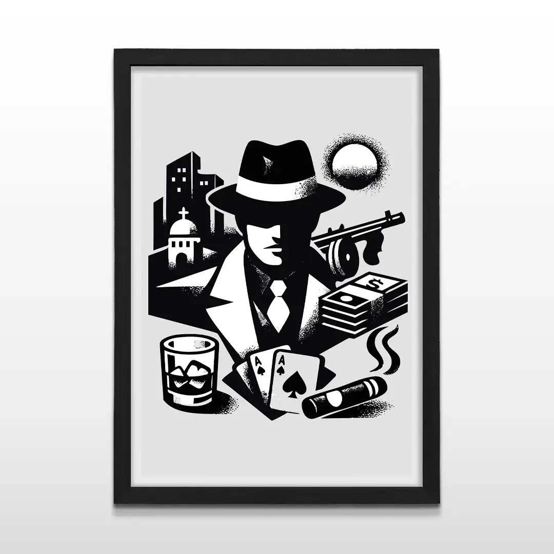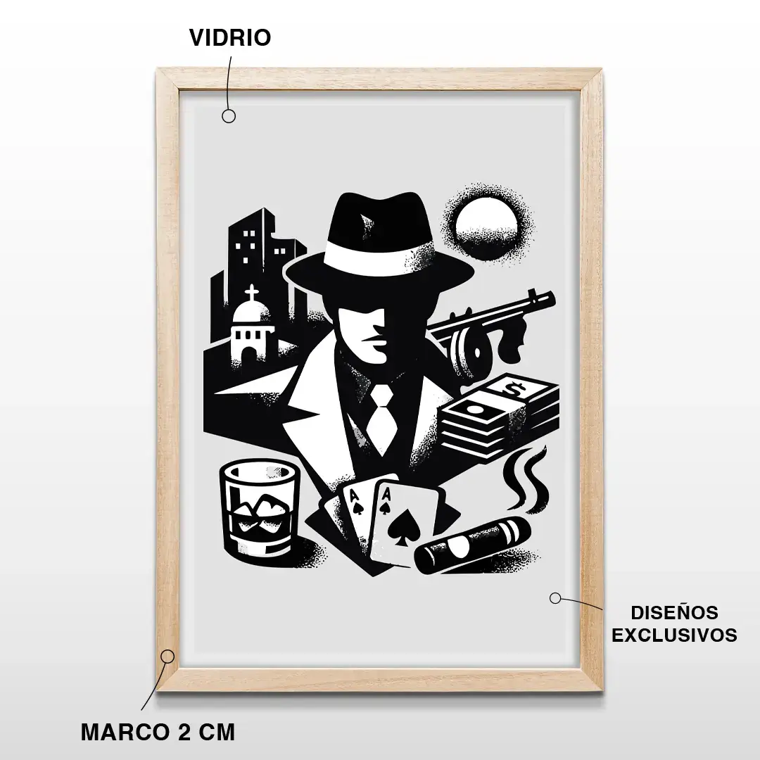 El cuadro decorativo El Patrón es una obra de arte gráfico en blanco y negro que representa el dominio, la estrategia y el control absoluto. La composición presenta la silueta de un líder en primer plano, rodeado de íconos clásicos del poder como fajos de dinero, cartas de póker, armas de época y un habano encendido, todo enmarcado por una ciudad nocturna que refuerza una atmósfera de autoridad y decisión. El contraste monocromático potencia el dramatismo visual y convierte la escena en un símbolo de jerarquía y ambición.
