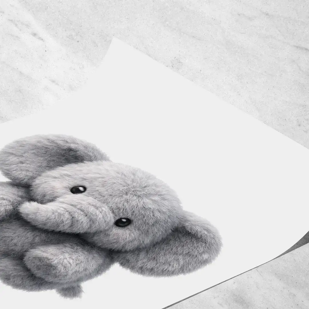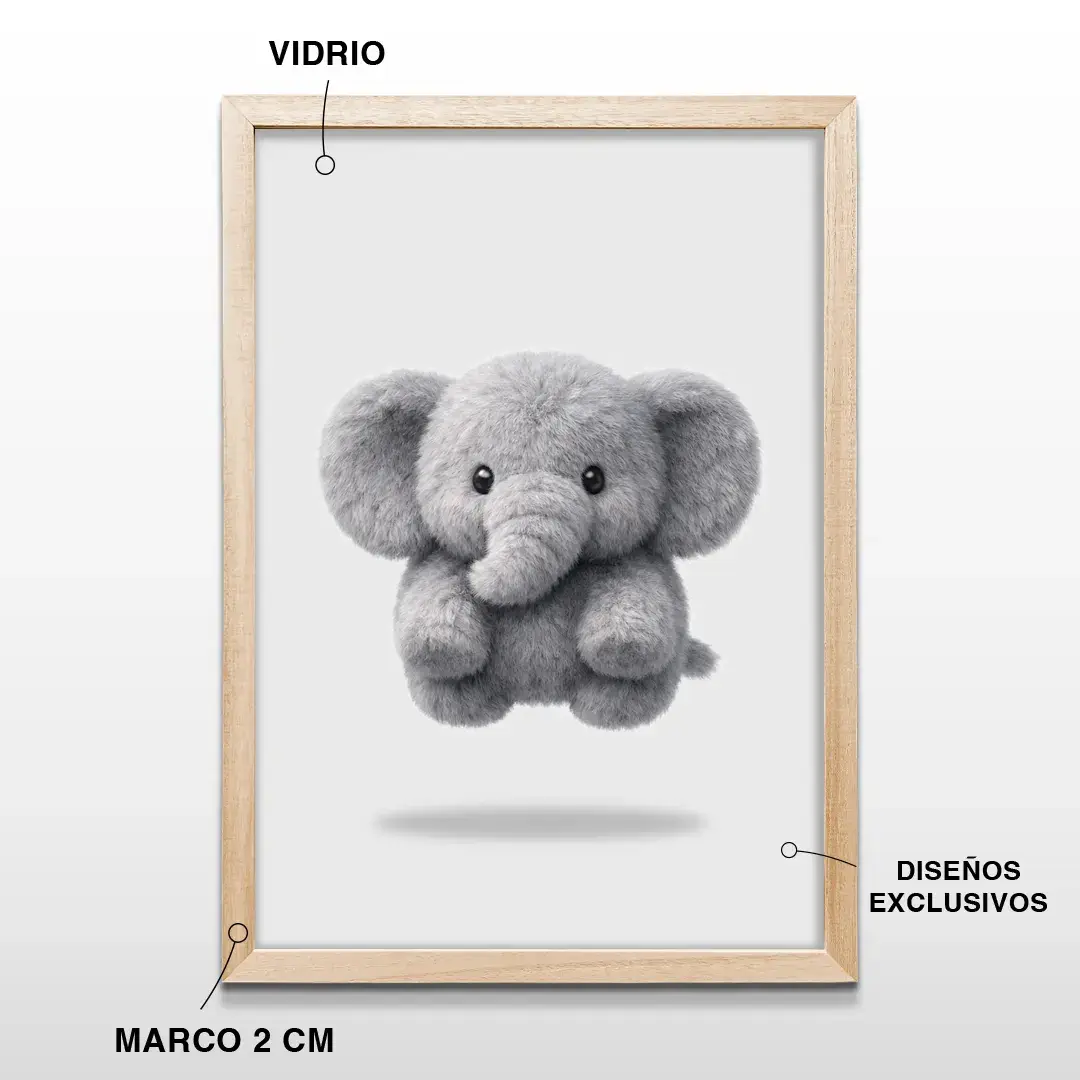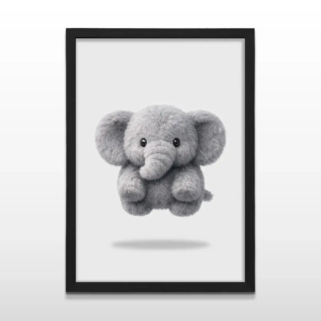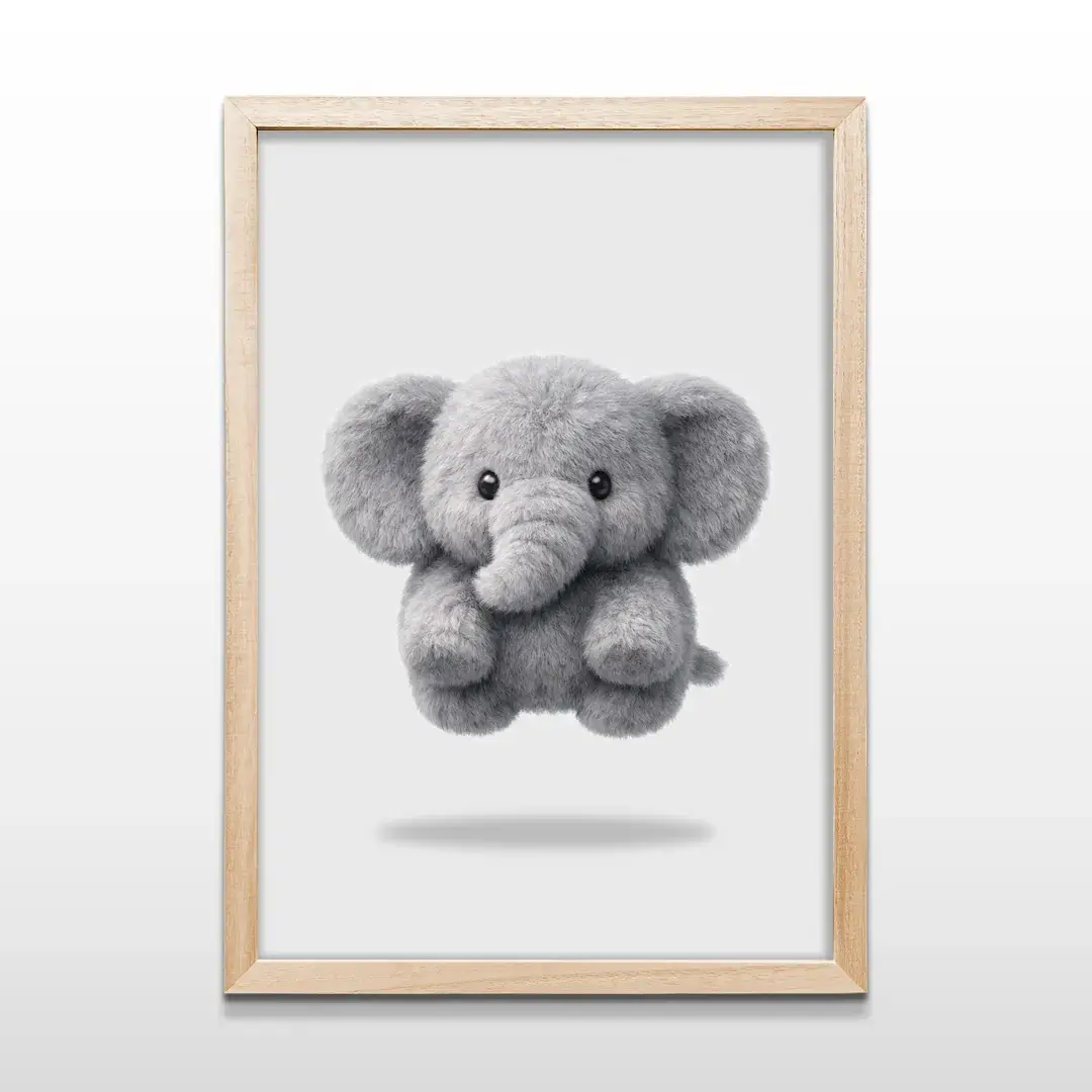 El cuadro decorativo Elefante de Peluche transmite una sensación inmediata de ternura y protección a través de una ilustración minimalista de espíritu infantil. La imagen presenta un elefantito de apariencia suave y mullida, con volumen delicado y textura visual acolchada, suspendido sobre un fondo blanco limpio que refuerza la calma, la luz y la sensación de espacio.