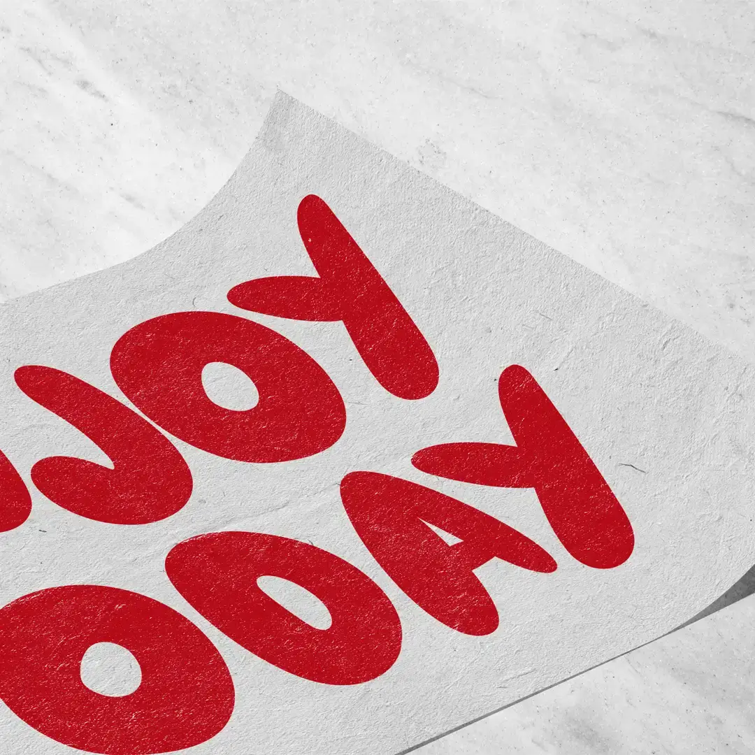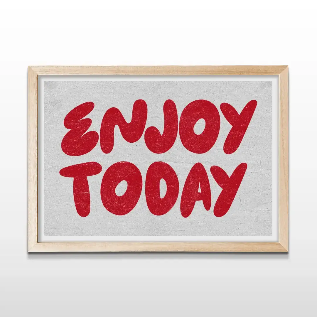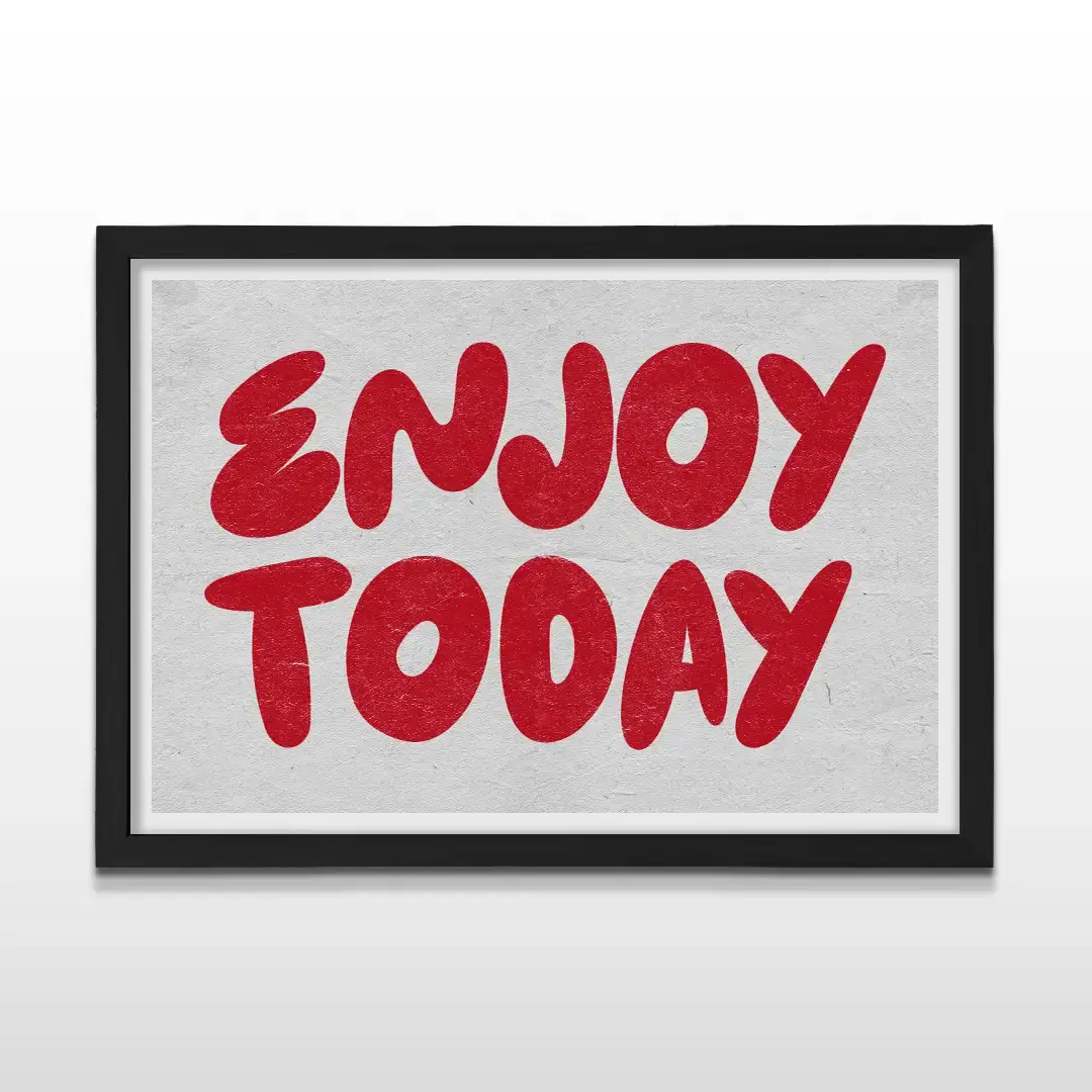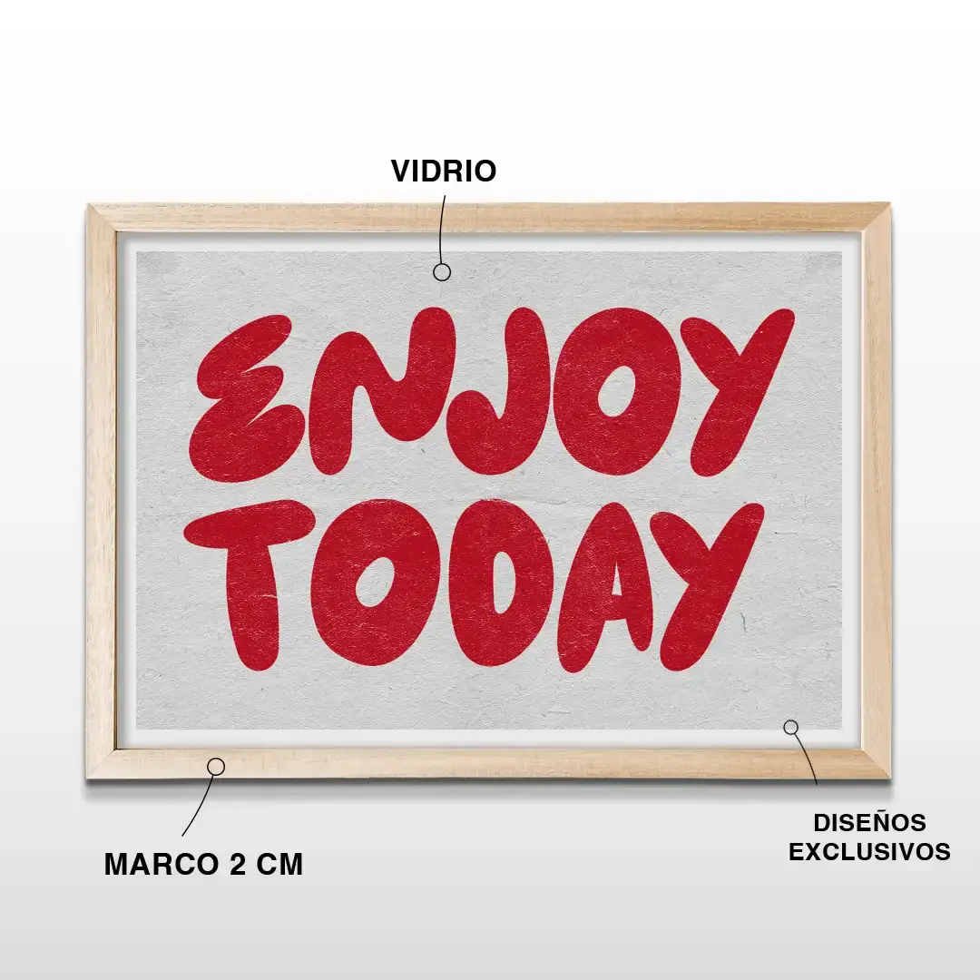 El cuadro decorativo Enjoy Today propone una composición tipográfica cálida y contemporánea donde la frase se convierte en el centro visual de la obra. La caligrafía fluida en negro profundo se destaca sobre un fondo de textura rústica en tonos ocre y arena, generando una sensación de luz suave similar a la de un atardecer tranquilo.
